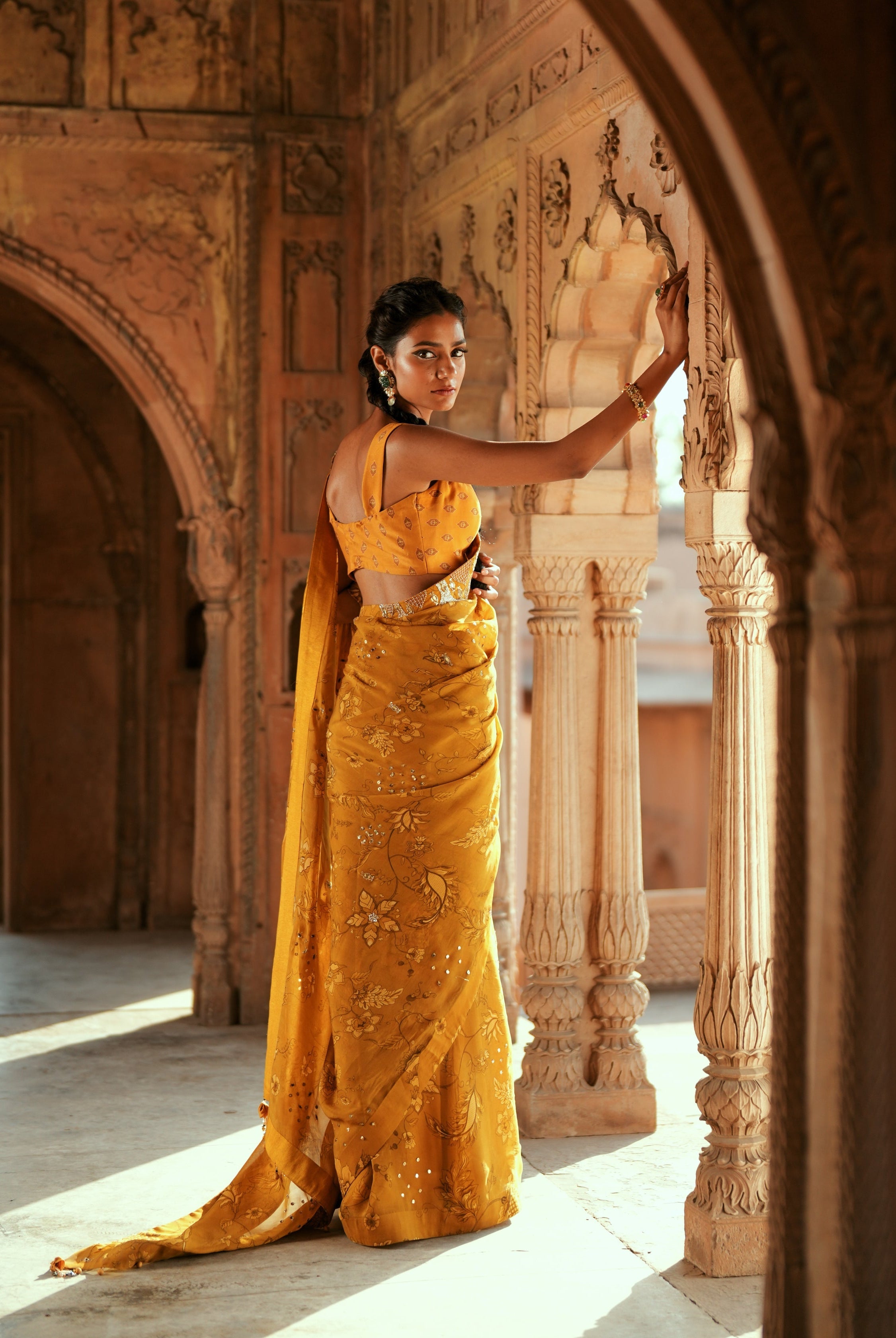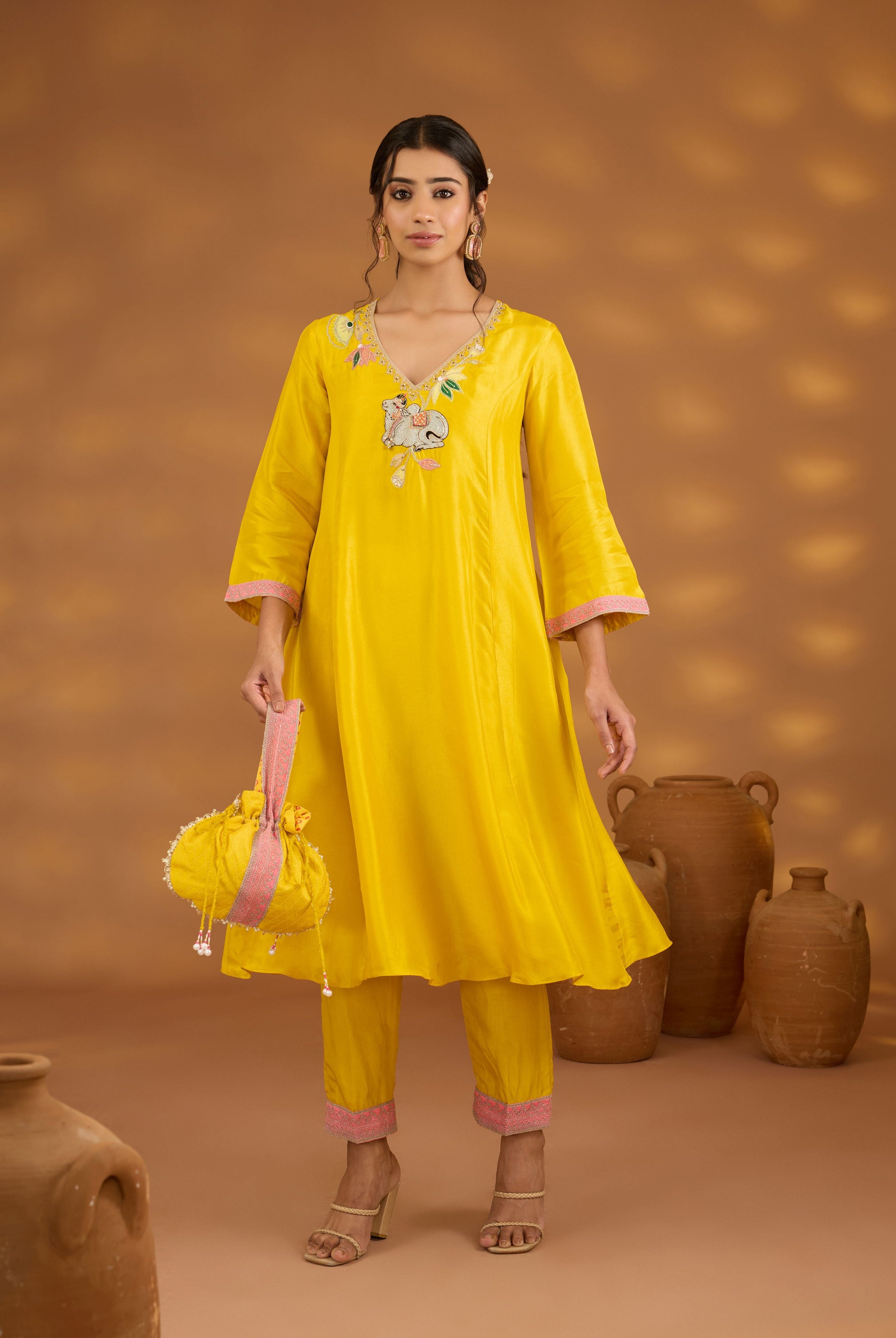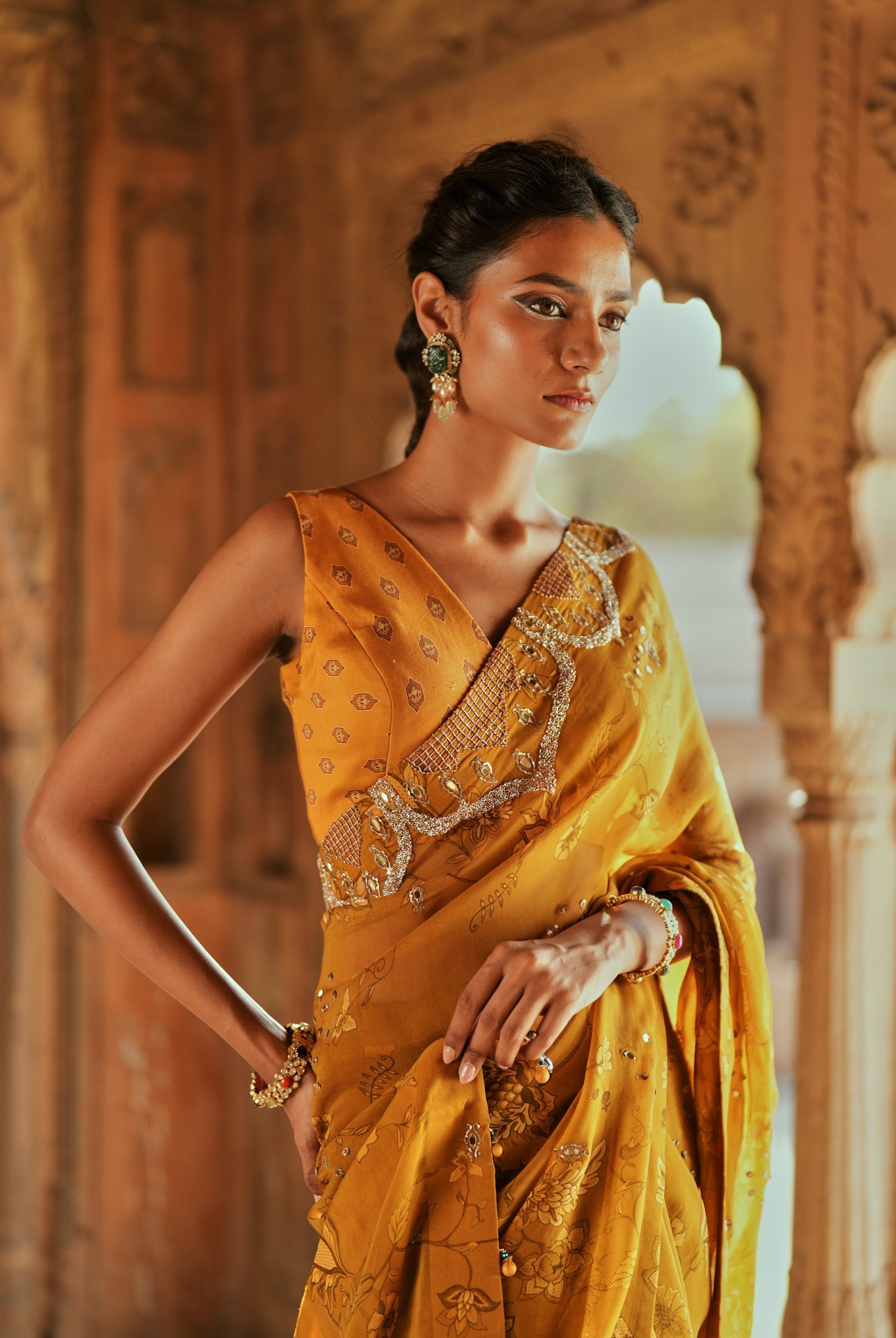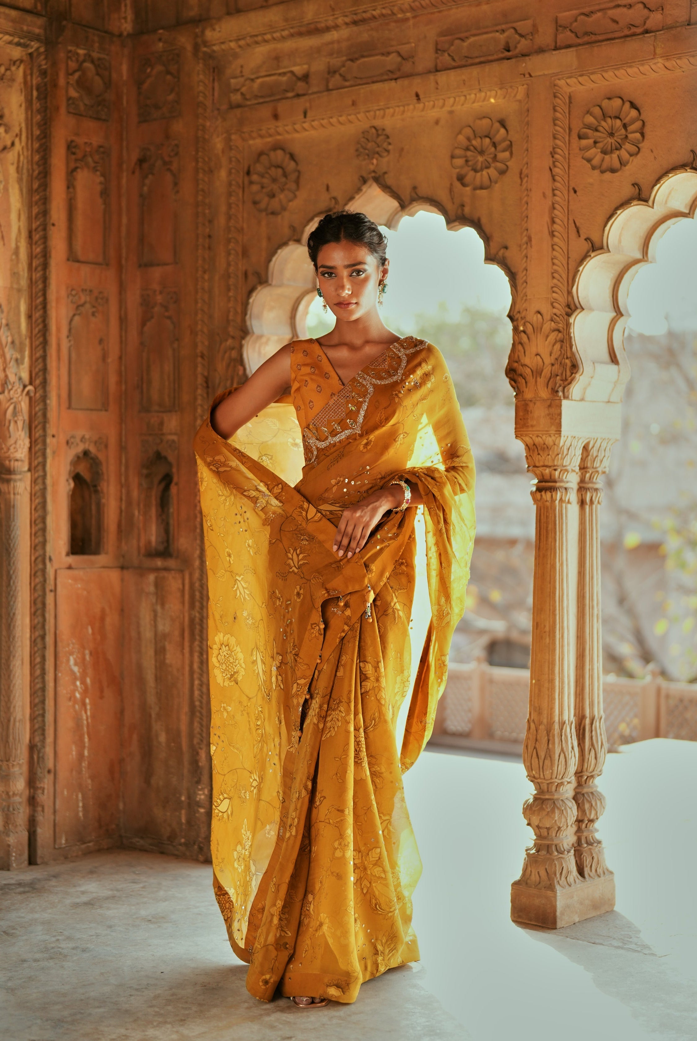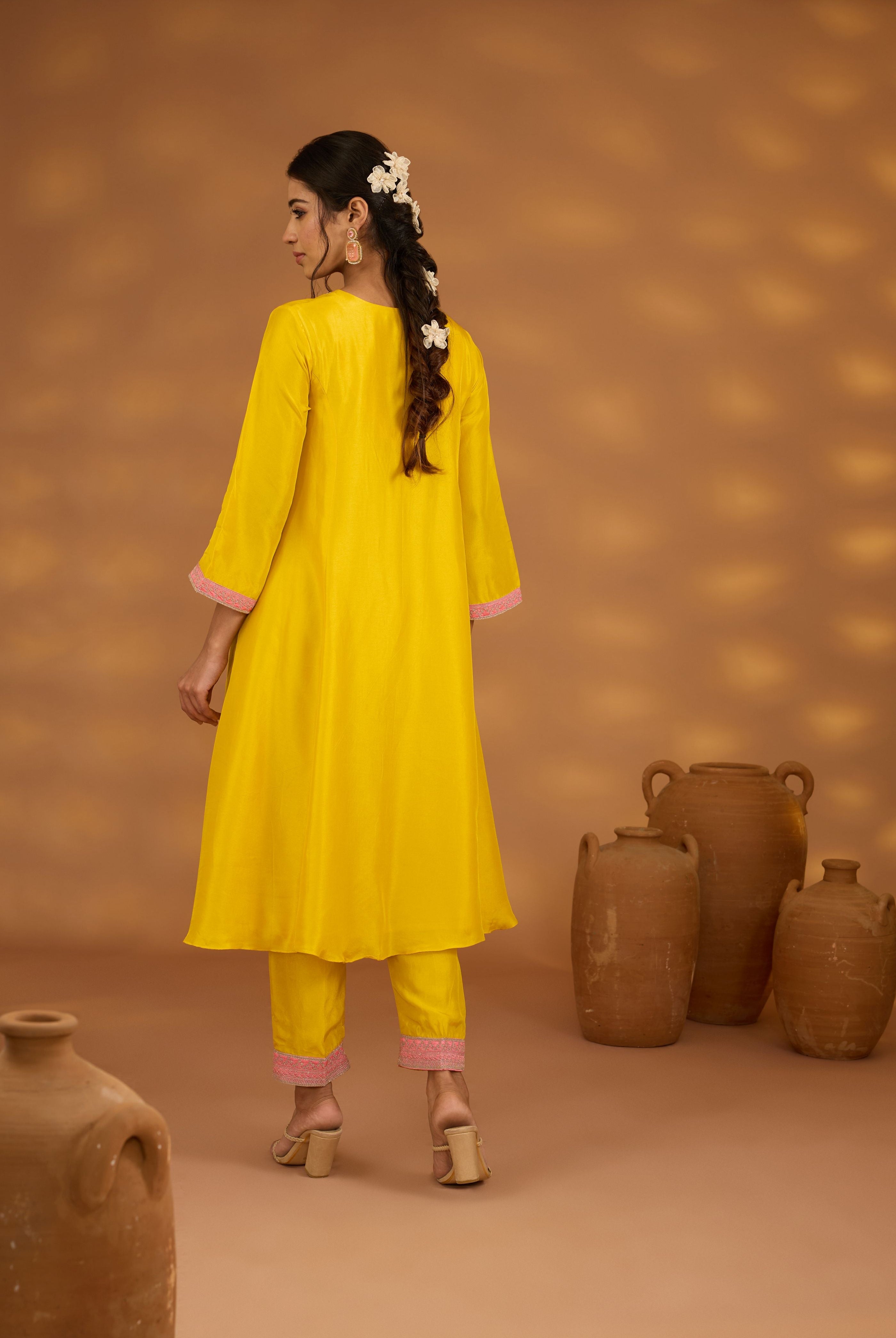 Sakshi Sindwani in Yellow printed embroidered saree set