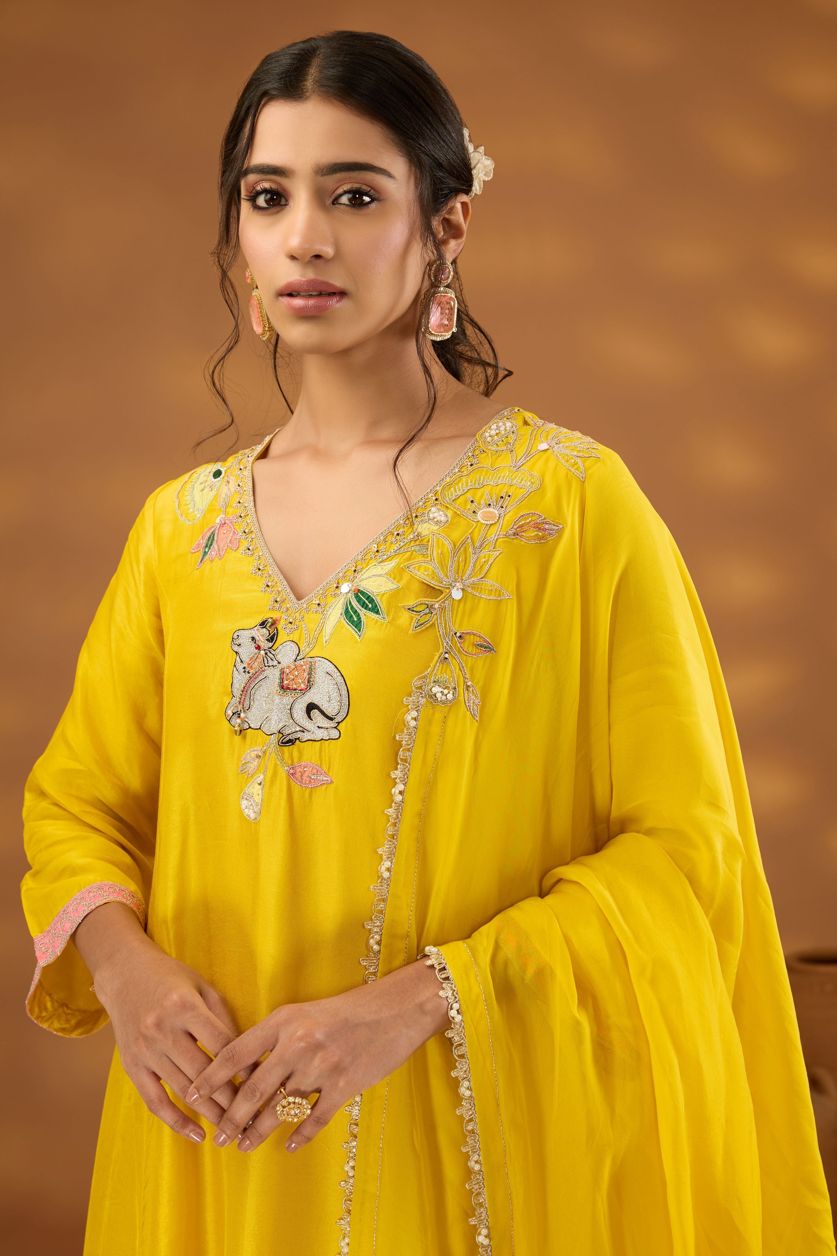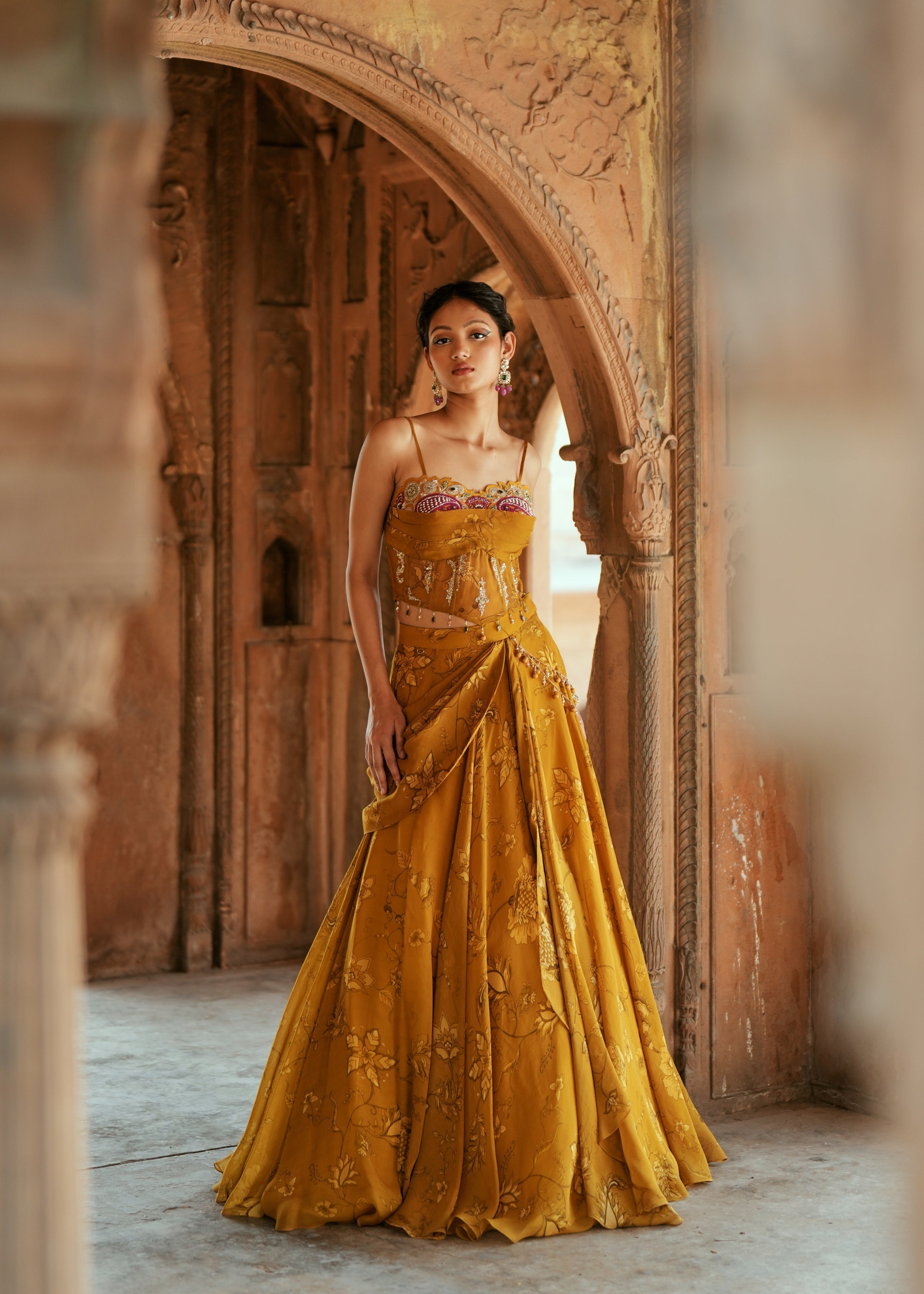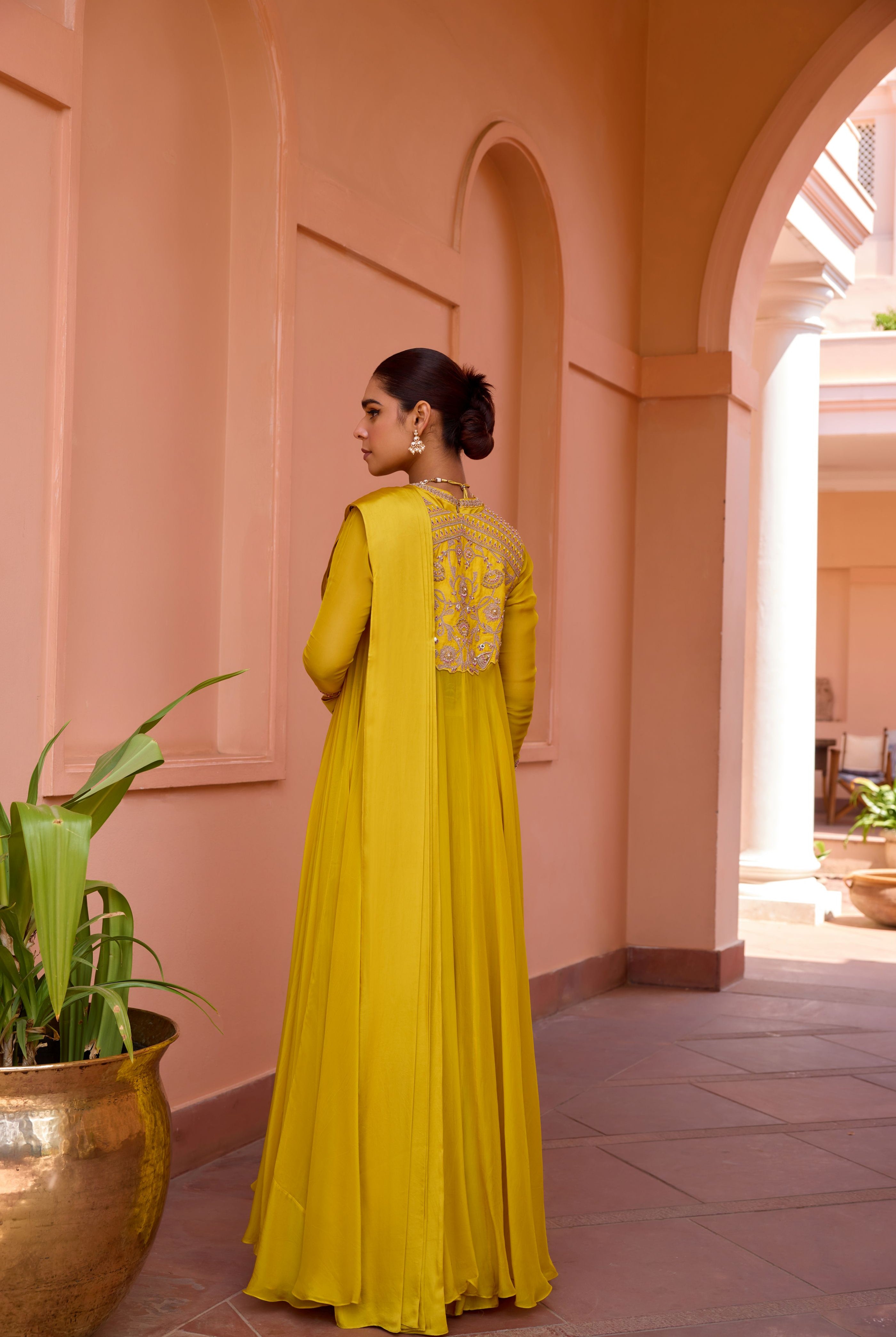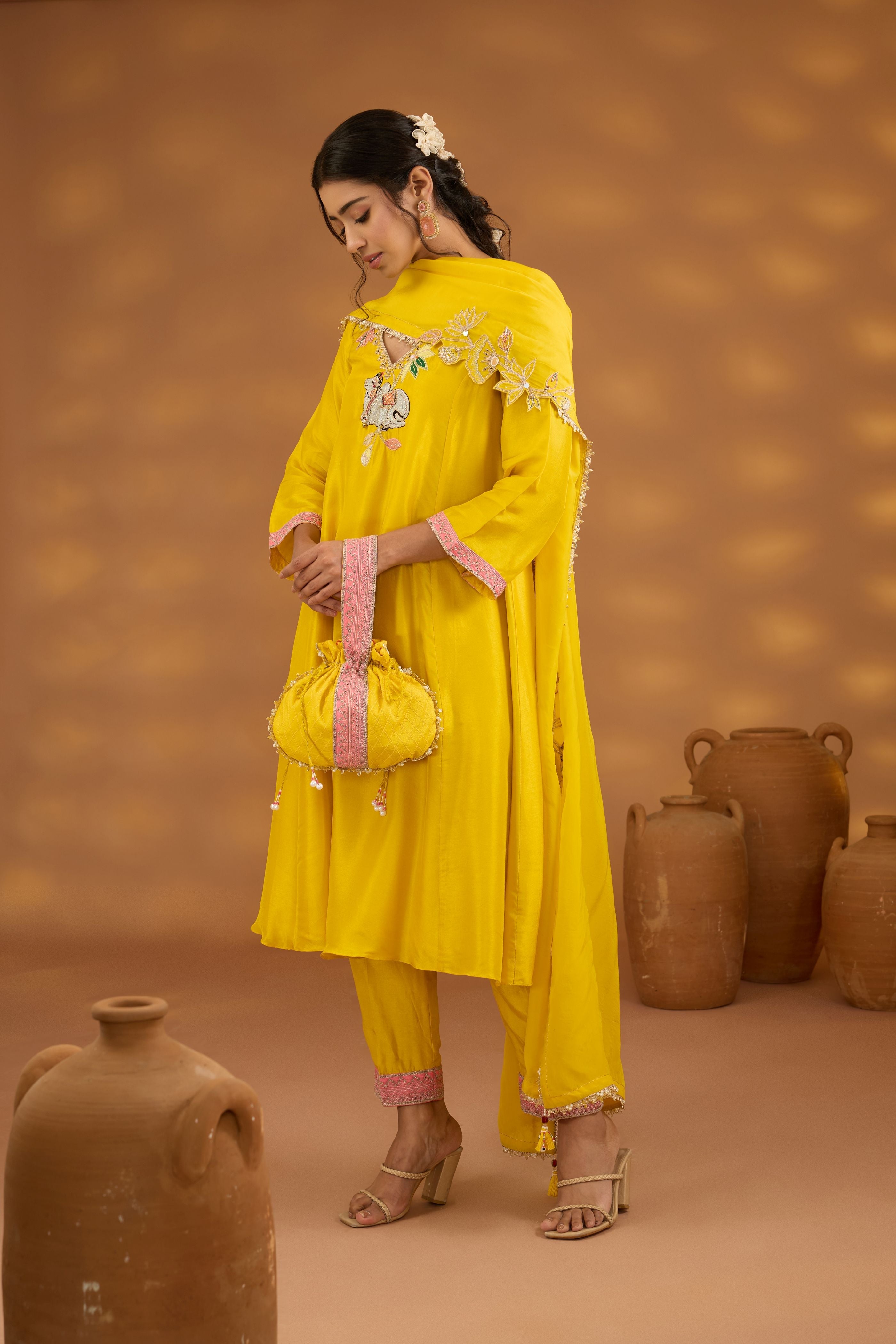 Sakshi Sindwani in Yellow printed embroidered saree set