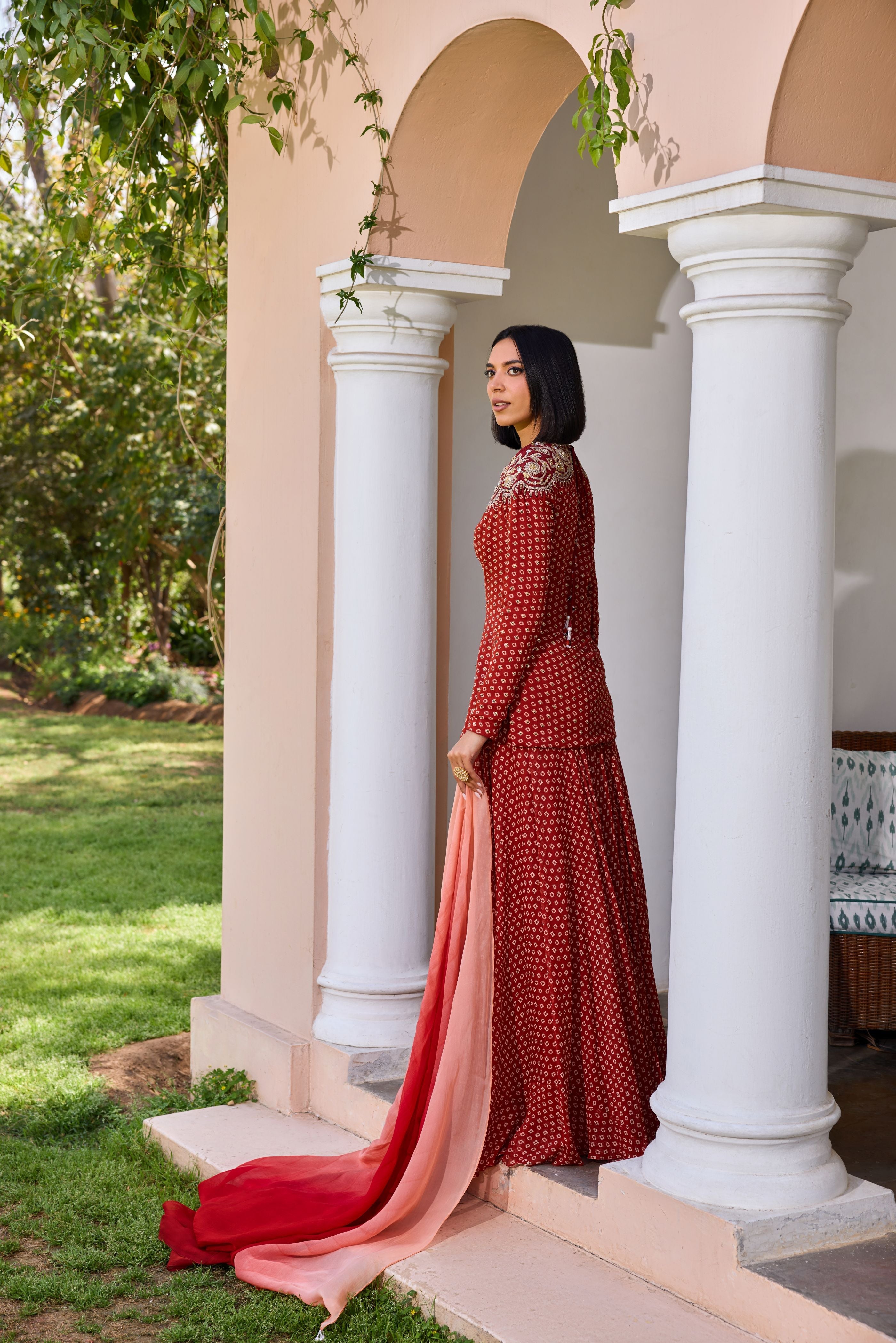 Nikki Tamboli in Pink printed and embroidered sharara set with cape