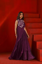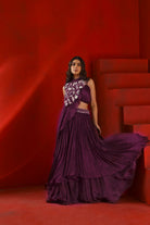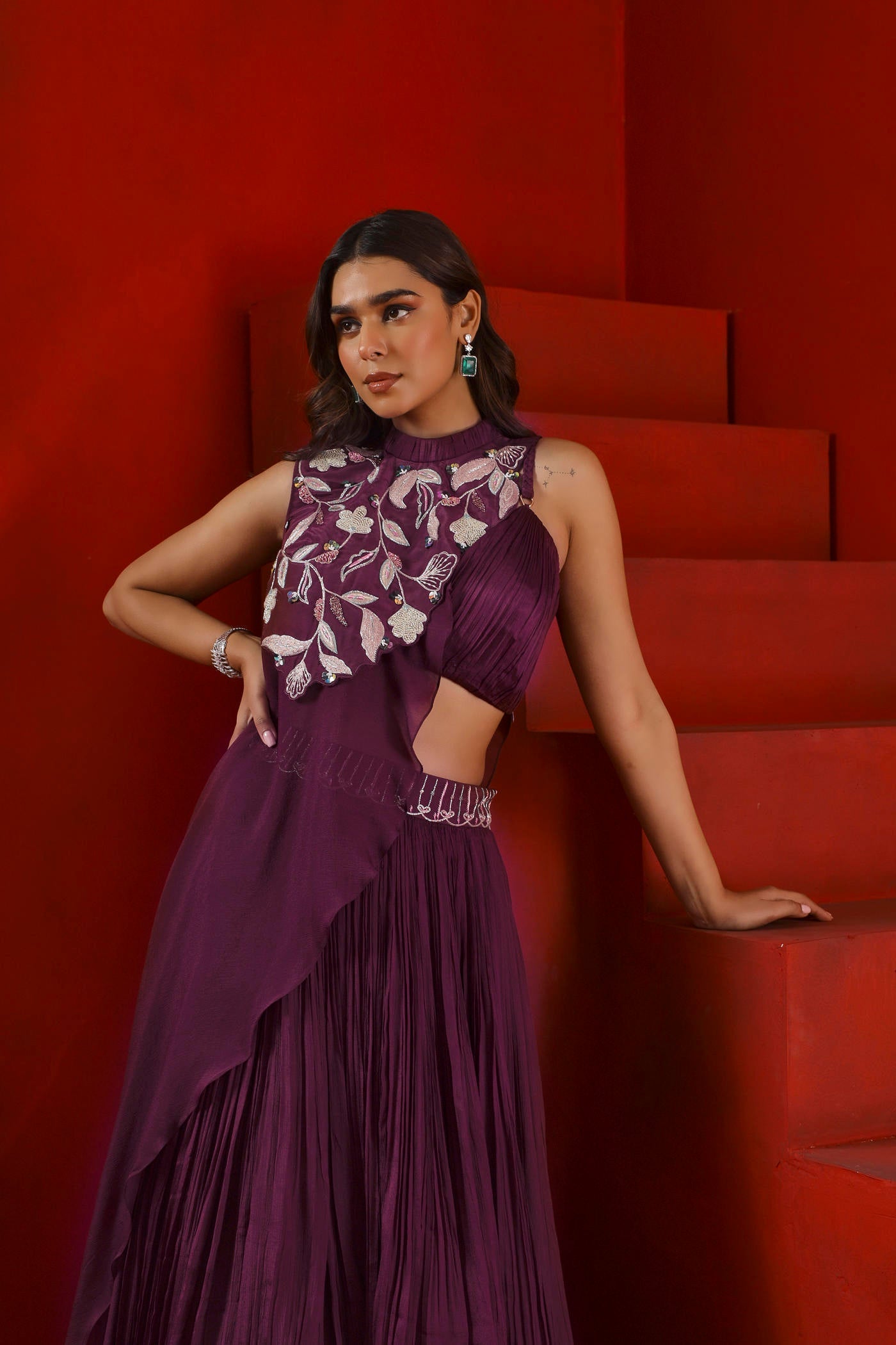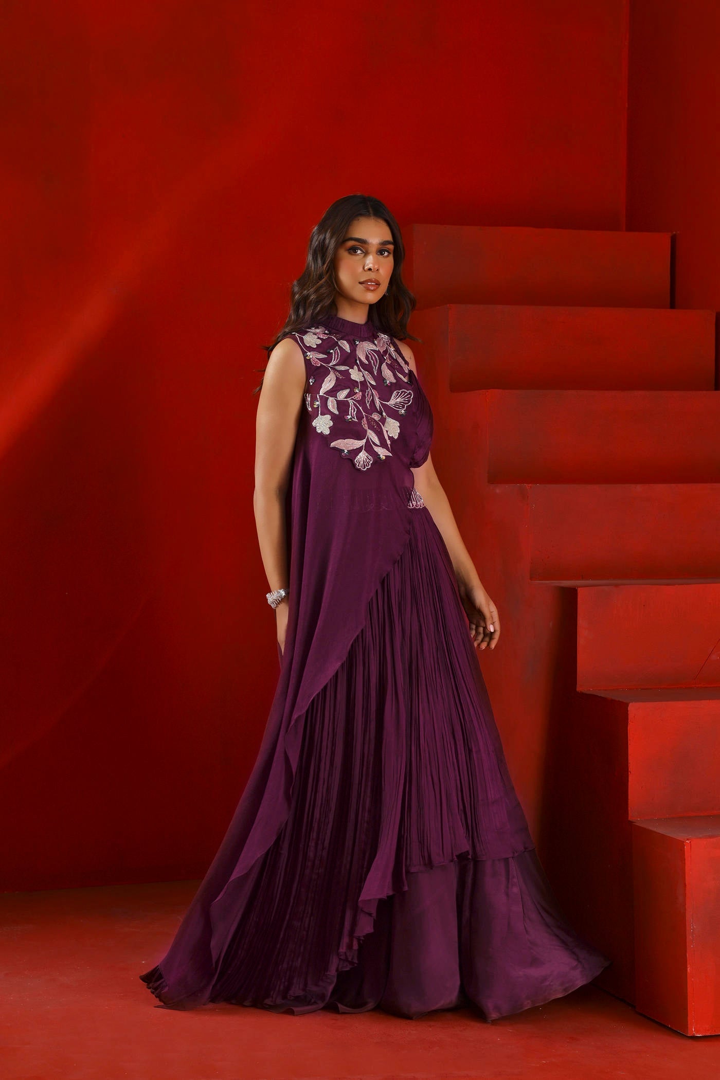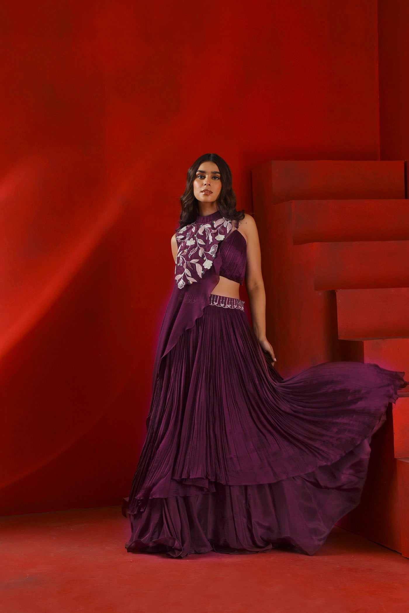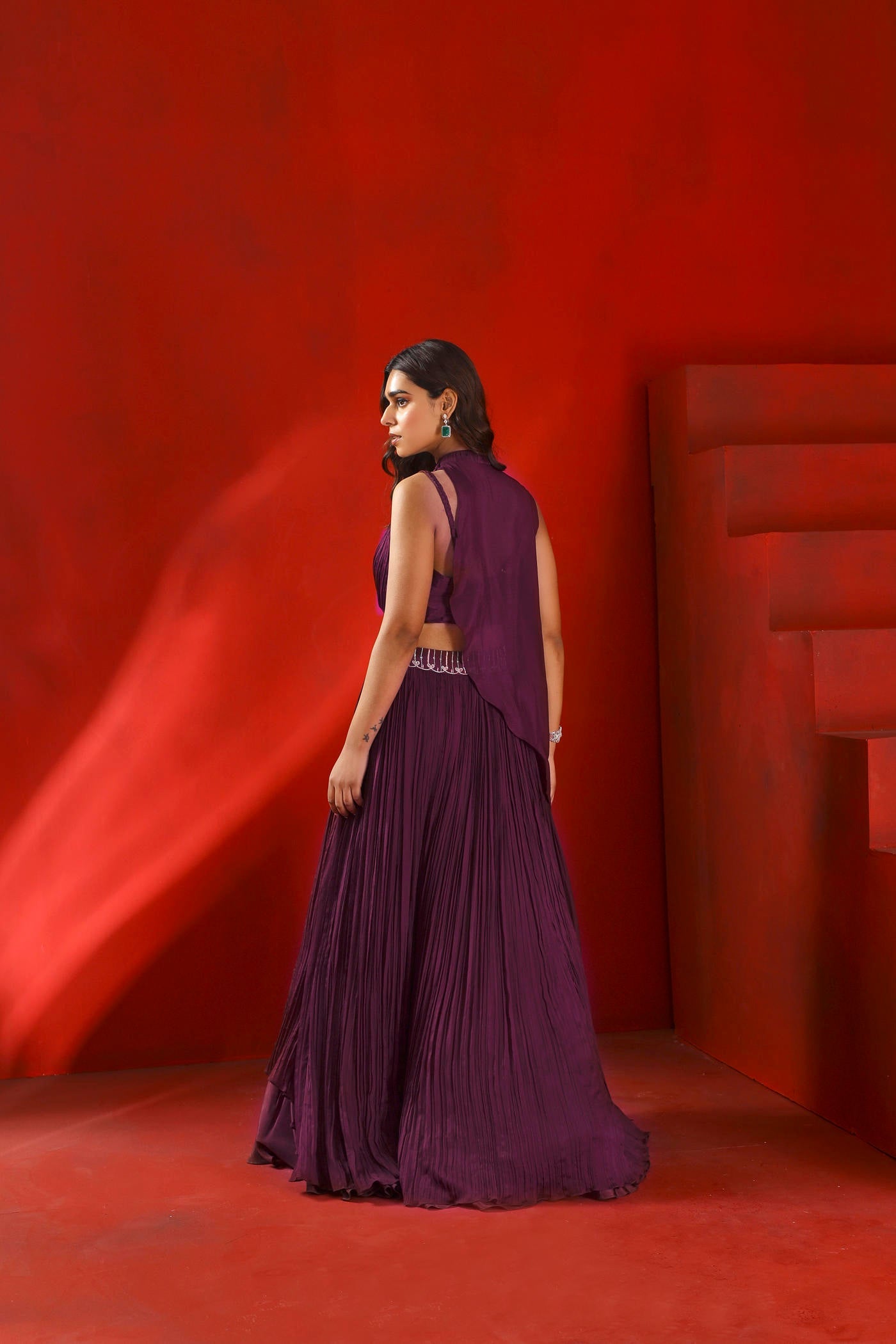 Featured here is a mahogany wine-ruched and layered lehenga made in chiffon and silk. It is paired with a ruched bustier and a 3D embellished drape cape made in chiffon.