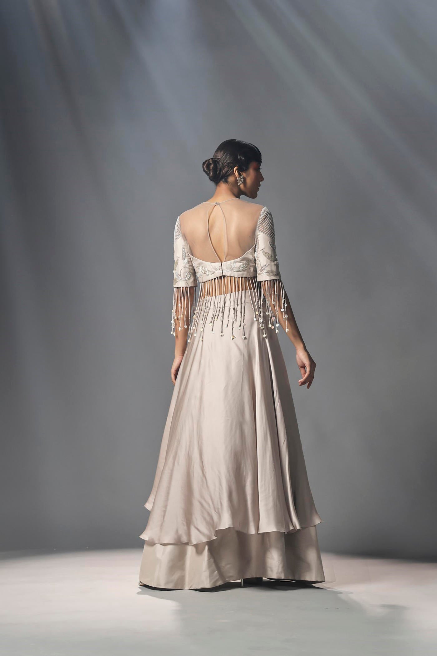 Featured here is ecru double layered organza wrap around skirt with high low hem. It is paired with an embroidered crop top and embellished cord tassels