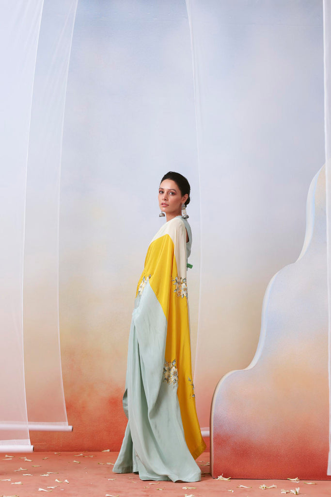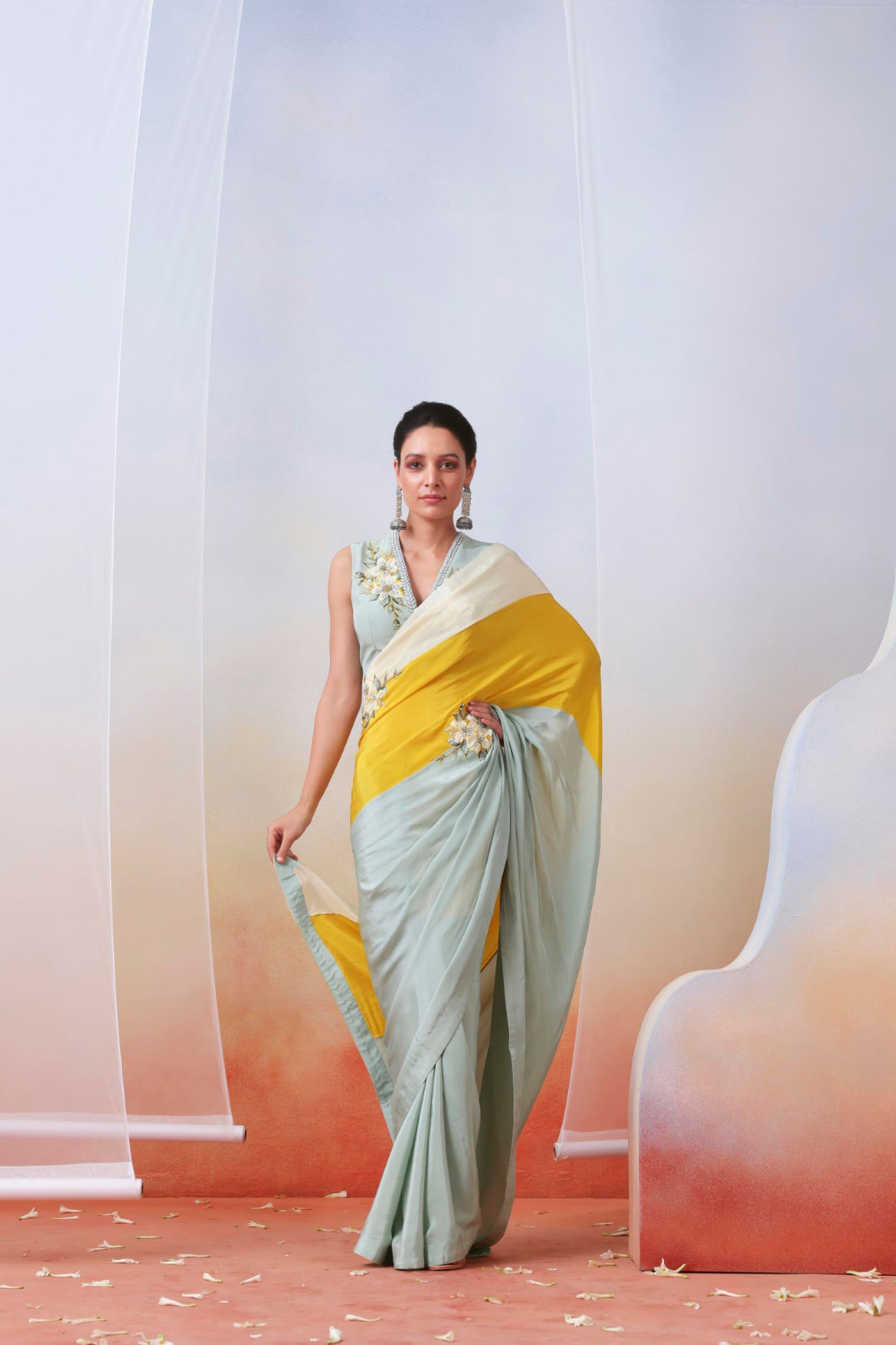 Featured here is multi color panelled saree made in crepe with embellished patchwork of florals. It is paired with an embroidred blouse and matching petticoat.
