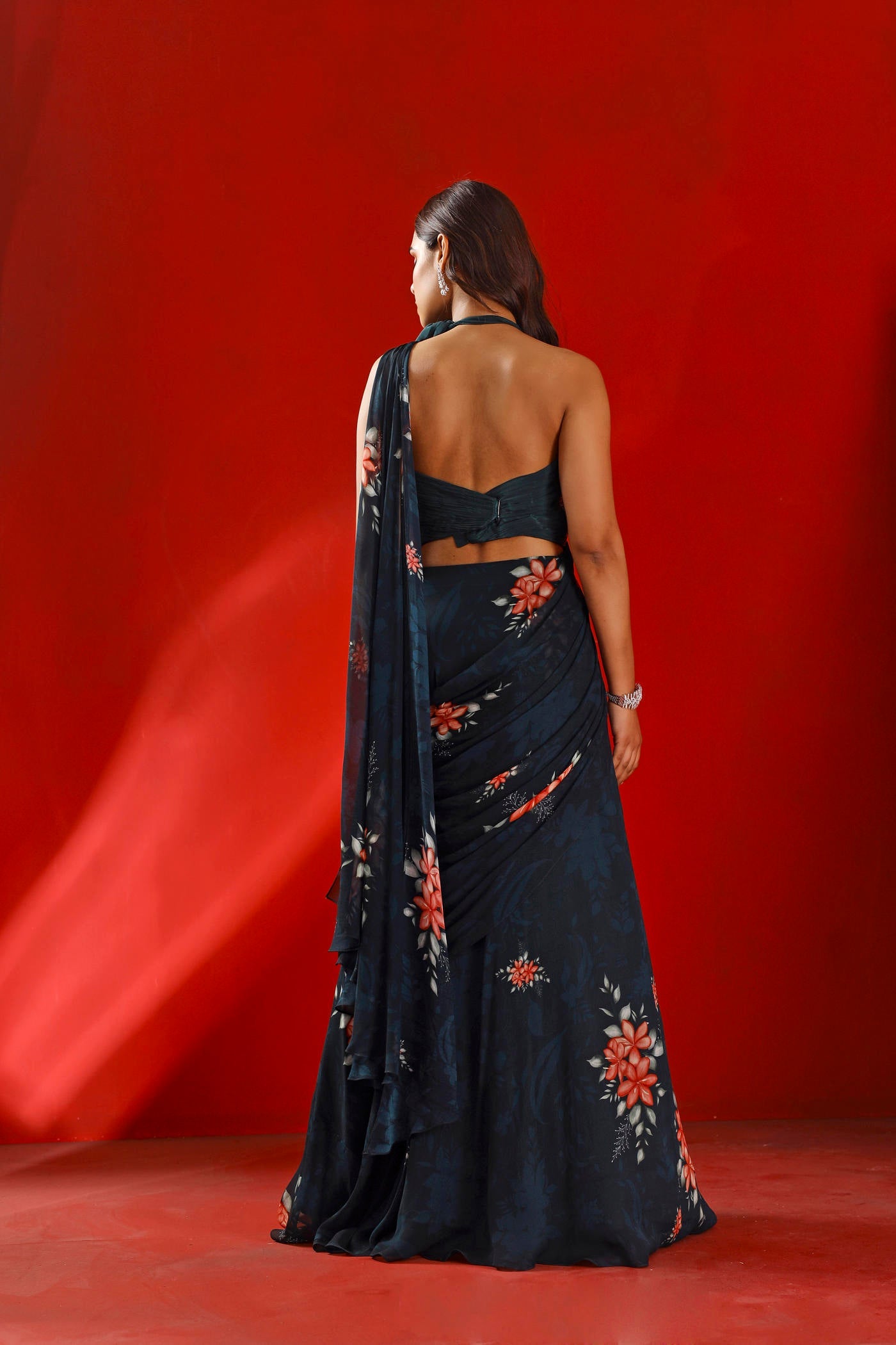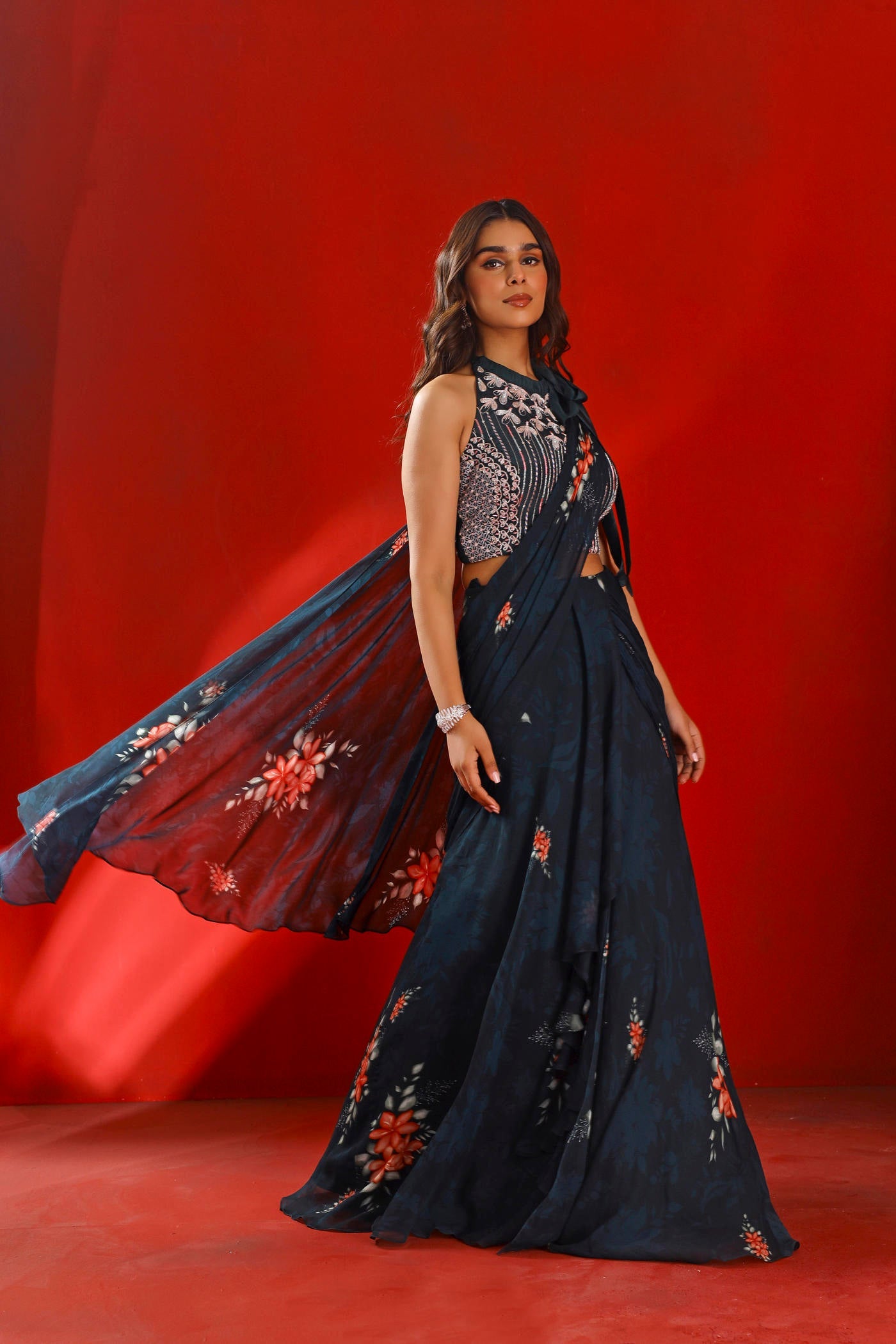 Featured here is a midnight green printed multi-layered saree made in georgette. It is paired with an intricately embroidered halter crop top made in crepe with hand ruched back and a bow tie on the neck.