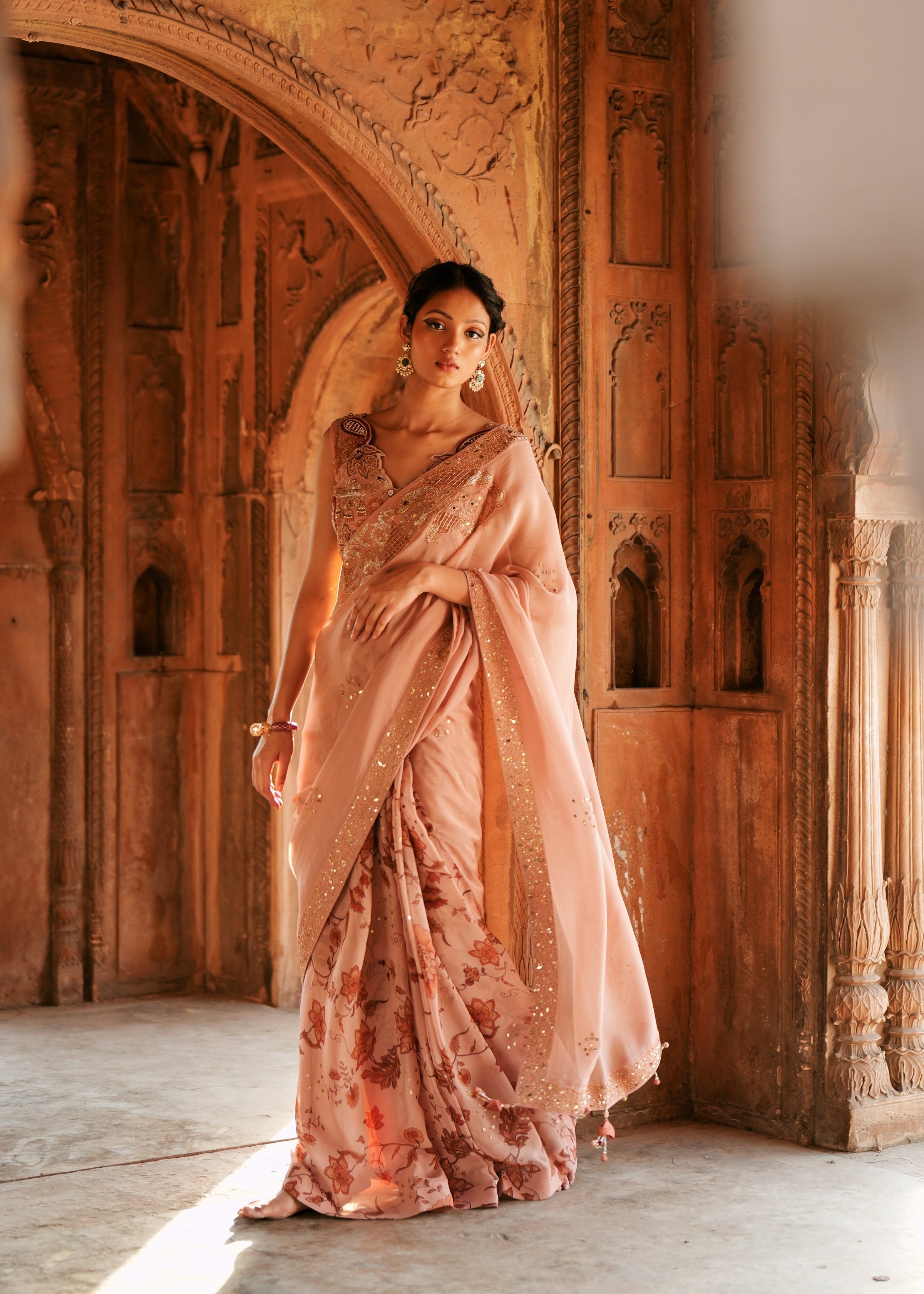 Radiating festive elegance, this classic six-yard saree in a powder pink color organza - beautifully adorned with intricate zardozi, pitta, and mirror work for a luminous finish. It is paired with a richly embroidered silk blouse and a coordinated petticoat, creating a statement look that’s perfect for all celebratory occasions. A timeless silhouette for the modern Indian muse.