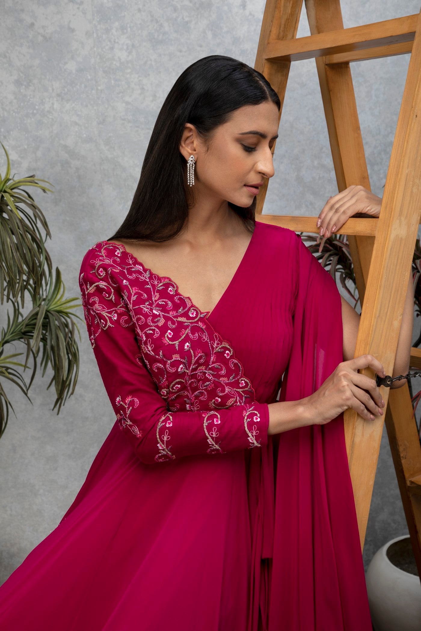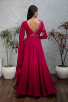Featured here is Pink sapphire ombré dyed drape gown with intricately embroidered bodice and side tie up belt at waist