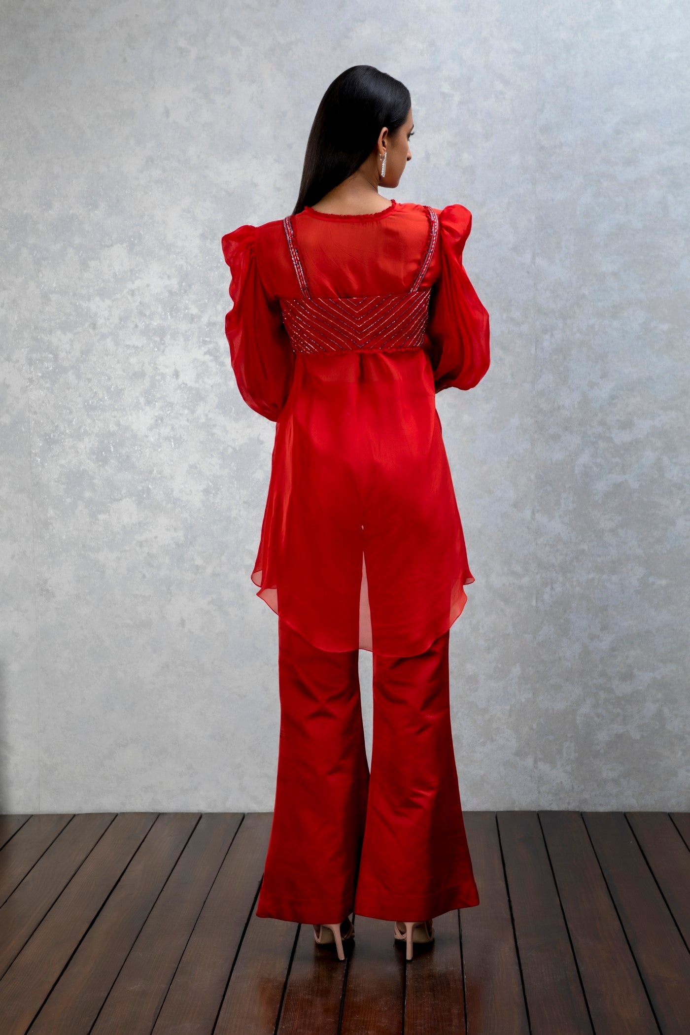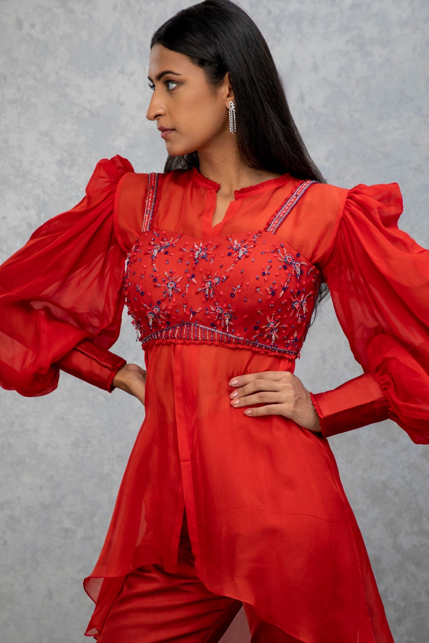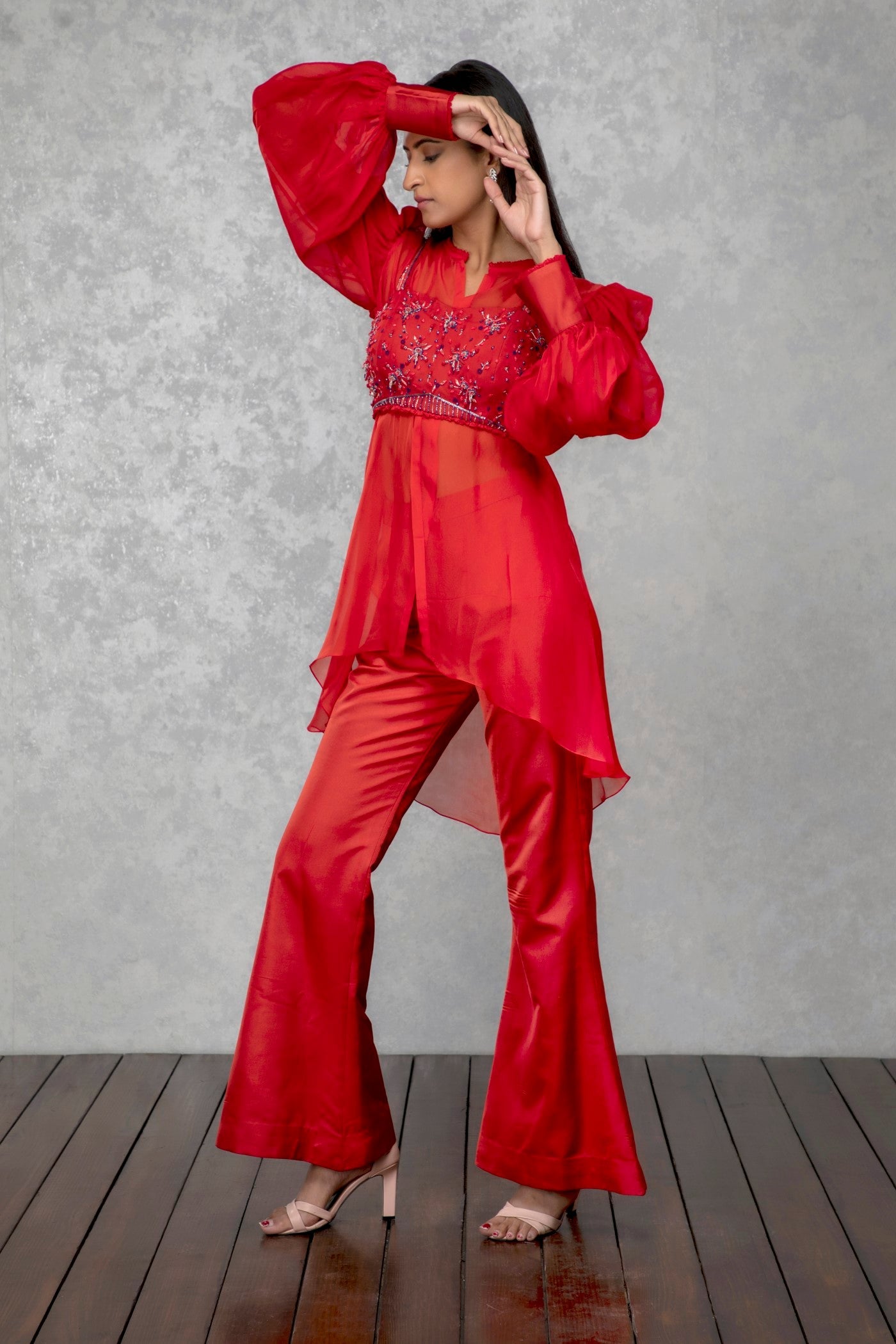 Featured here is our amber orange co ord set. It includes an embroidered bustier and Organza shirt with statement sleeves. It is paired with silk pants to complete and compliment the chic look.