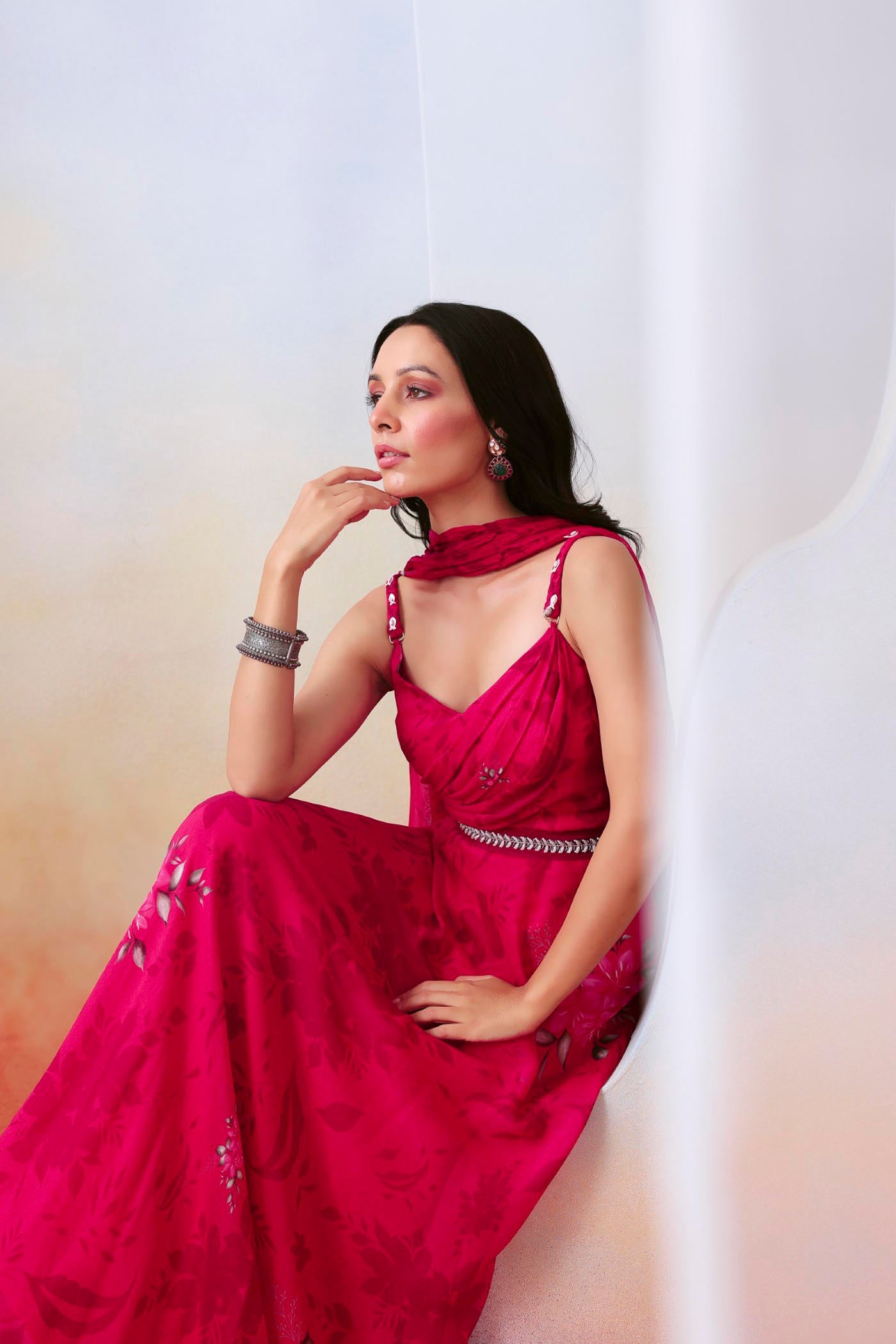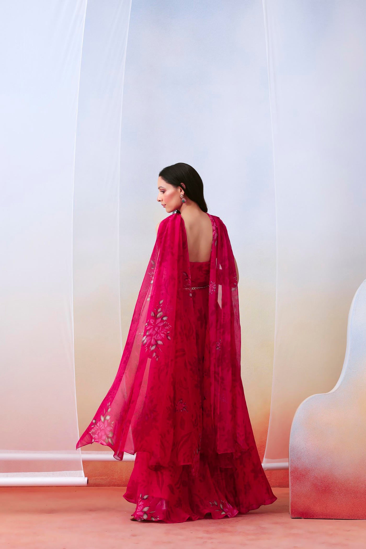 Featured here is a pink printed drape anarkali set