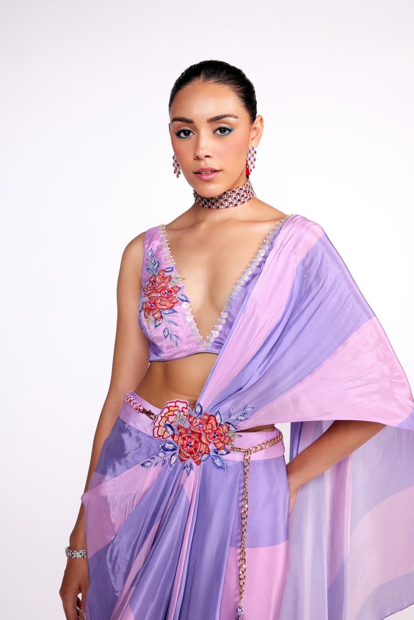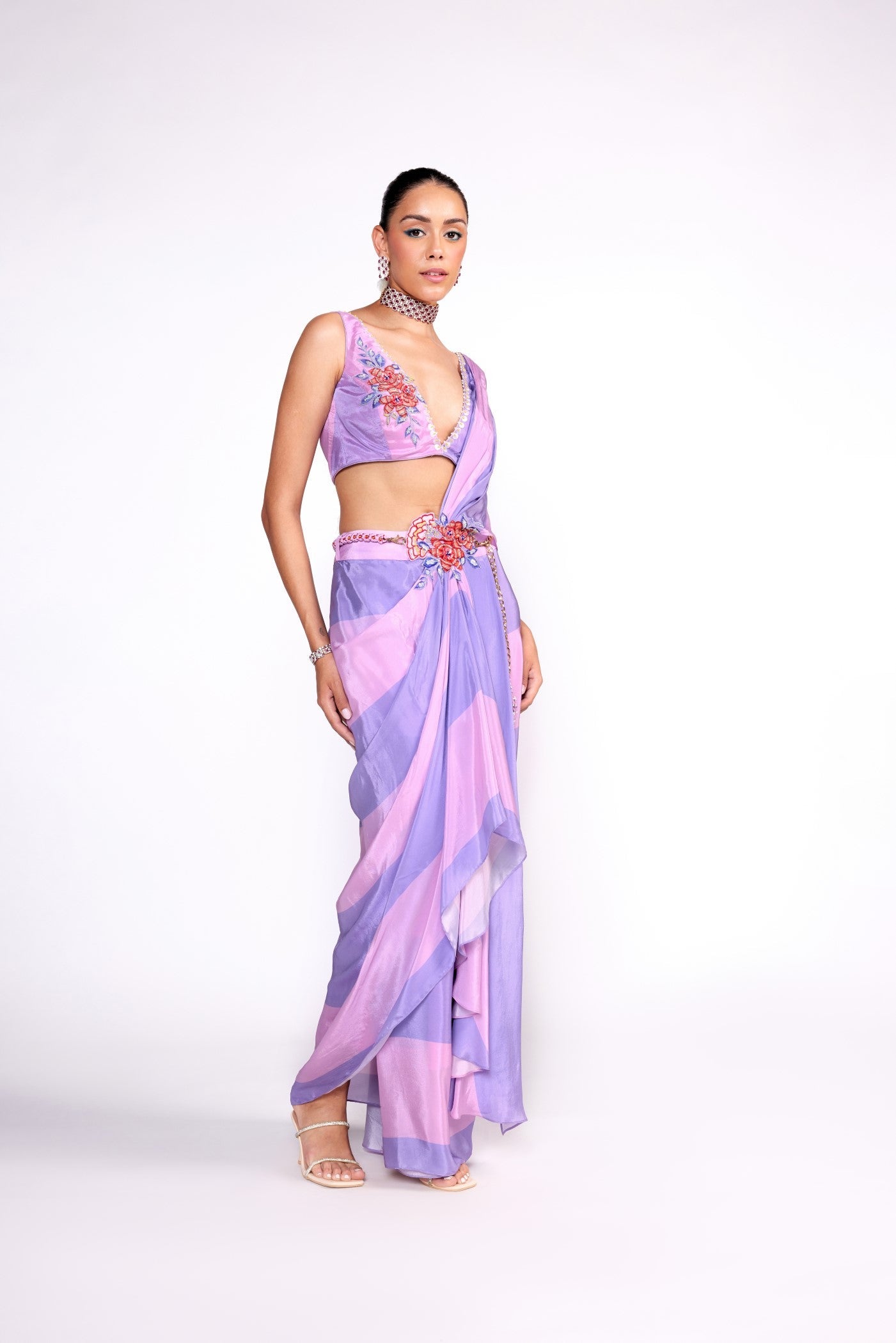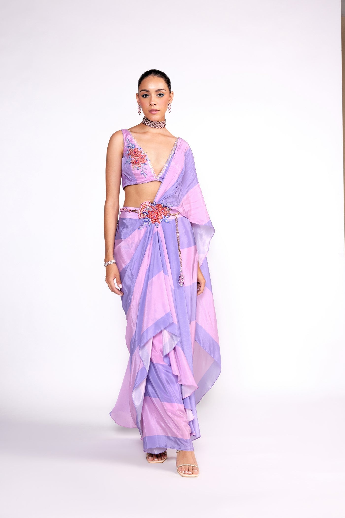 This set features a lilac printed color block saree made in chiffon. The saree features a 3D embroidered waist patch with a detachable macrame free size belt. It is paired with and embroidered blouse made in crepe.