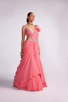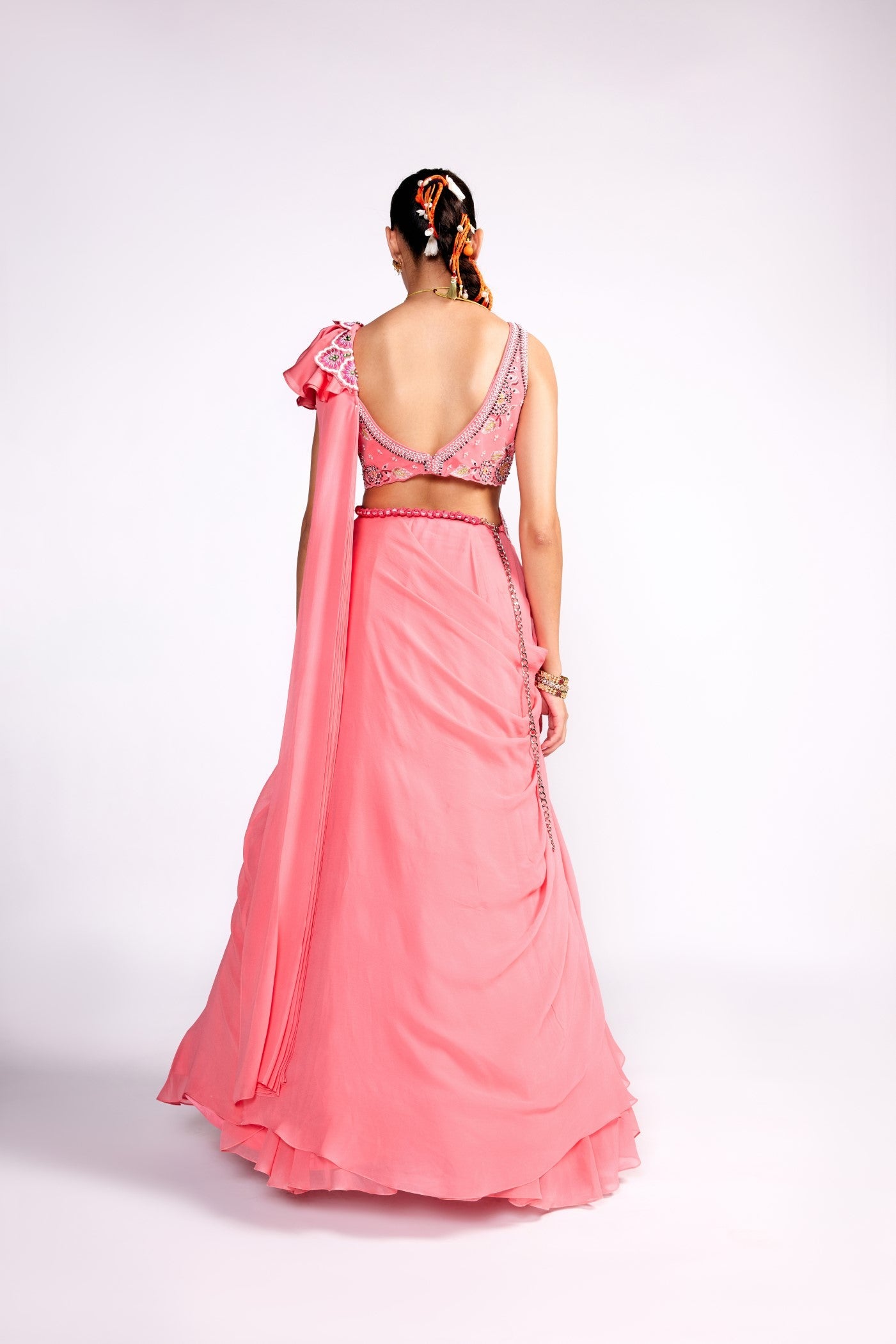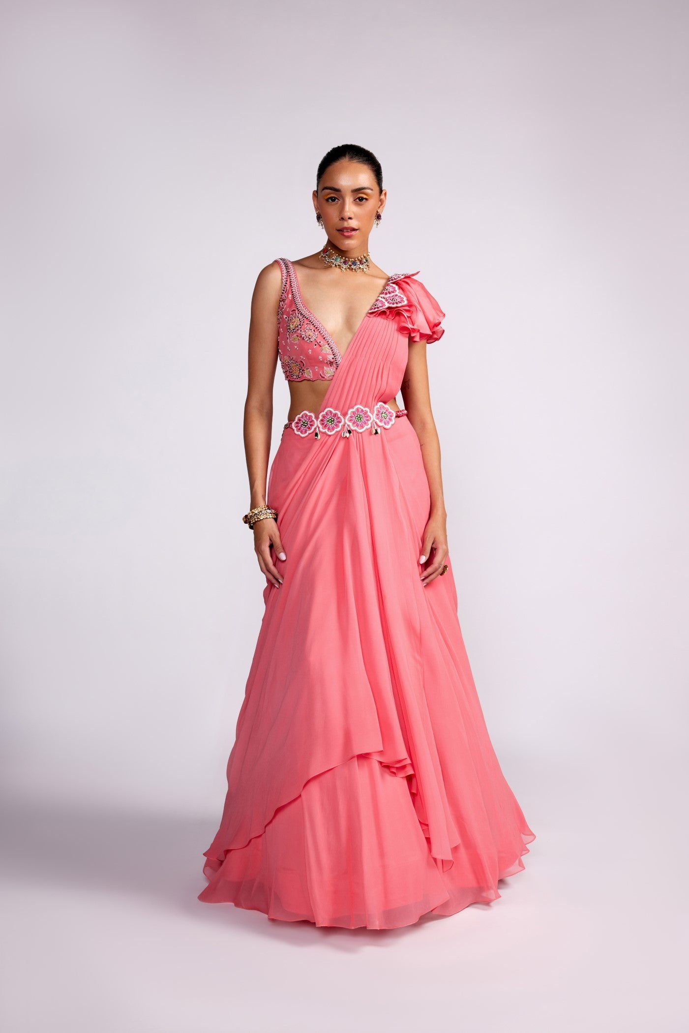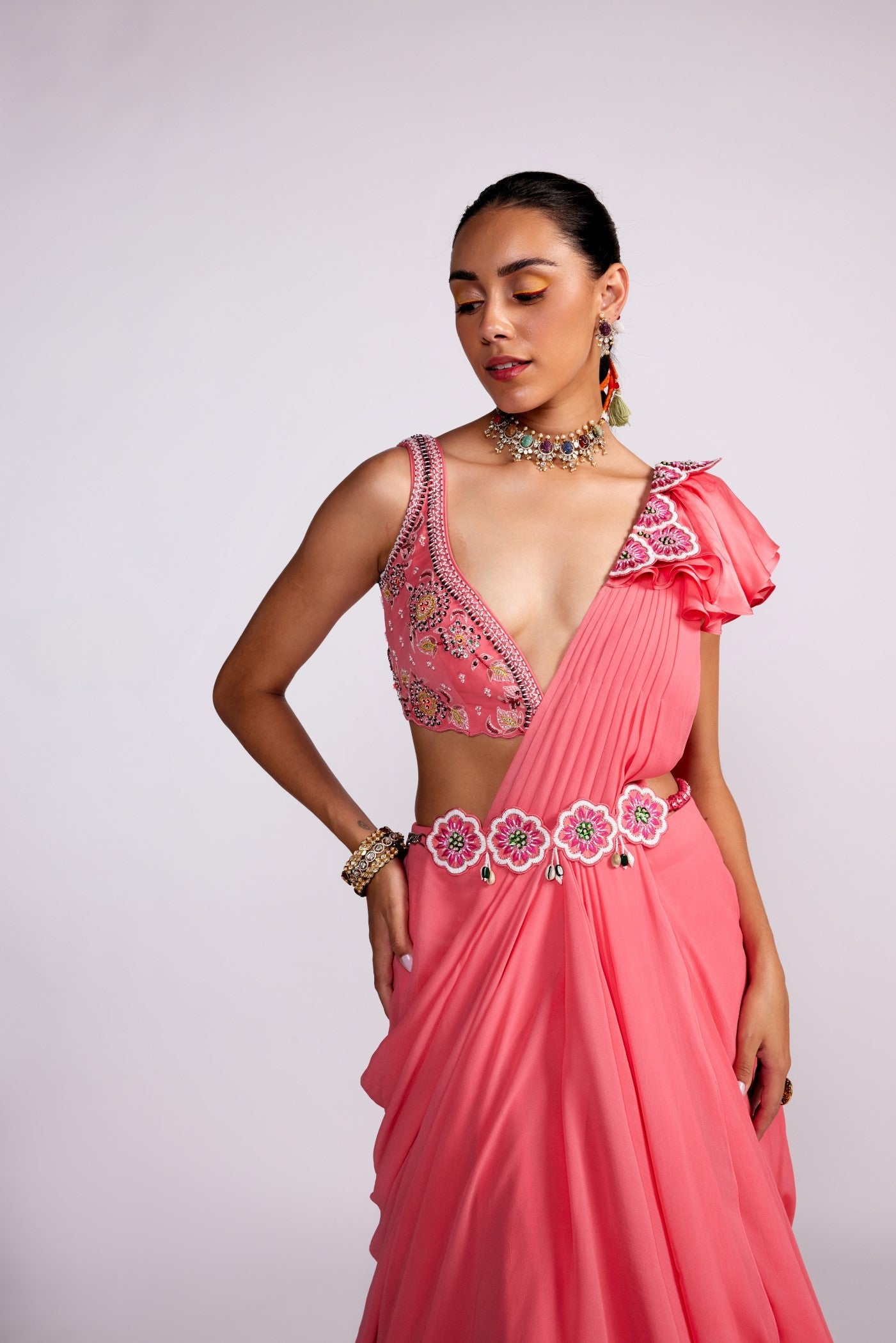Featured here is watermelon pink drape saree paired with an embroidered blouse.