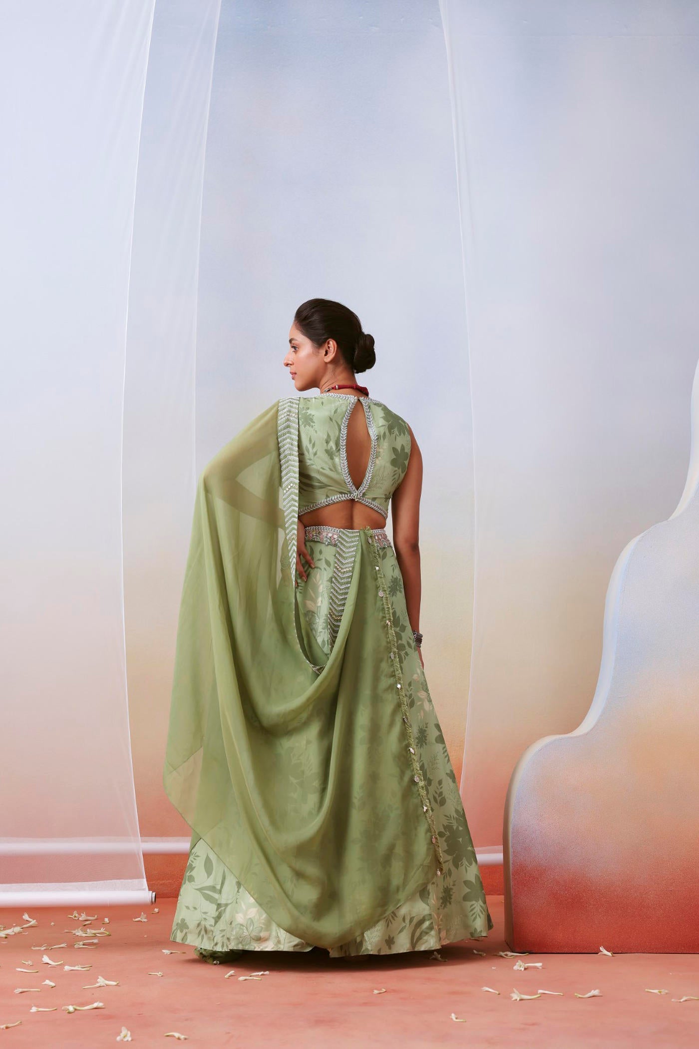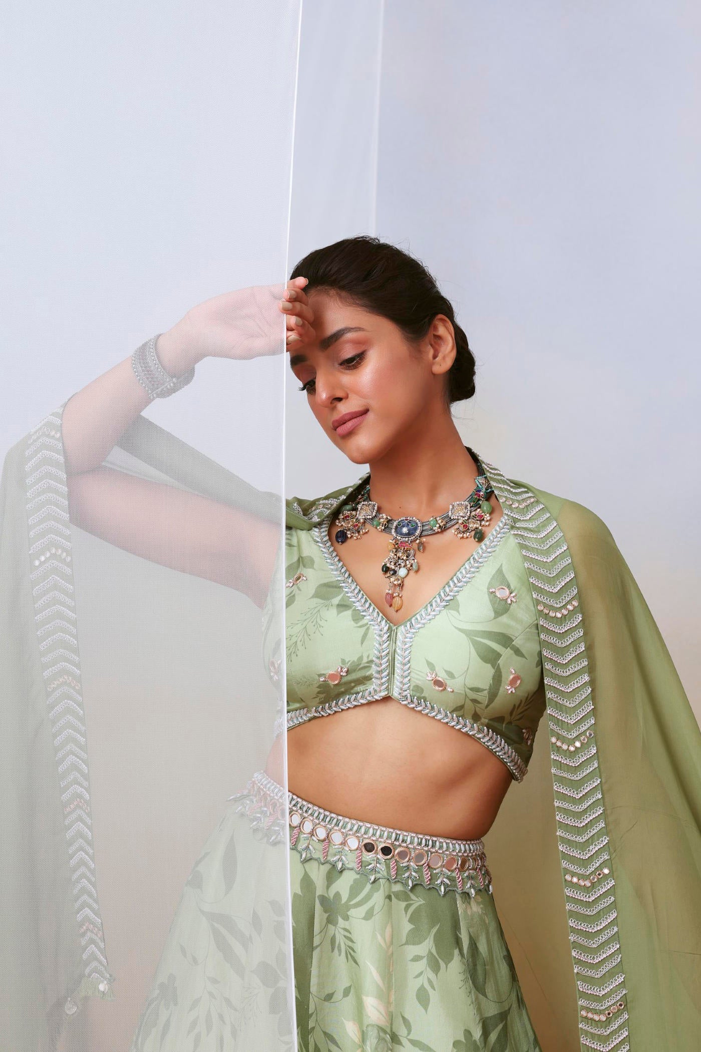 Sage green printed embroidered lehenga set