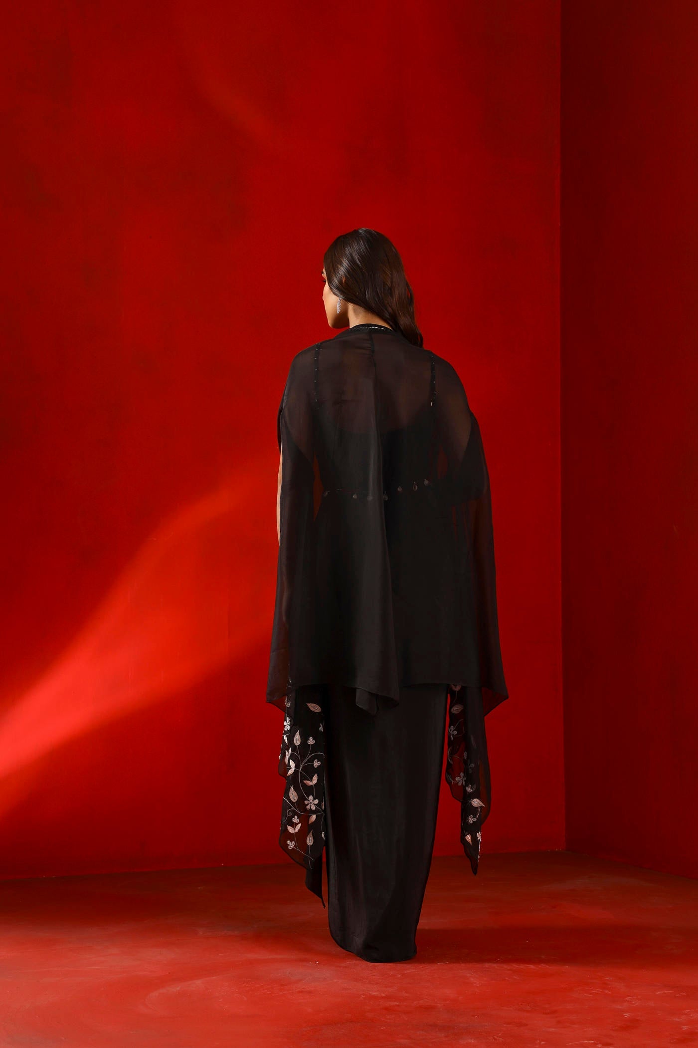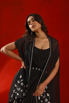Black magnolia drape dress and cape set