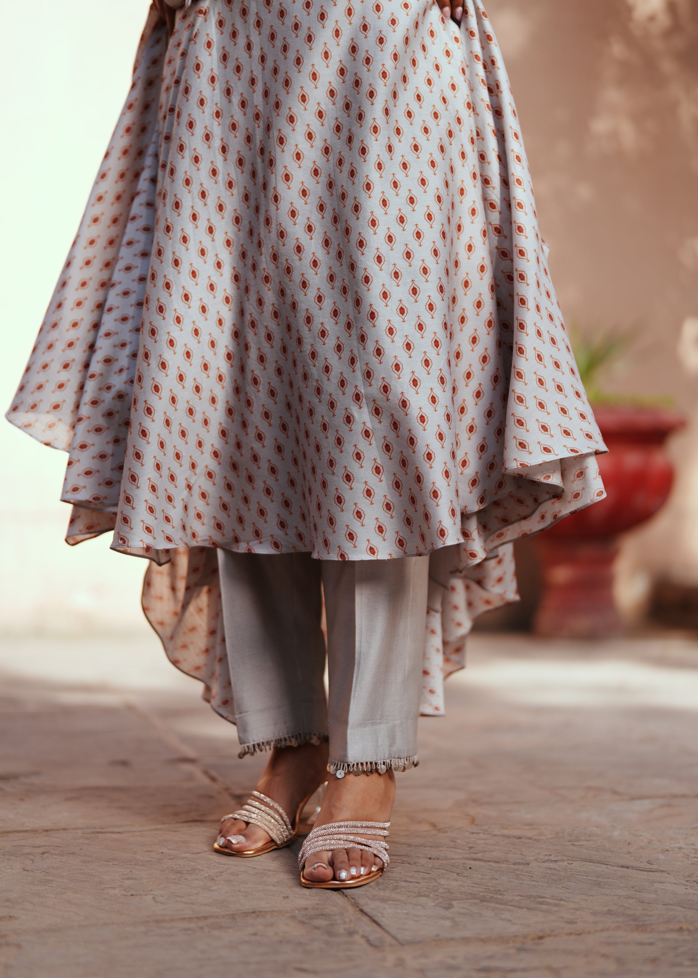 Chaand Grey Printed Booti Chanderi Jacket Style Kurta Set