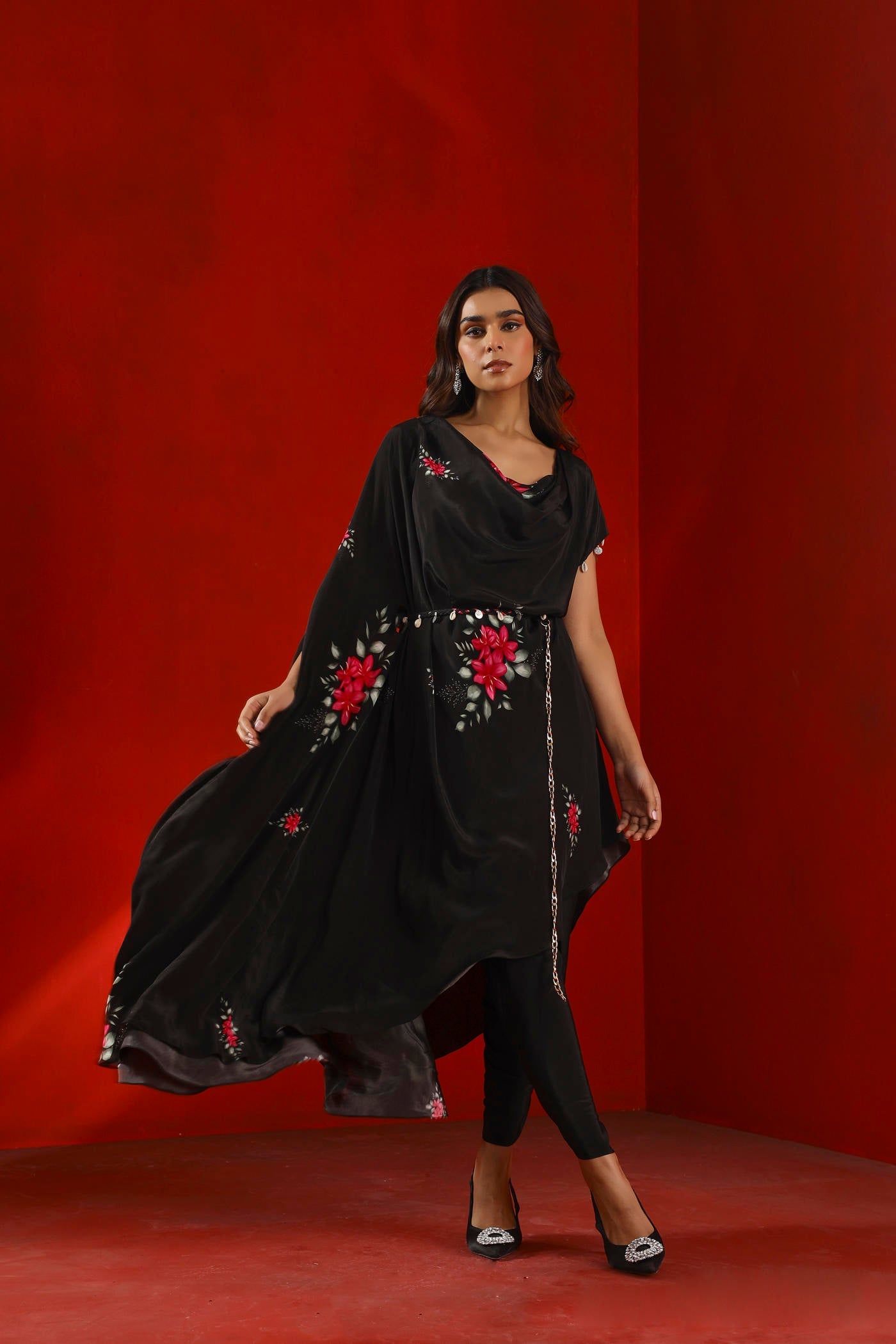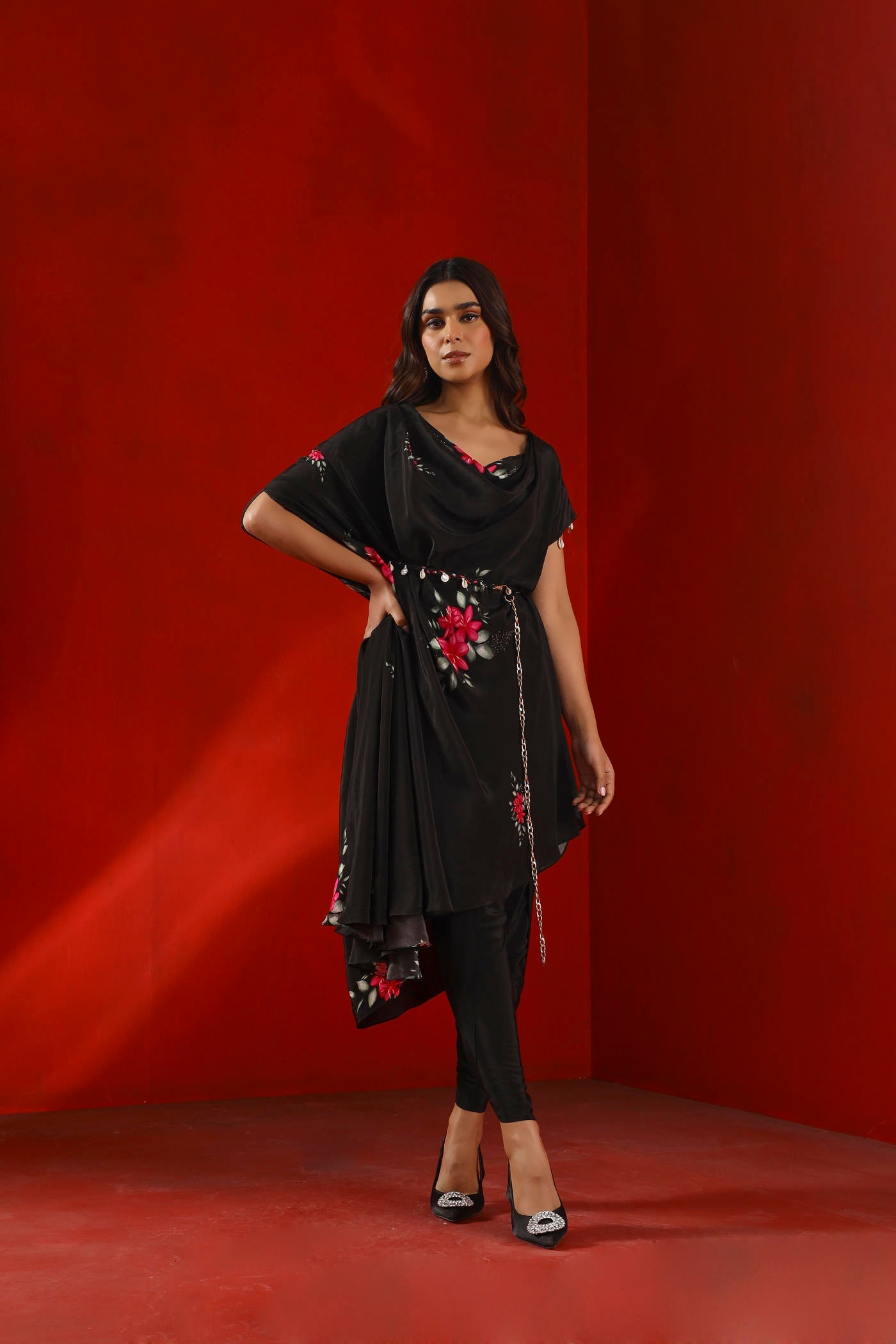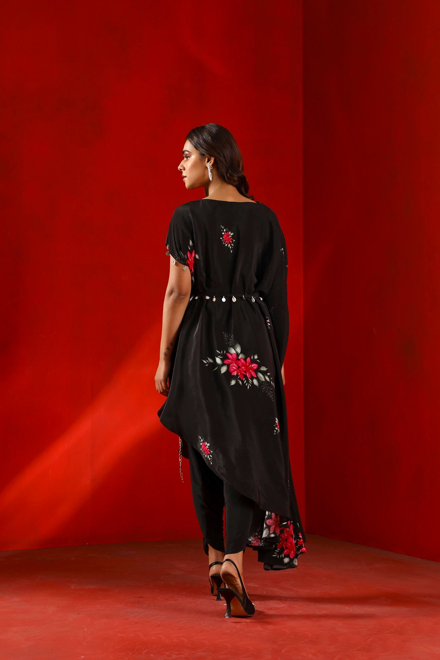 Featured here is a black magnolia-printed drape kaftan set. It is paired with tulip pants both made in crepe. The set also includes an embellished belt to complete the look.