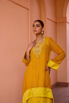 Featuring an Assymetric and layered kurta set embroidered with gota and tilla work. It is made in bandhani adorned organza and crepe. Paired with crepe pants and embellished tulle dupatta. This set completely tranforms into a glamorous and effortless traditional look.