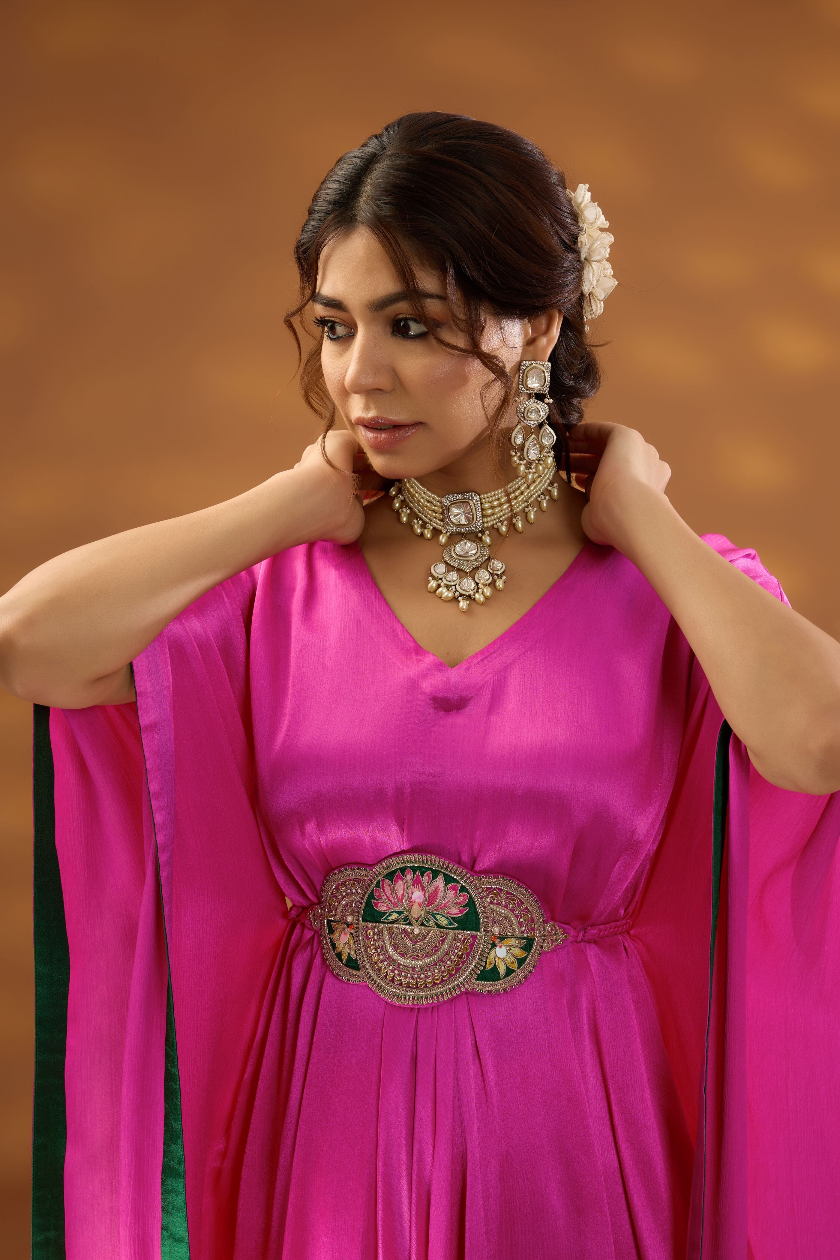 Gul Pink Printed Booti Chanderi Jacket Style Kurta Set