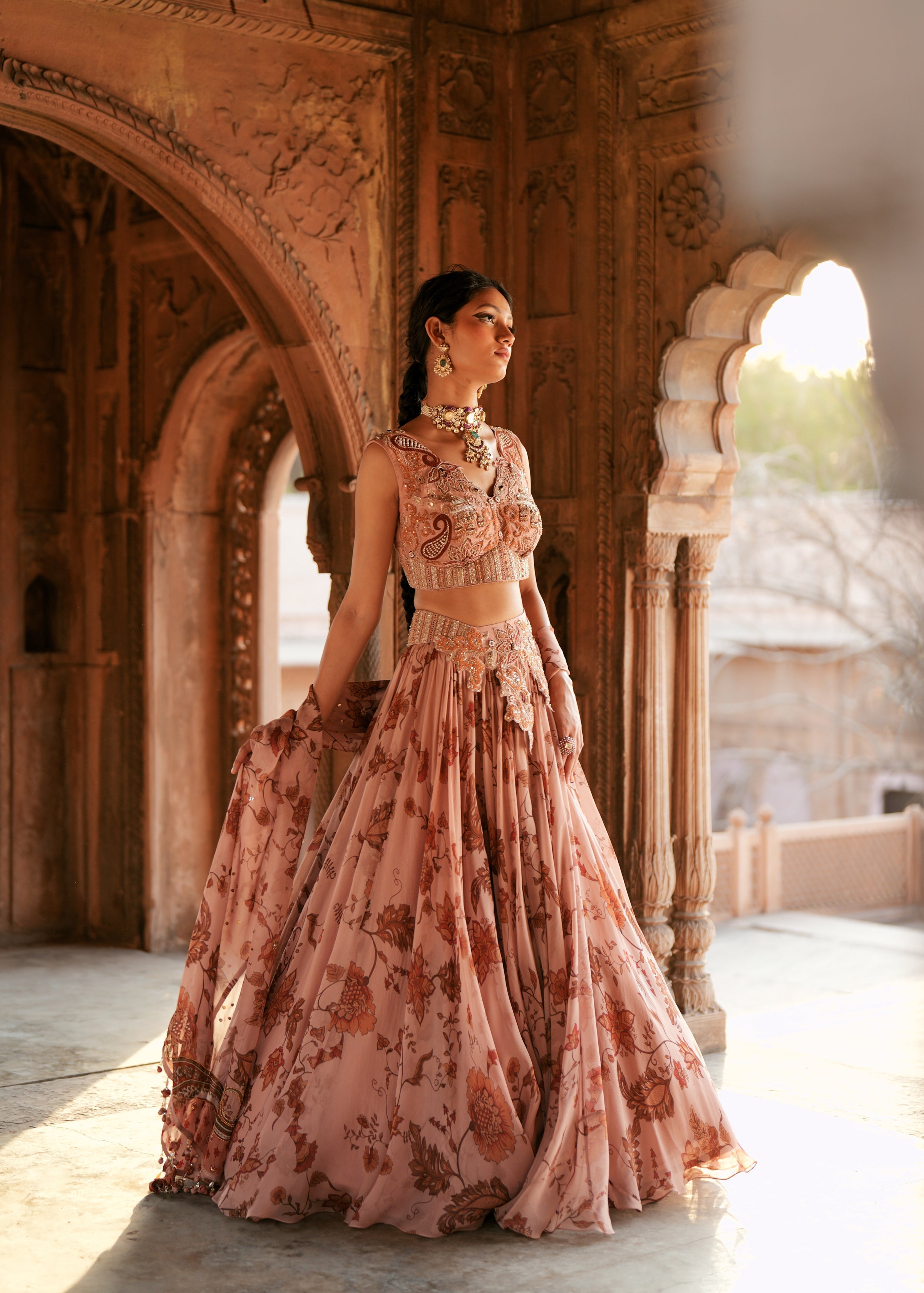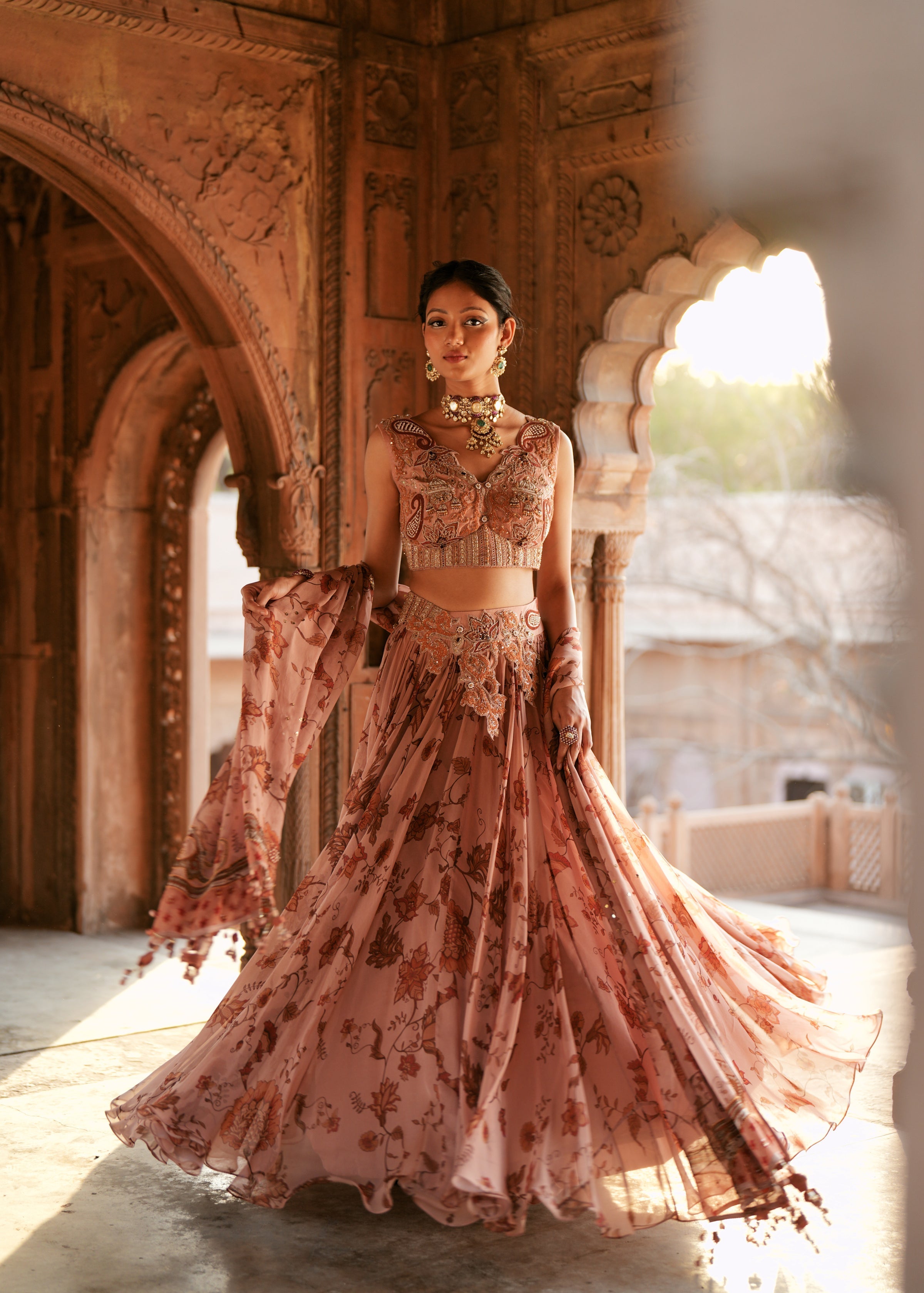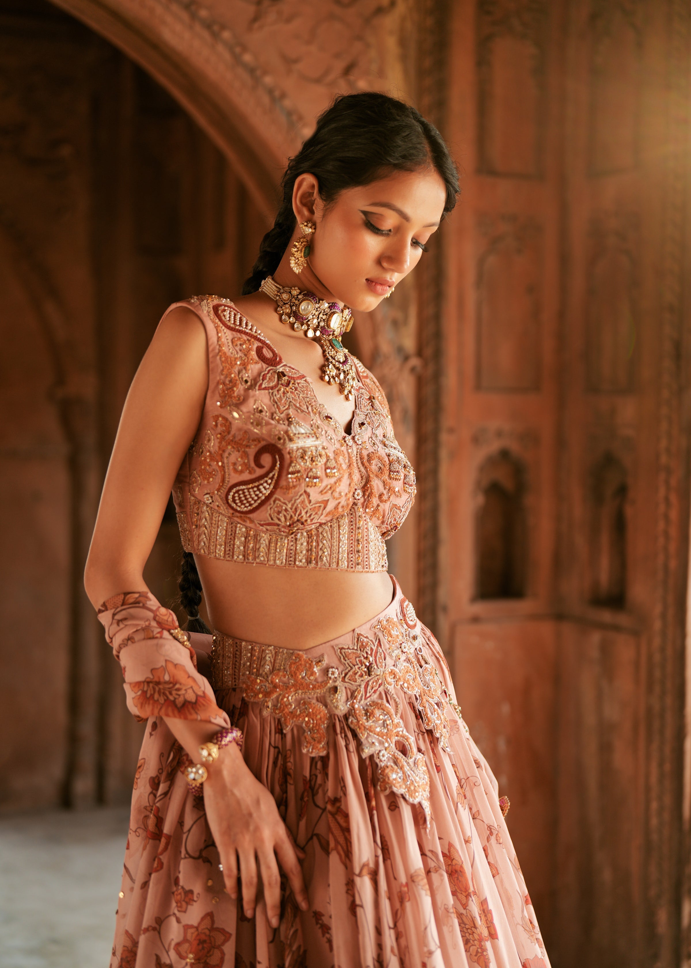 This festive pink organza lehenga is brought to life with delicate floral prints and intricate embroidery. Paired with a silk blouse adorned with dori and zardozi work, the look is elevated by a handcrafted kamarbund featuring fine cutwork that beautifully defines the waist. Finished with an embroidered organza dupatta, this ensemble is perfect for haldi, mehendi, sangeet, and modern Indian wedding festivities.