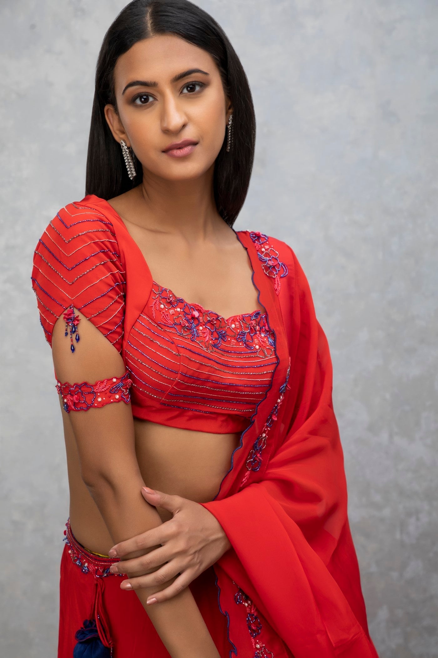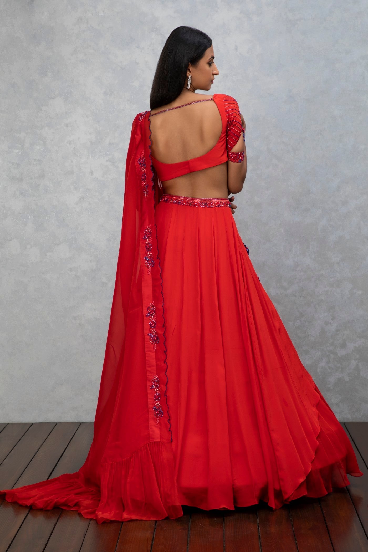 This ensemble features hand embroidered blouse with layered lehenga. It is paired with hand embroidered orgazanza dupatta.