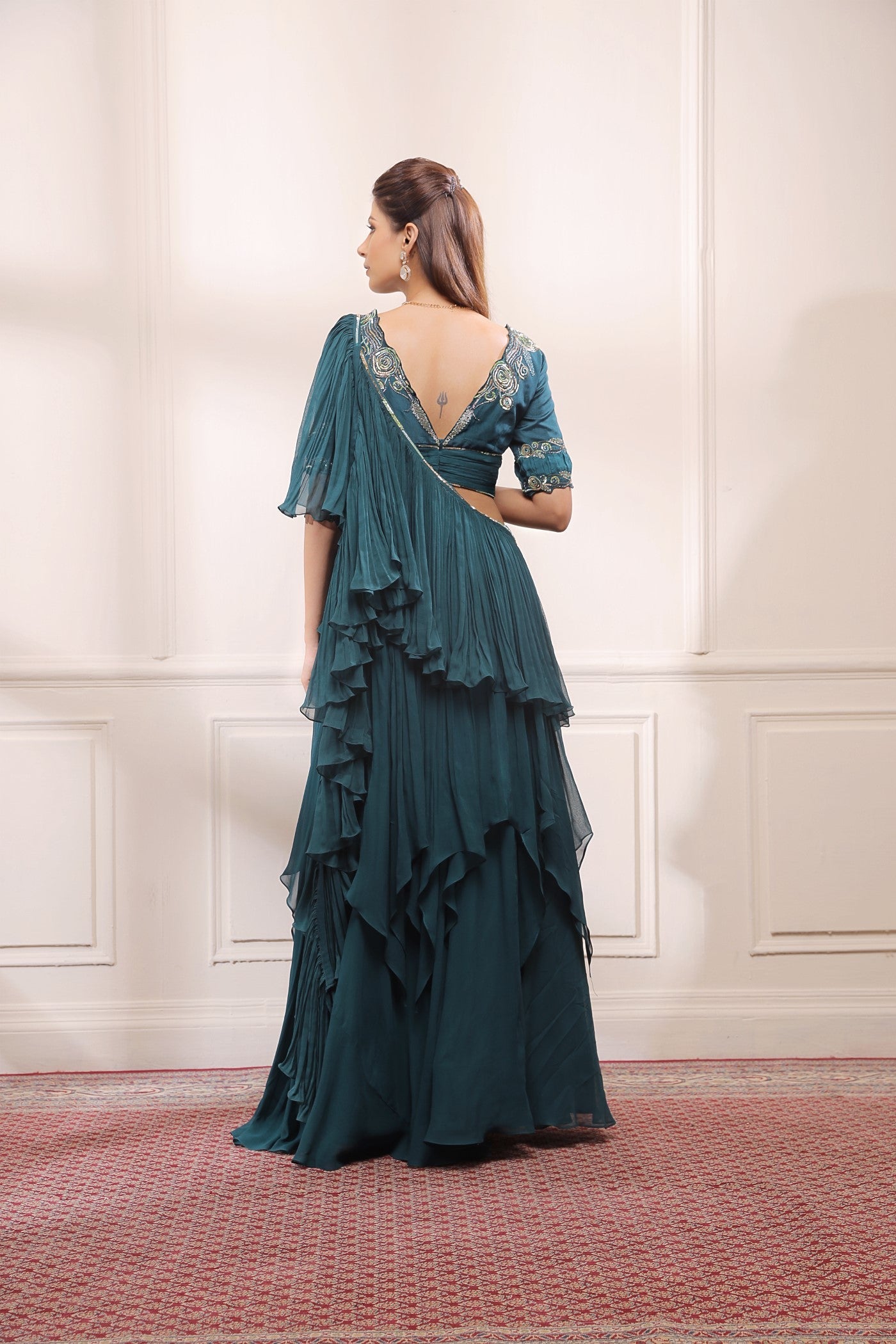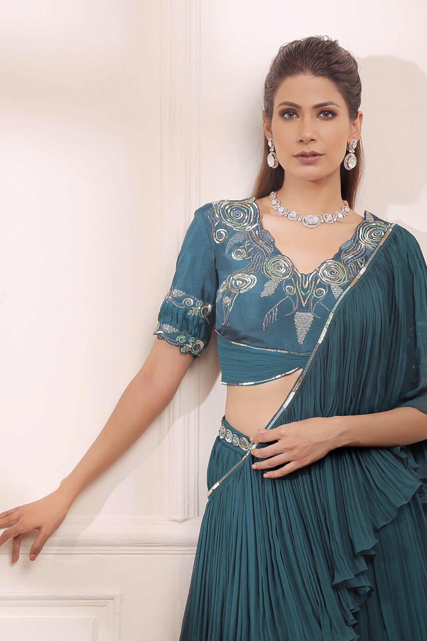 Georgette layered lehenga with asymmetric hem is paired with skilfully embroidered blouse and a pleated pallu that has an embroidered border