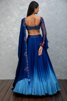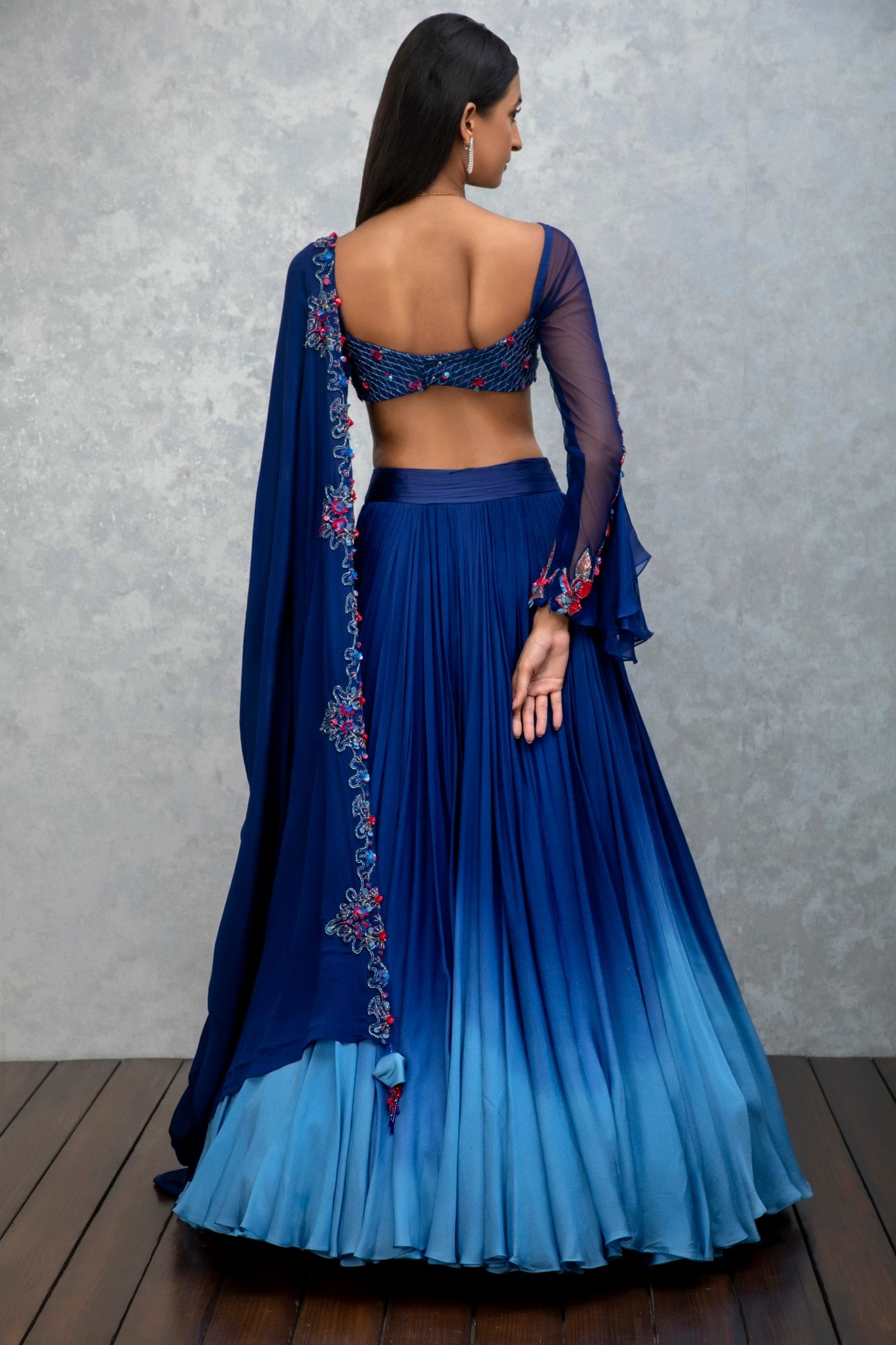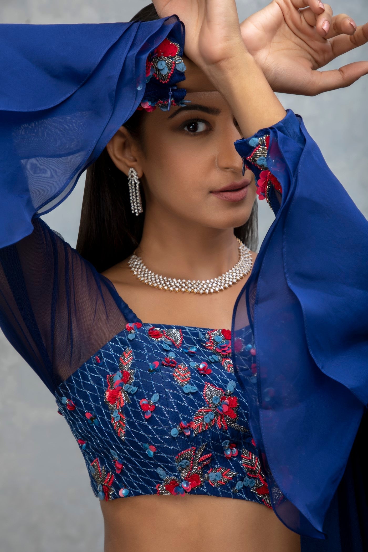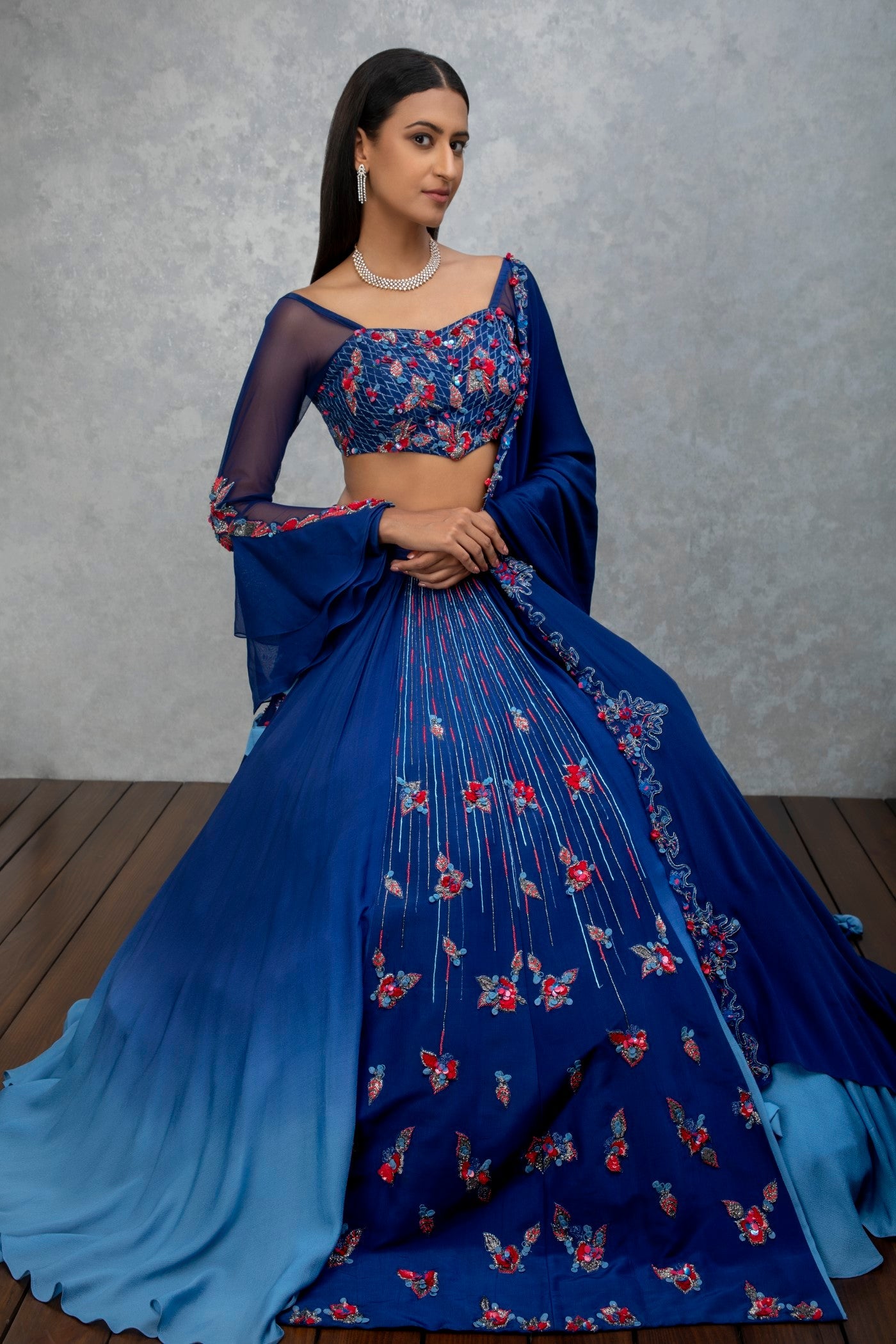 Our best seller tanzanite blue lehenga set features an intricately hand embroidered blouse with statement sleeves and multi panel hand embroidered lehenga made in chiffon. To complete the look is our hand embroidered chiffon dupatta for new age brides and bridesmaids