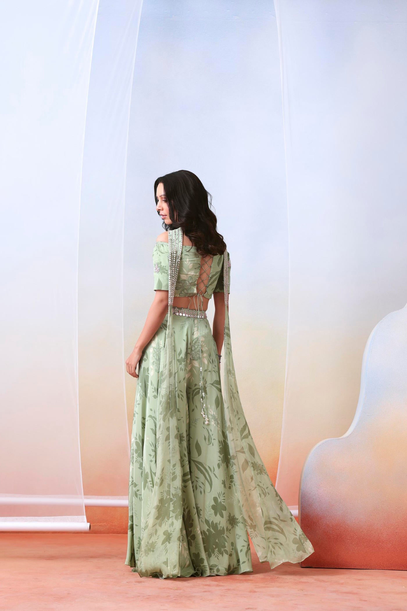 Featured here is sage green printed and embroidered sharara set made in crepe. It is paired with mirror work embellished choker dupatta made in organza. Not to miss the highlighted and detailed pockets on sharara.