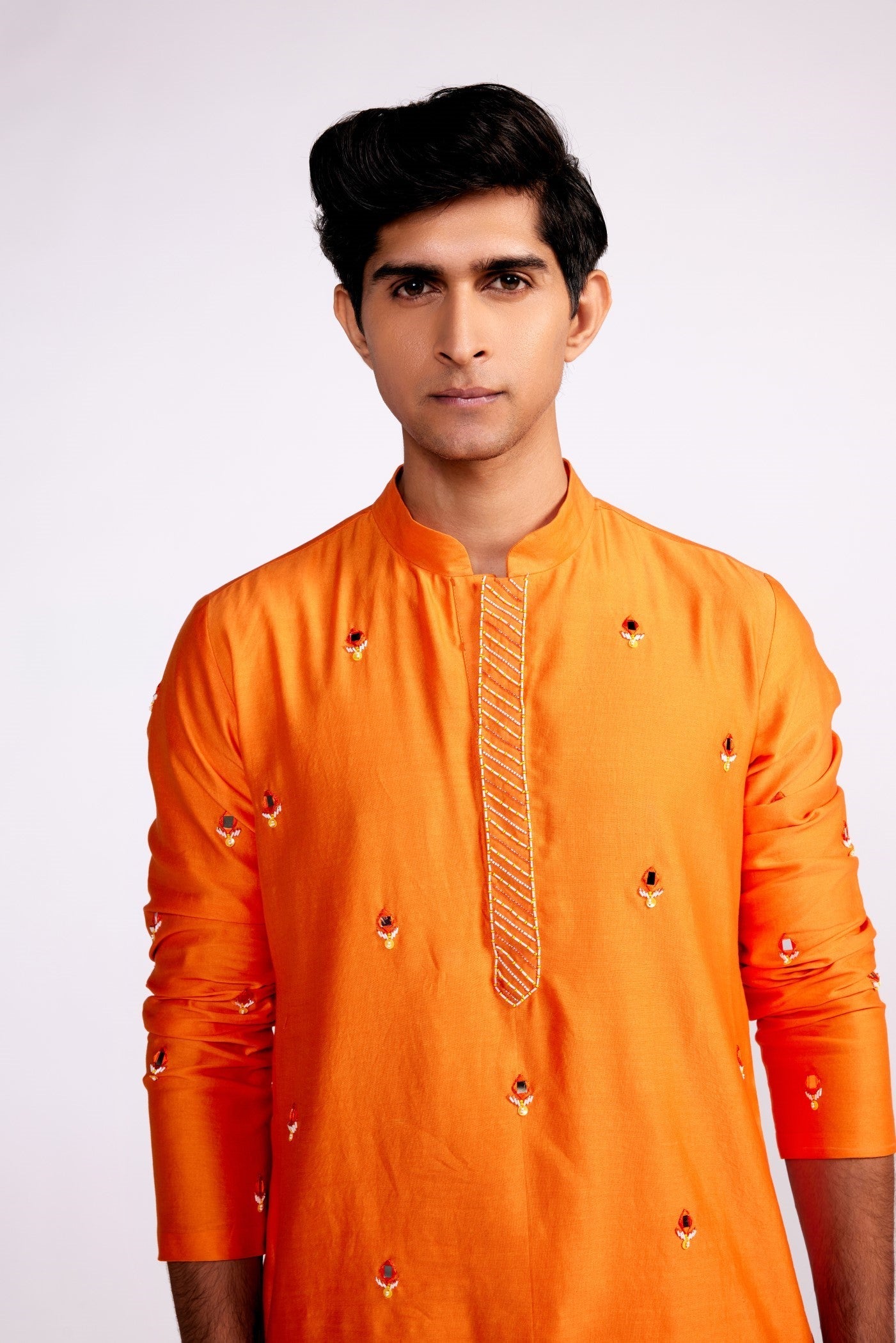 Featured here is orange mirror work embroidered Kurta made in Chanderi silk. It is paired with front open silk pants. The kurta and pants features side pockets.