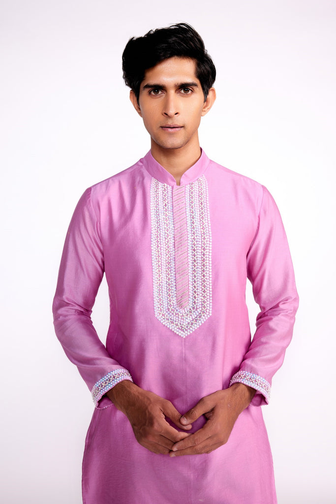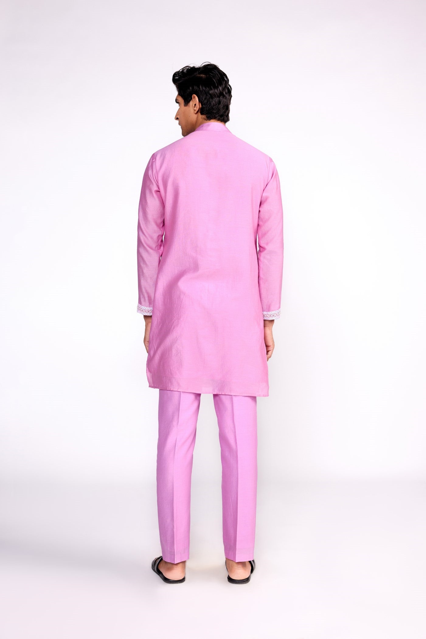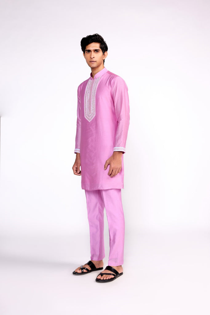 Featured here is lilac embroidered kurta. Paired with front opening pants both made in chanderi silk.