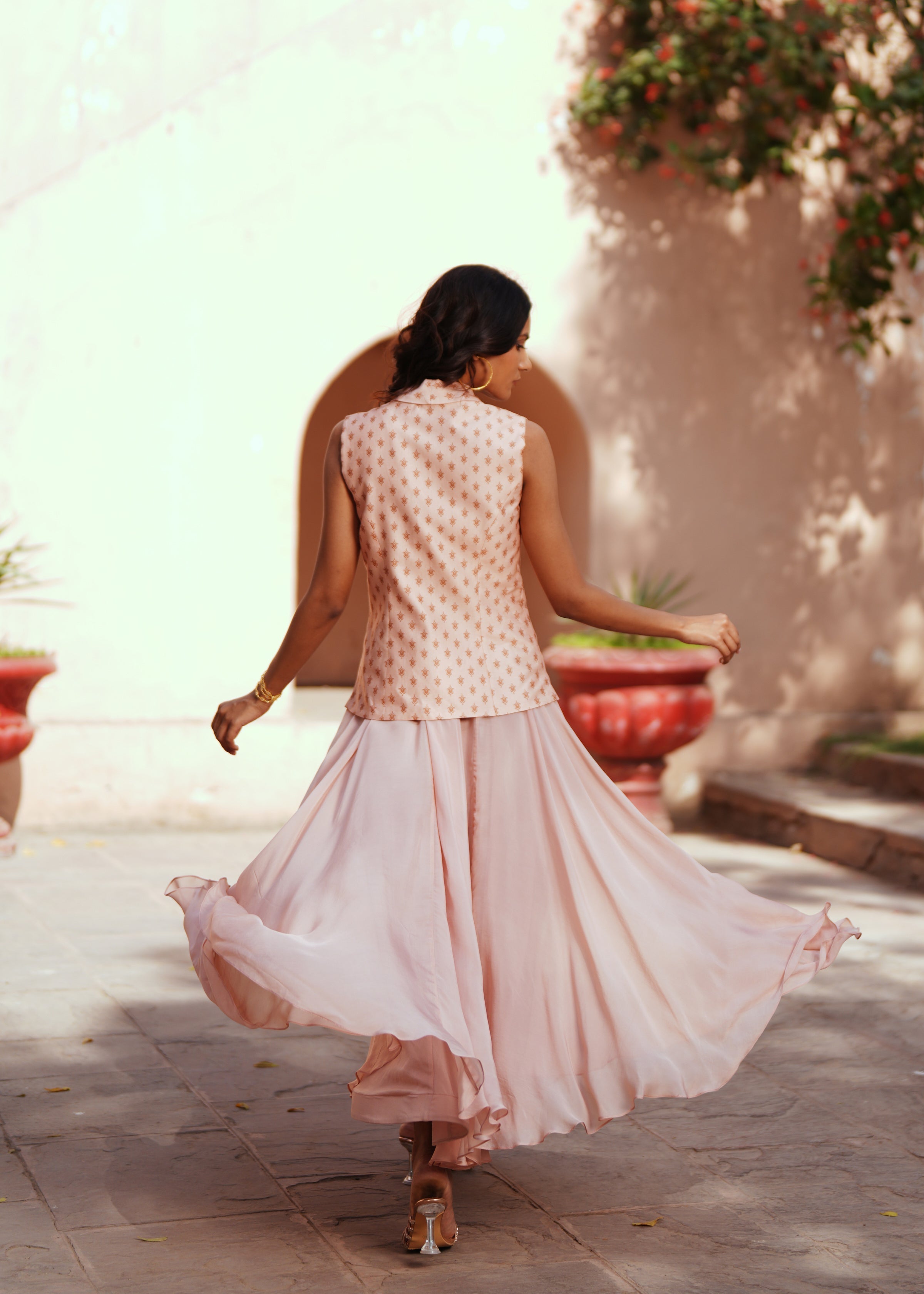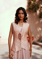this set features a tailored powder pink printed waistcoat in Chanderi silk, finished with an intricately embroidered brooch detail at the waist for a refined touch. It is paired with a soft, flowy ankle-length organza skirt and a coordinating bustier—creating a modern, structured silhouette with graceful movement. Ideal for festive evenings, cocktail parties, or formal cultural gatherings where elegance meets effortless charm.