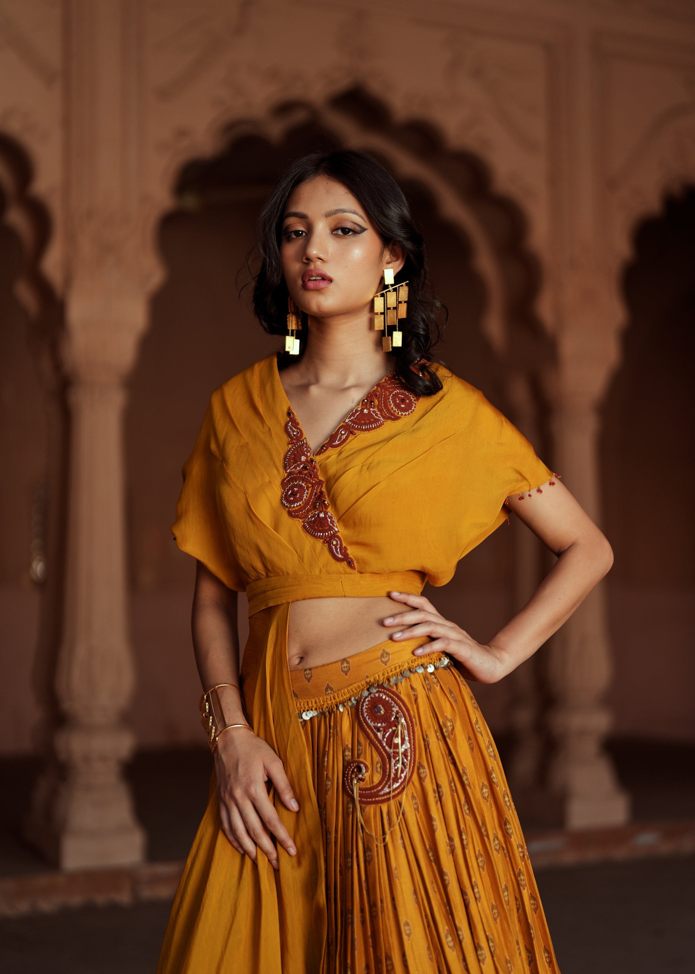 Bright, breezy, and beautifully festive — this golden yellow lehenga set features a printed Chanderi silk skirt with a placement dori and 3D embroidered waistline that adds structure and shimmer. It’s paired with a flowy organza top, designed with soft drapes and detailed embroidery for effortless elegance. Perfect for festive gatherings, intimate celebrations, and wedding festivities.