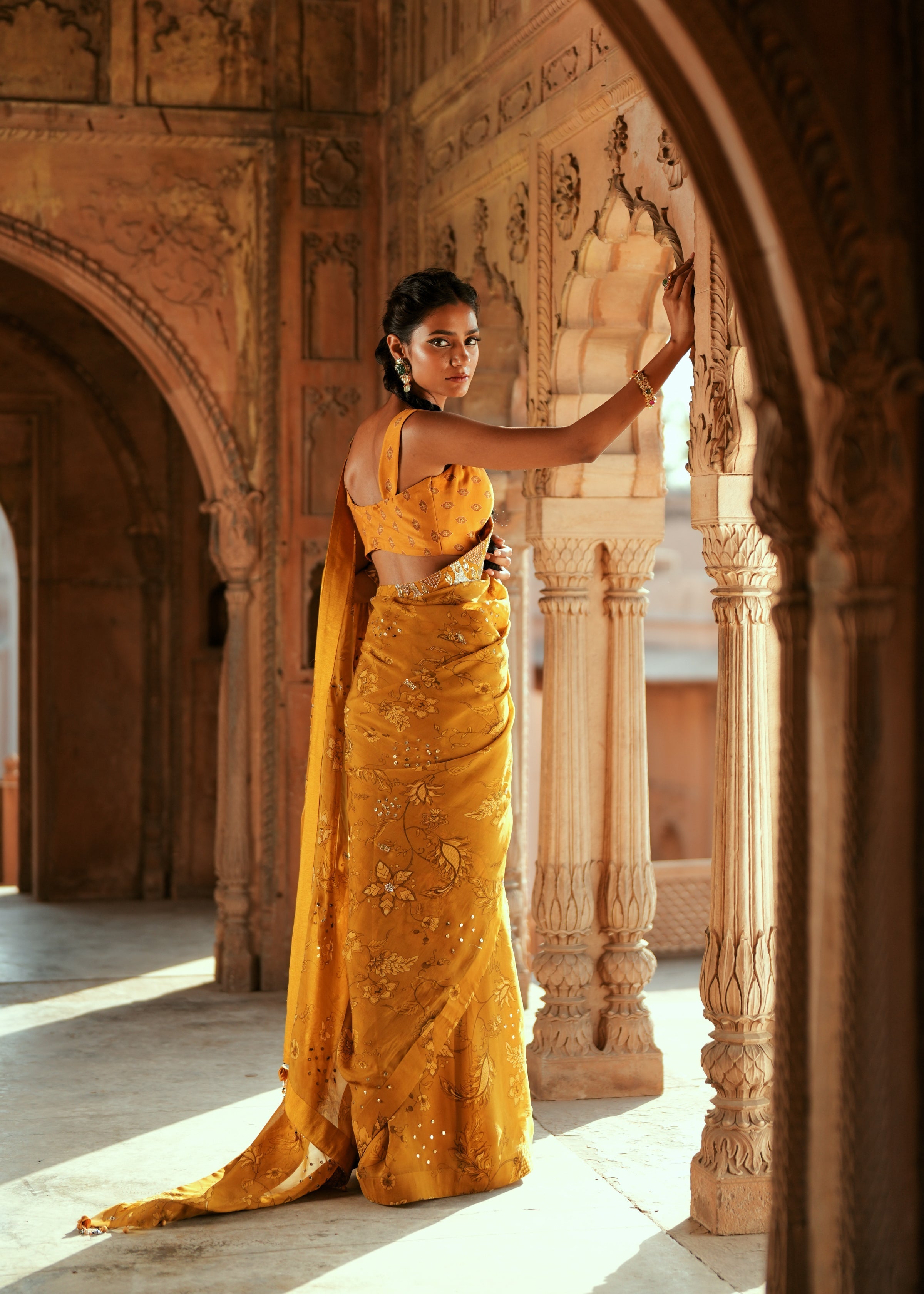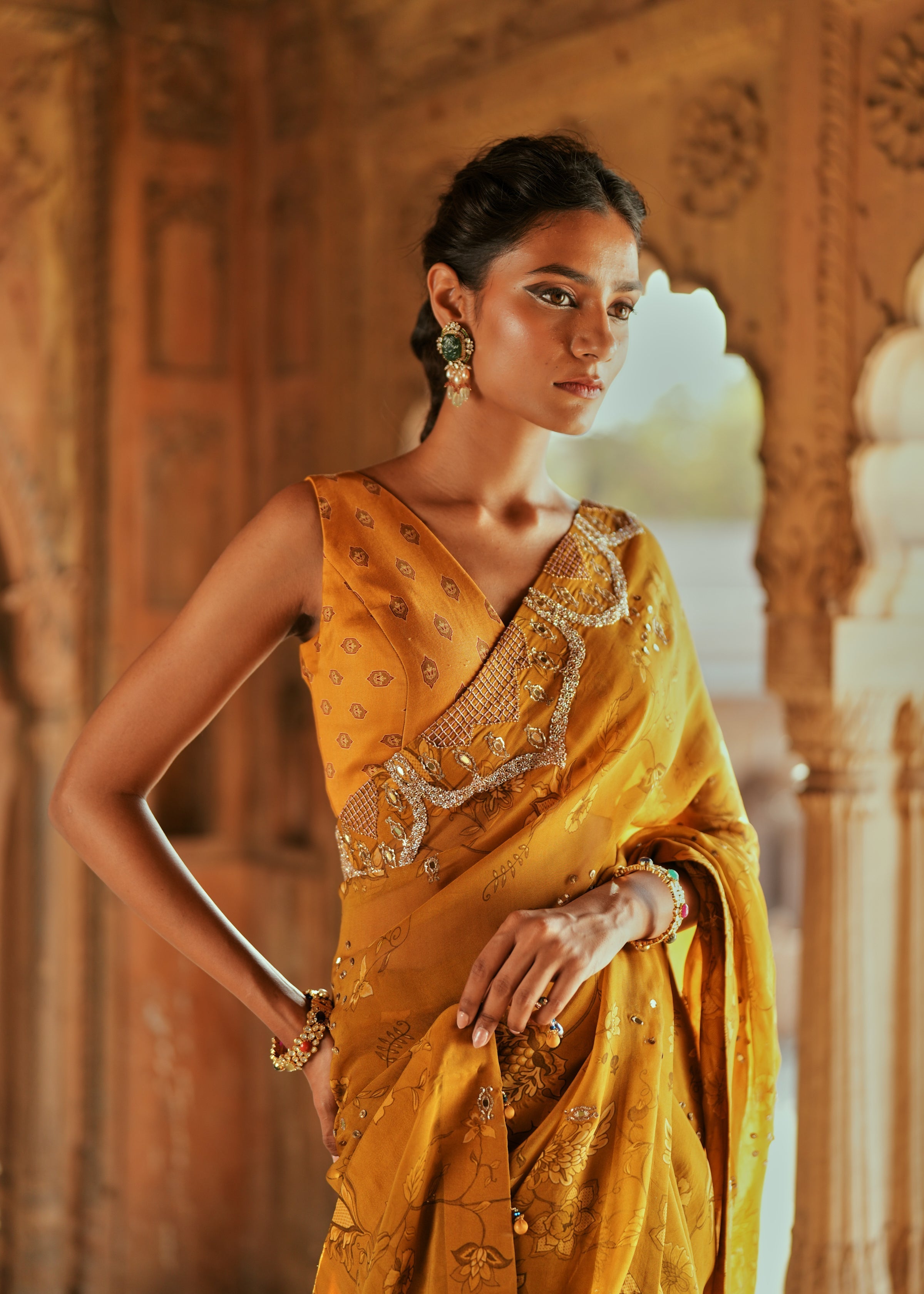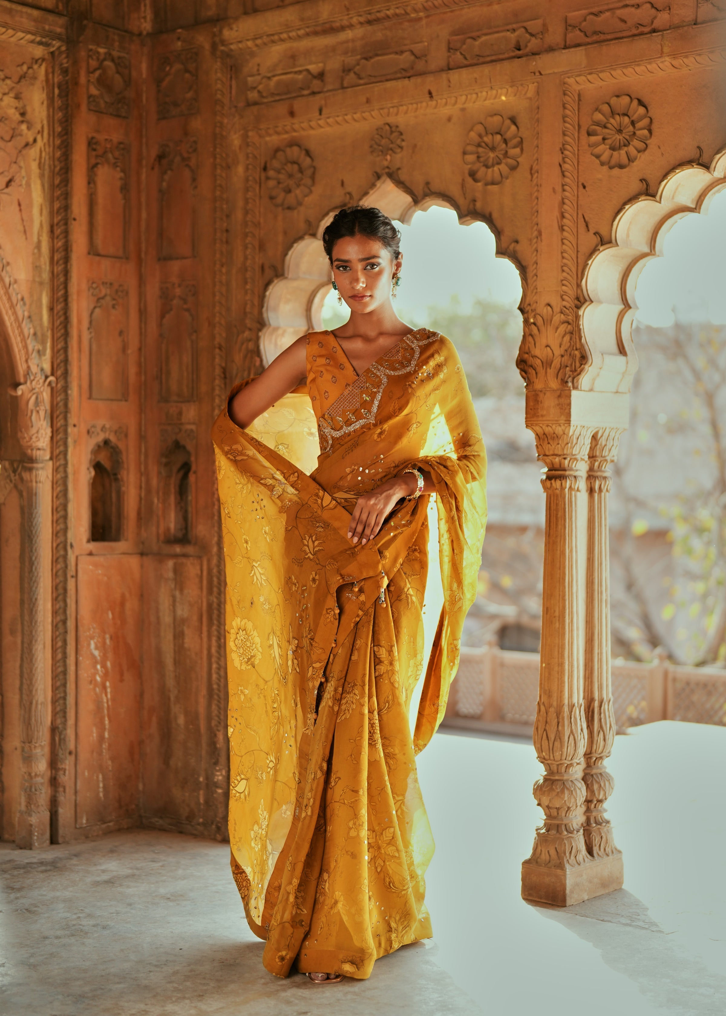 Elevate your festive look with this classic six-yard saree in a rich golden floral print, exquisitely embroidered with zardozi, pitta, and mirror work. Paired with a luxurious Chanderi silk blouse and a matching petticoat, this ensemble exudes timeless sophistication and is perfect for haldi, mehendi, sangeet, or carnival celebrations.