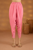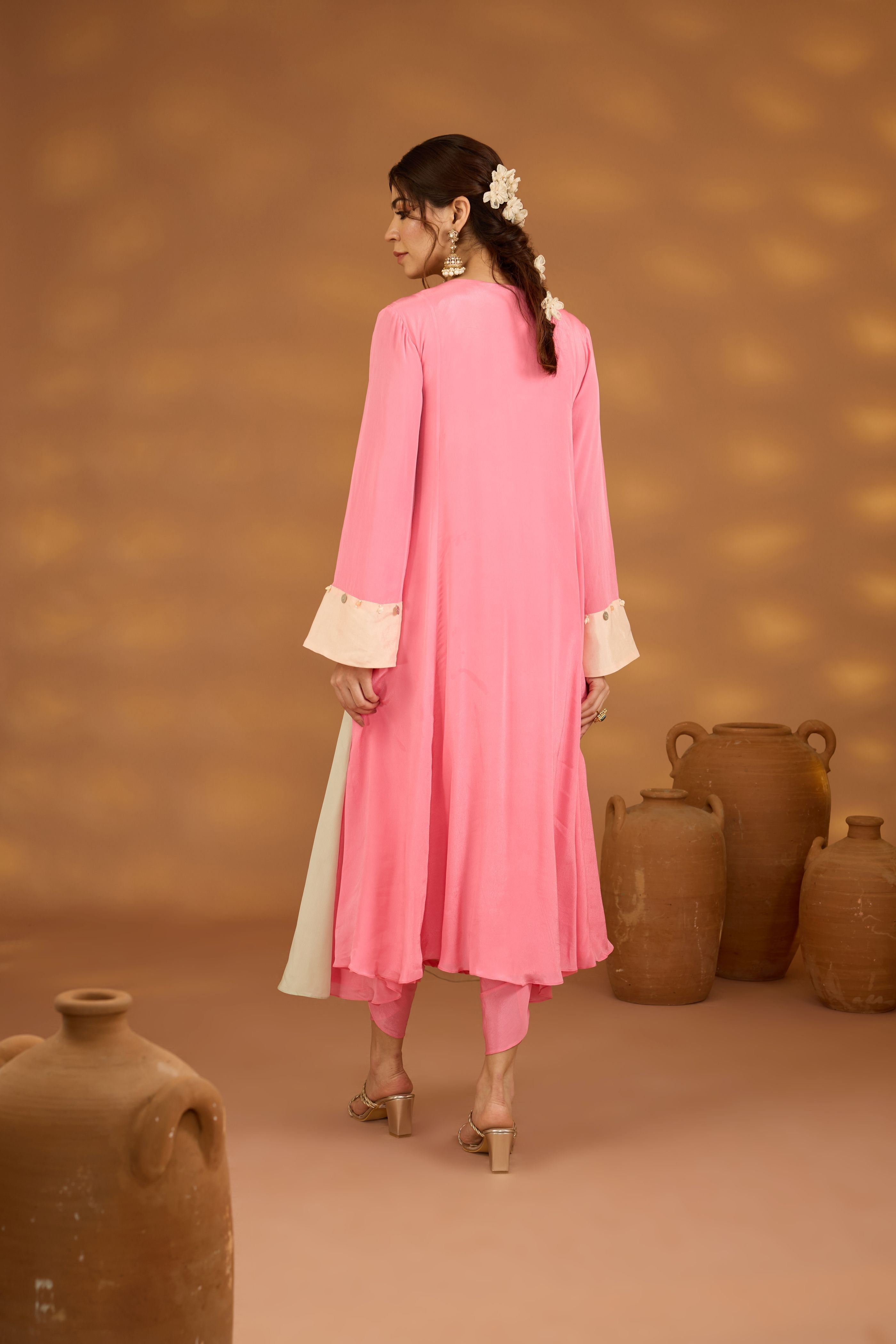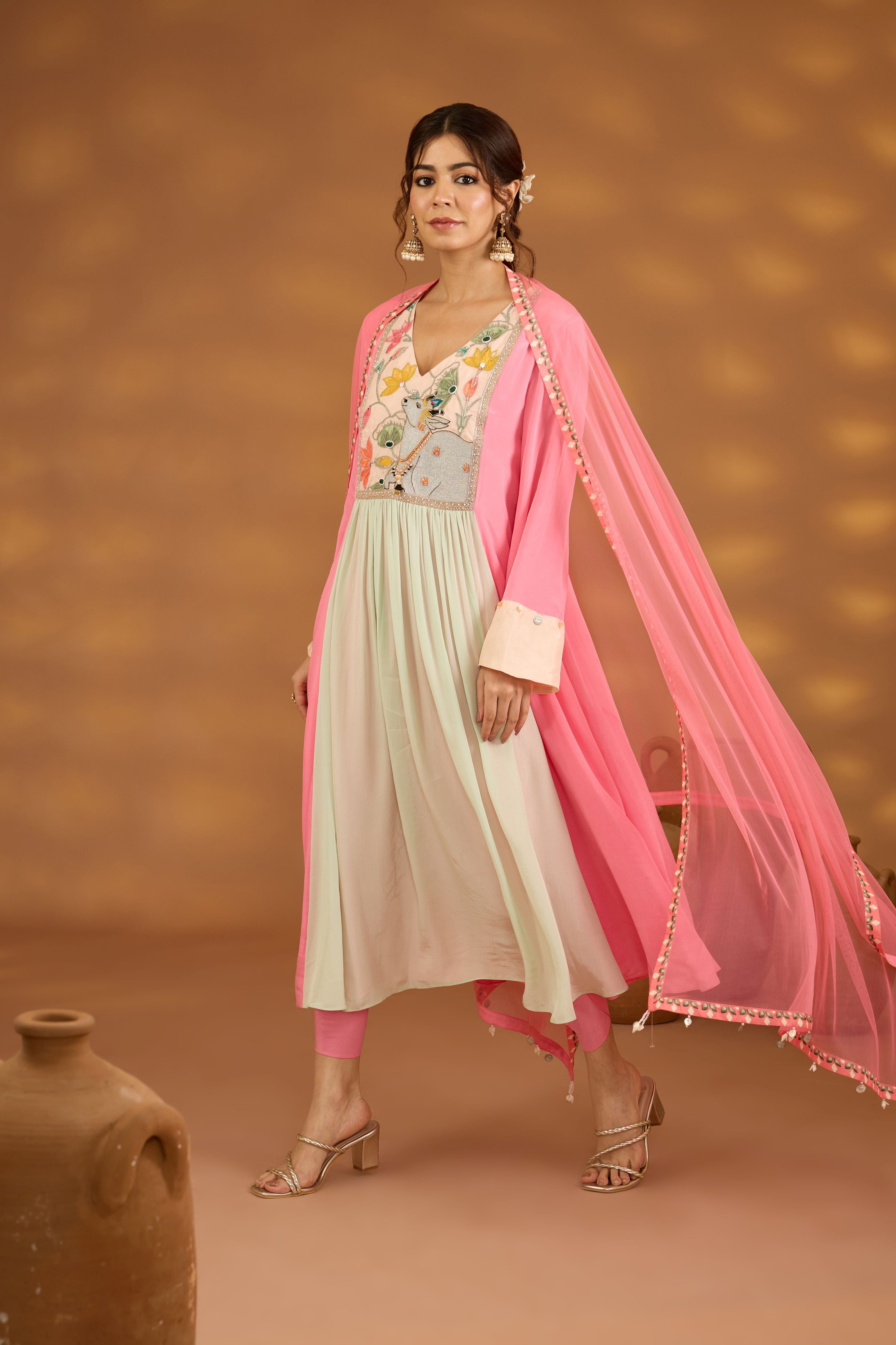 Elevate your ethnic wardrobe with this pink and aqua green color block kurta set made in crepe, featuring an intricate hand embroidered artwork of kamdhenu and Bagh made with patchwork, dori and zardozi embroidery that adds a touch of elegance. The kurta showcases a modern silhoutte, perfectly paired with comfortable crepe dhoti pants. Completed the look with matching dupatta. ideal for festive occasions or casual gatherings.