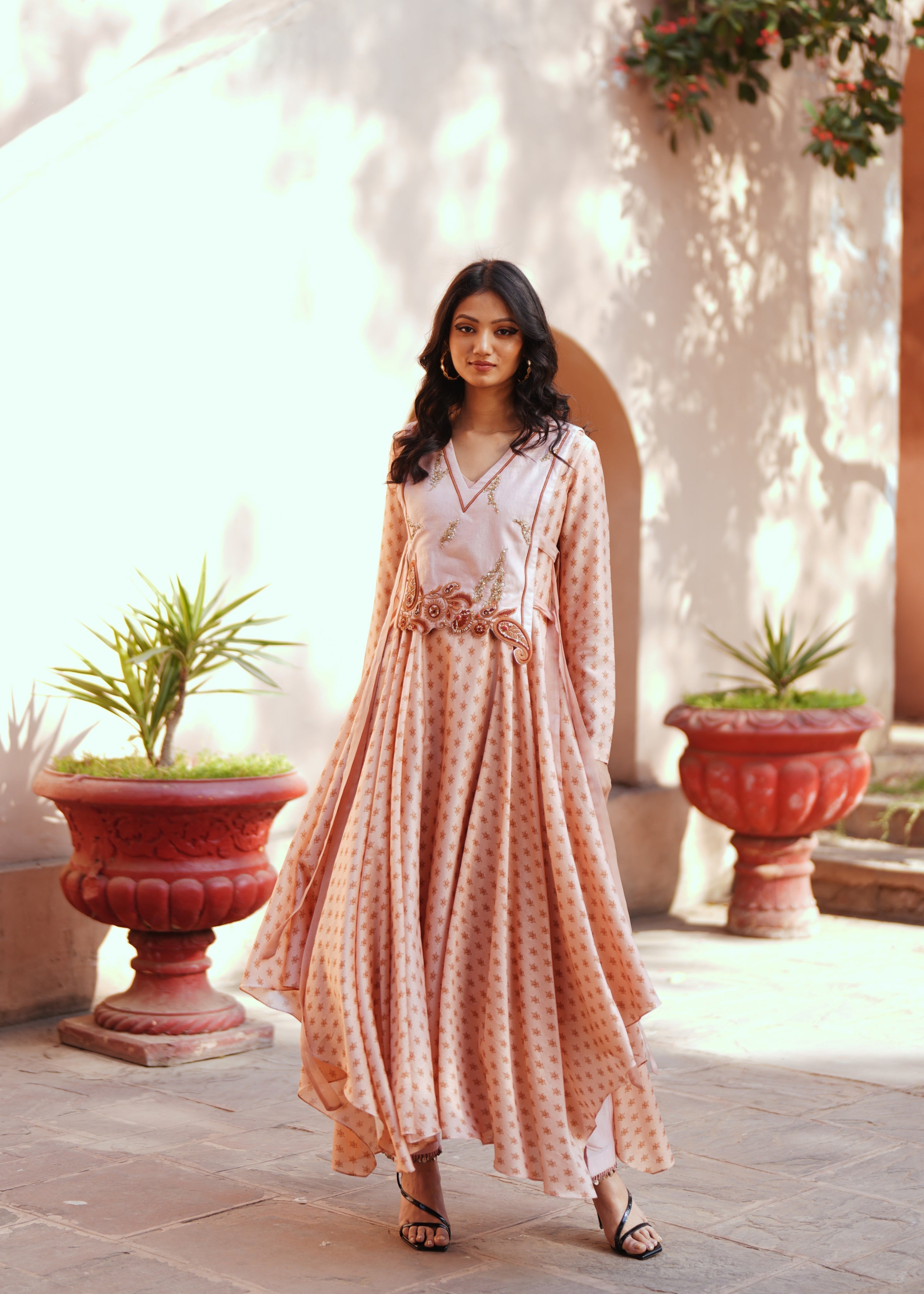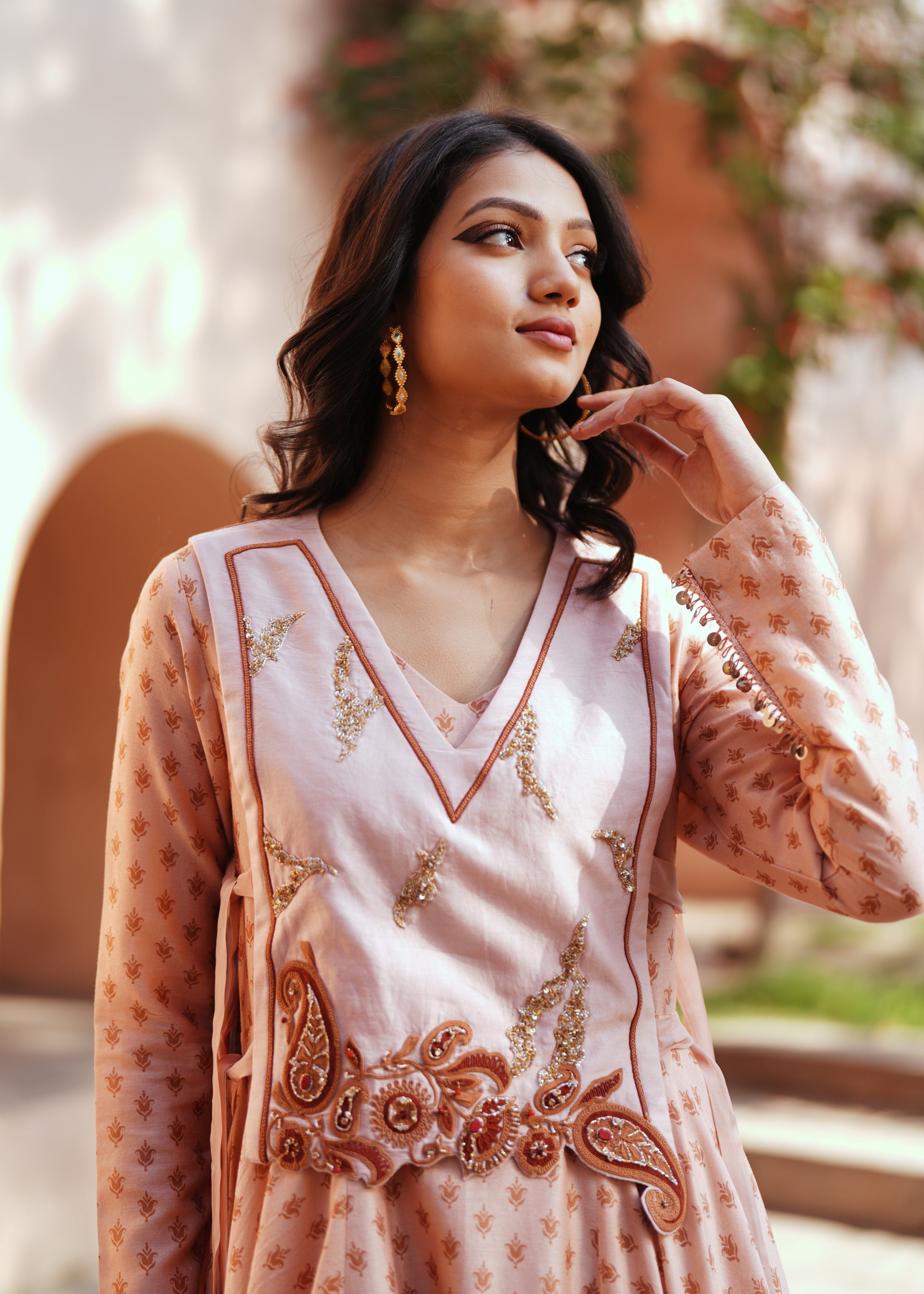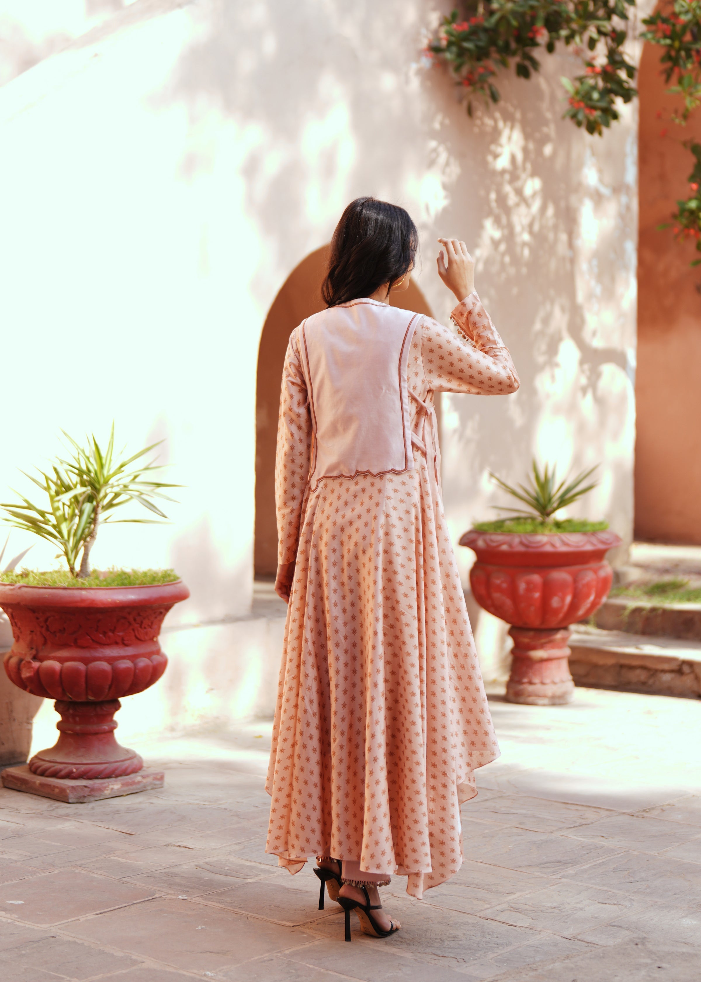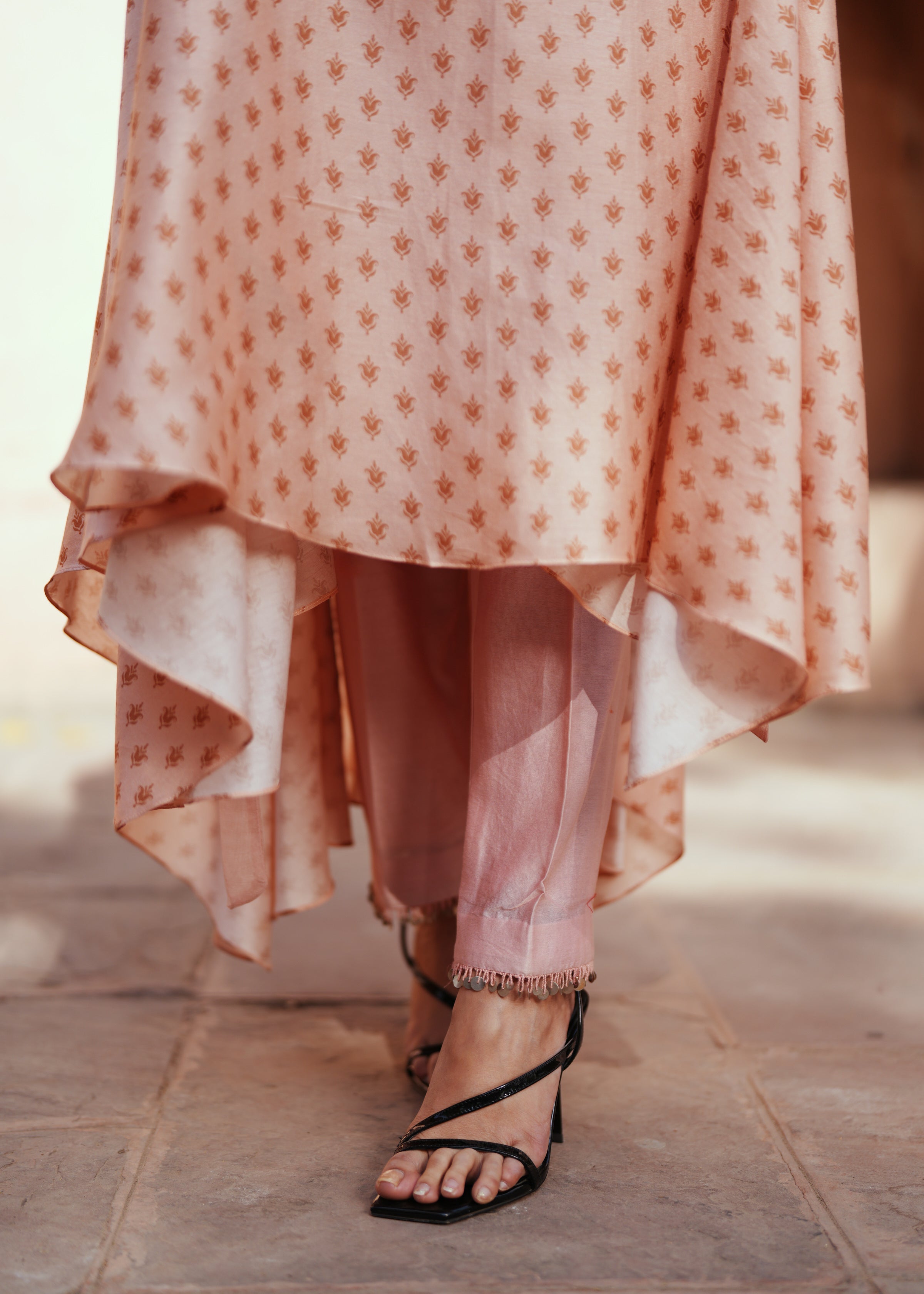 Powder pink asymmetric kurta set in luxurious Chanderi silk is designed for elevated festive and formal occasions. It’s paired with a free-size jacket featuring intricate dori and zardozi embroidery—effortlessly draped for versatile styling. Straight-fit Chanderi silk pants, finished with delicate coin lace at the hem and sleeves, add a touch of playful elegance—perfect for evening soirées, intimate celebrations, or cultural gatherings.