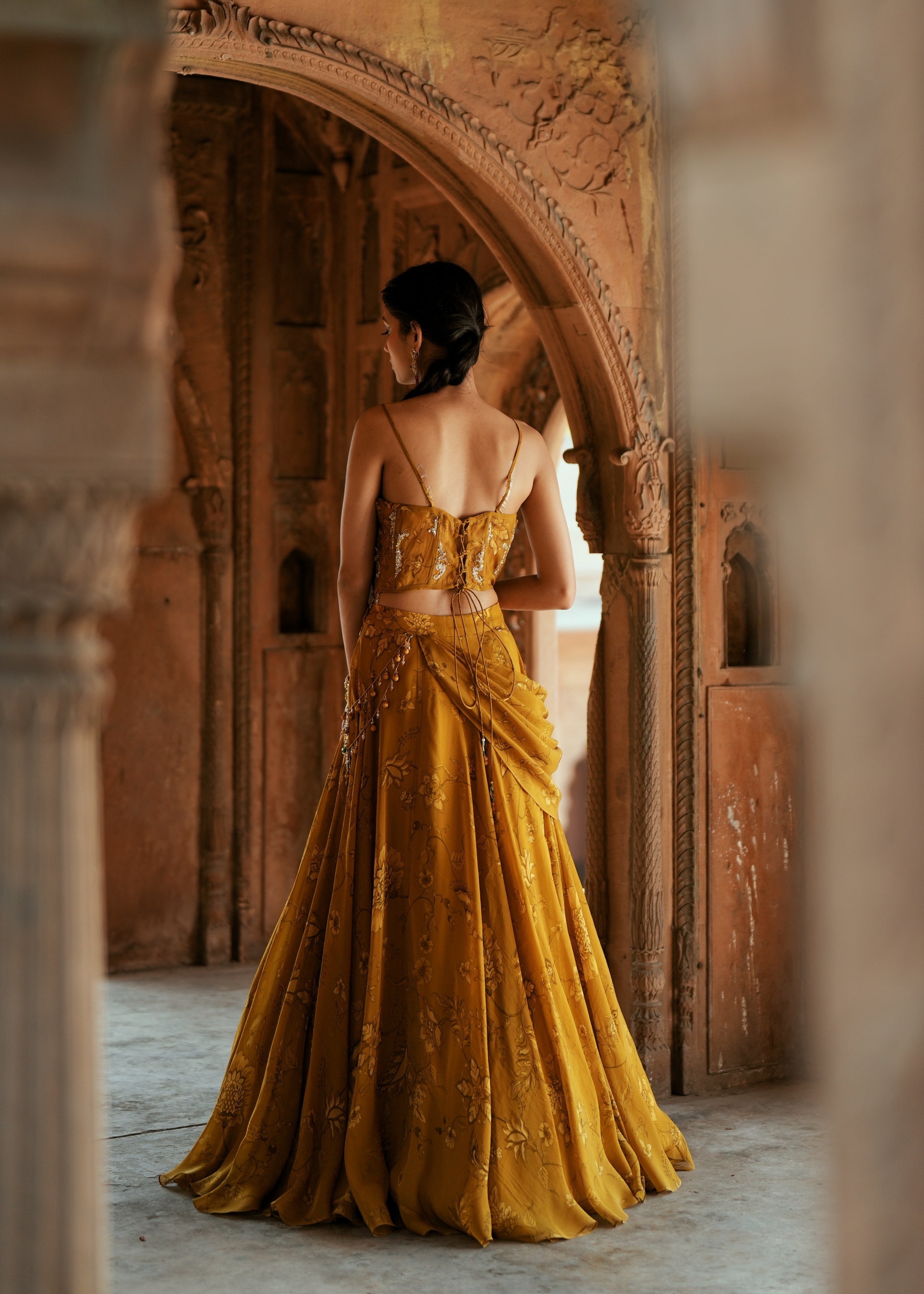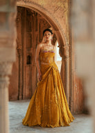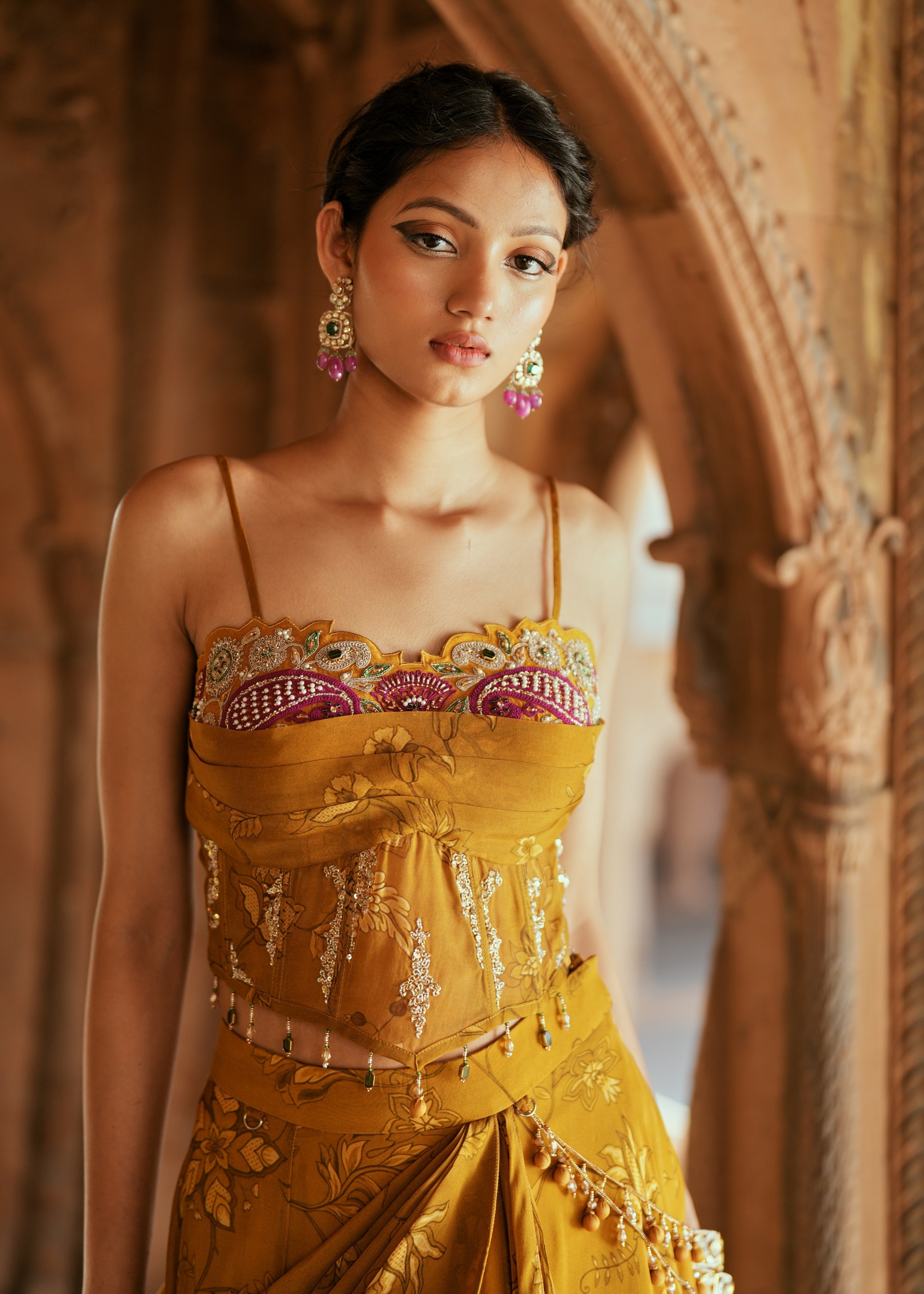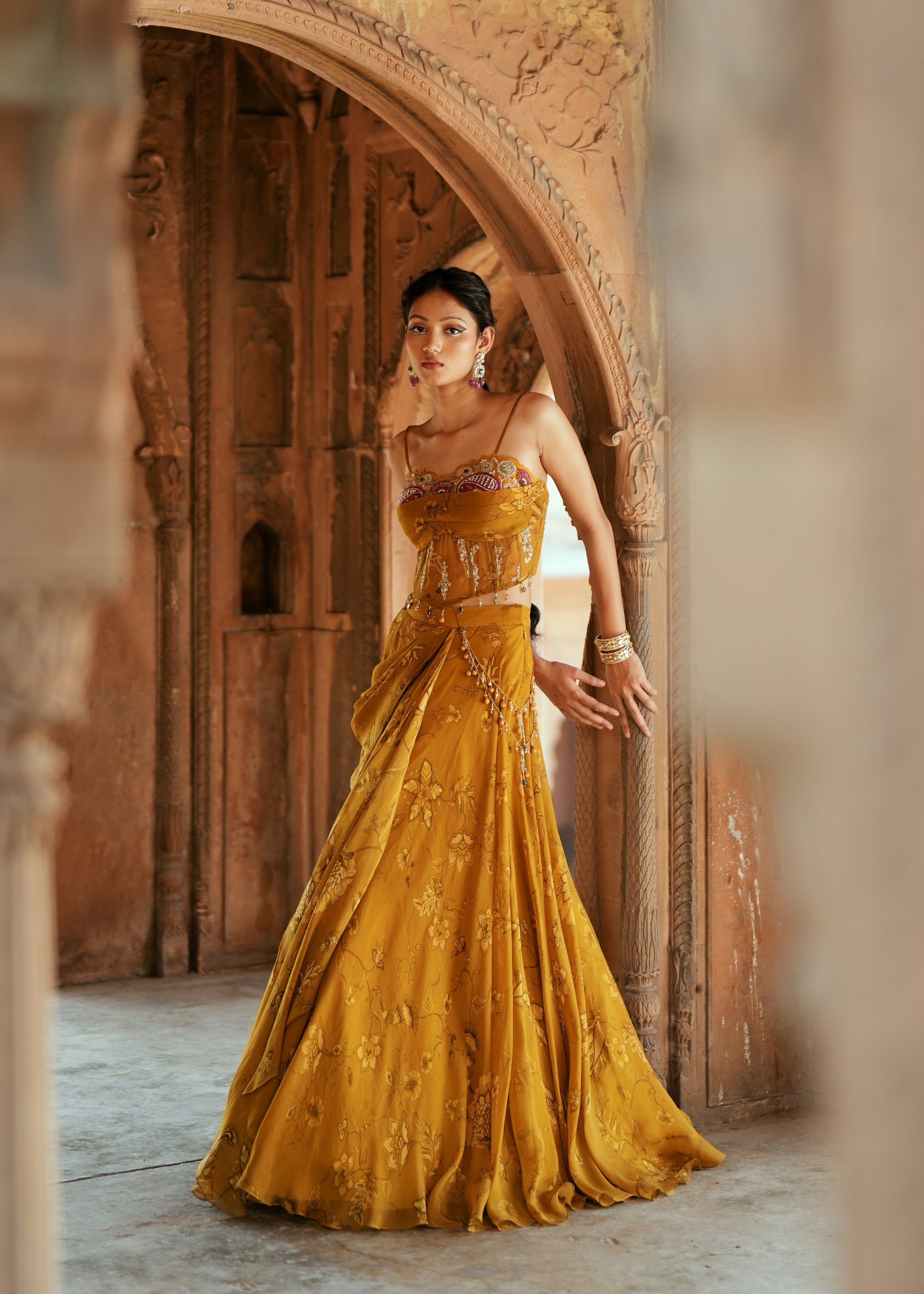 Elevate your festive wardrobe with this opulent lehenga set featuring a gold floral printed organza base accented with delicate Dori and zardozi embroidery, paired with a sculpted draped corset top. Completed with an intricately embroidered organza dupatta and a charming kamarbund. it’s designed for standout celebrations—from Haldi, Mehendi, sangeet, and engagements to carnival festivities. A perfect blend of tradition and modern glamour for the contemporary bride and fashion-forward occasion wear.