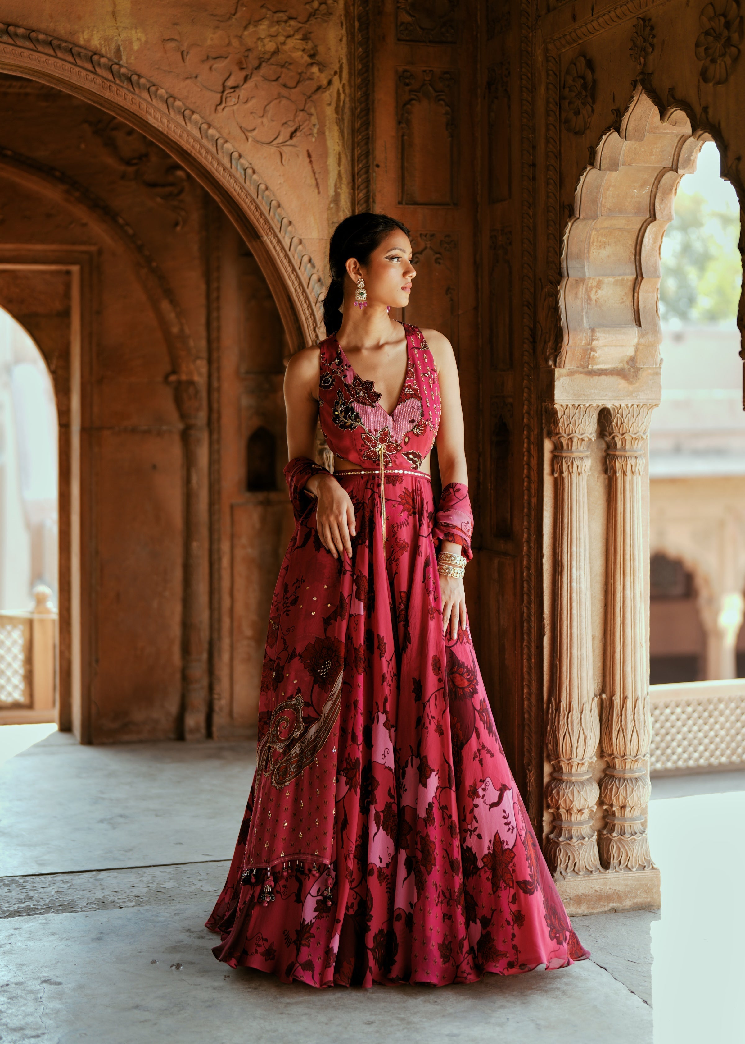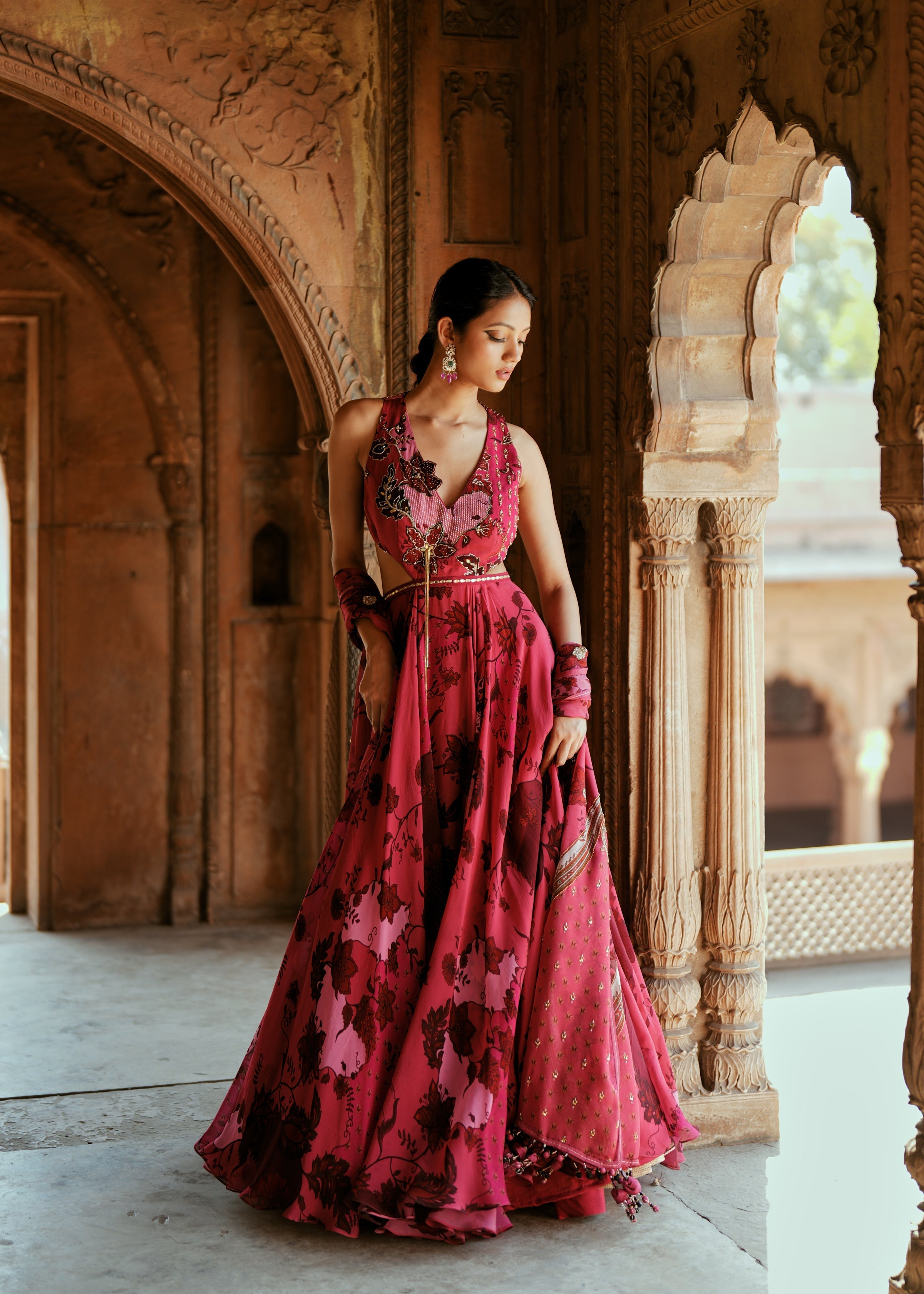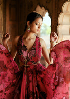 A dreamy floral Anarkali in printed organza, hand-embroidered with zardozi and 3D embellishments. Paired with a delicately embroidered organza dupatta, it’s perfect for Indian wedding functions like haldi, sangeet, or engagement. An elegant pick for the modern bride or bridesmaid seeking statement occasion wear.