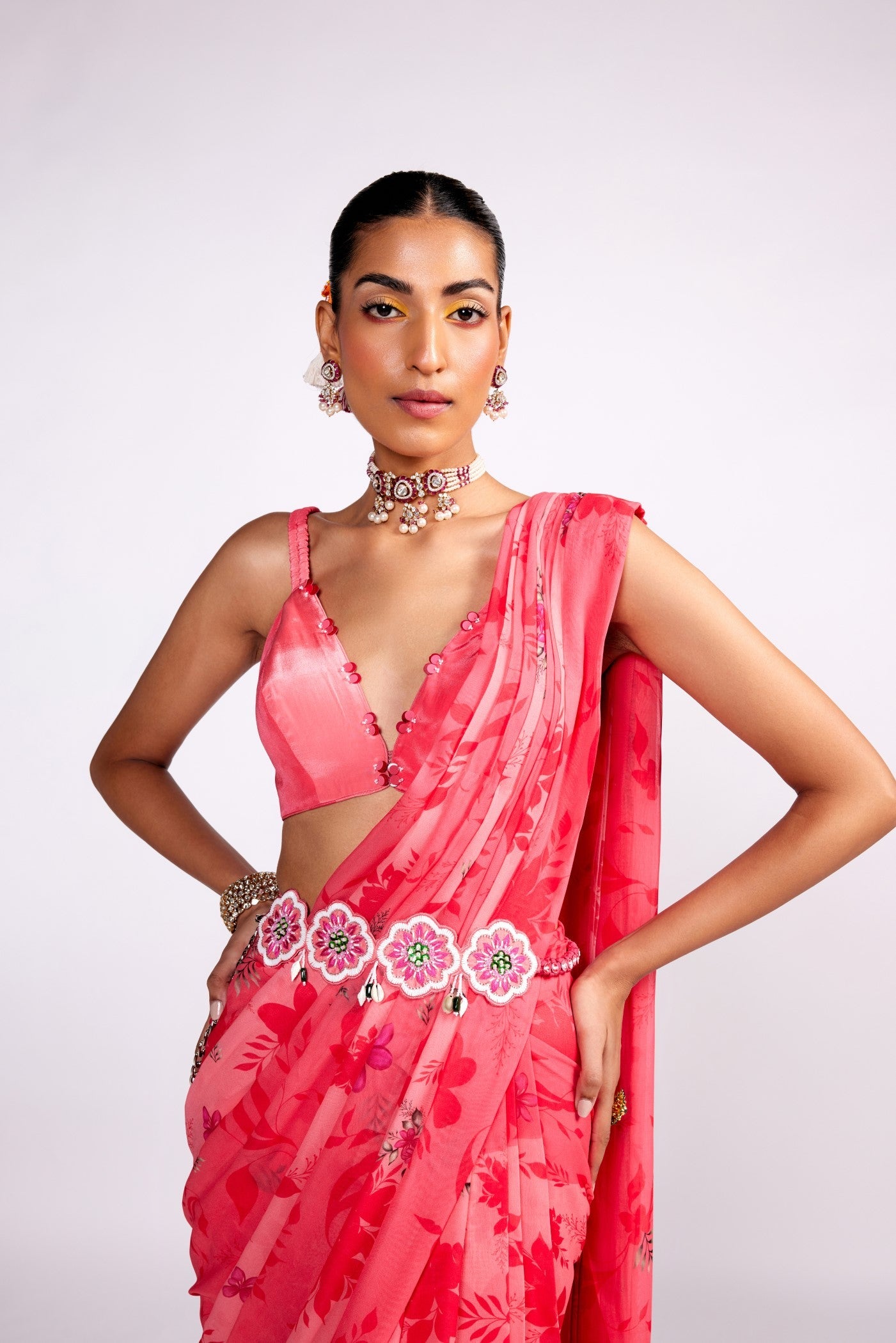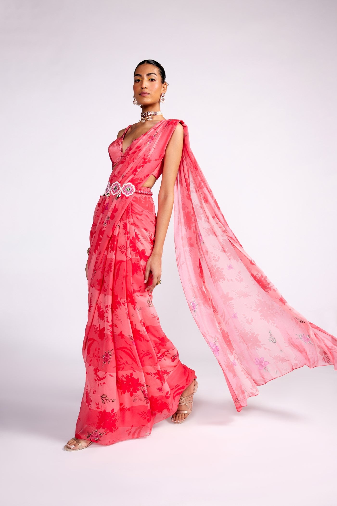 Featured here is pink printed pre draped saree made in chiffon. it is paired with and embellished blouse and jewel encrusted belt