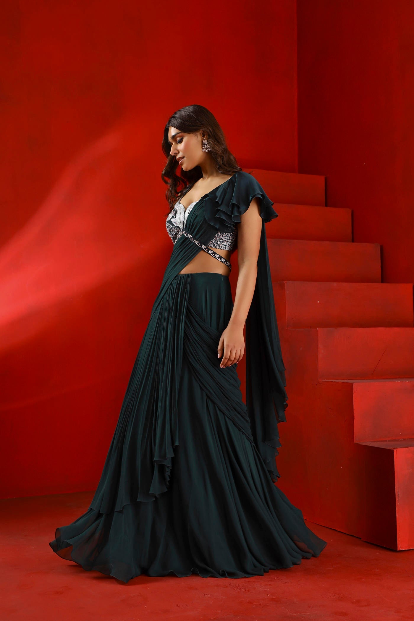 Kriti Kharbanda in Aqua green embroidered lehenga saree set