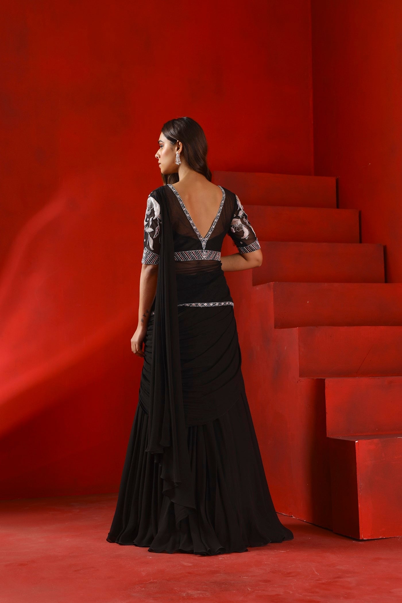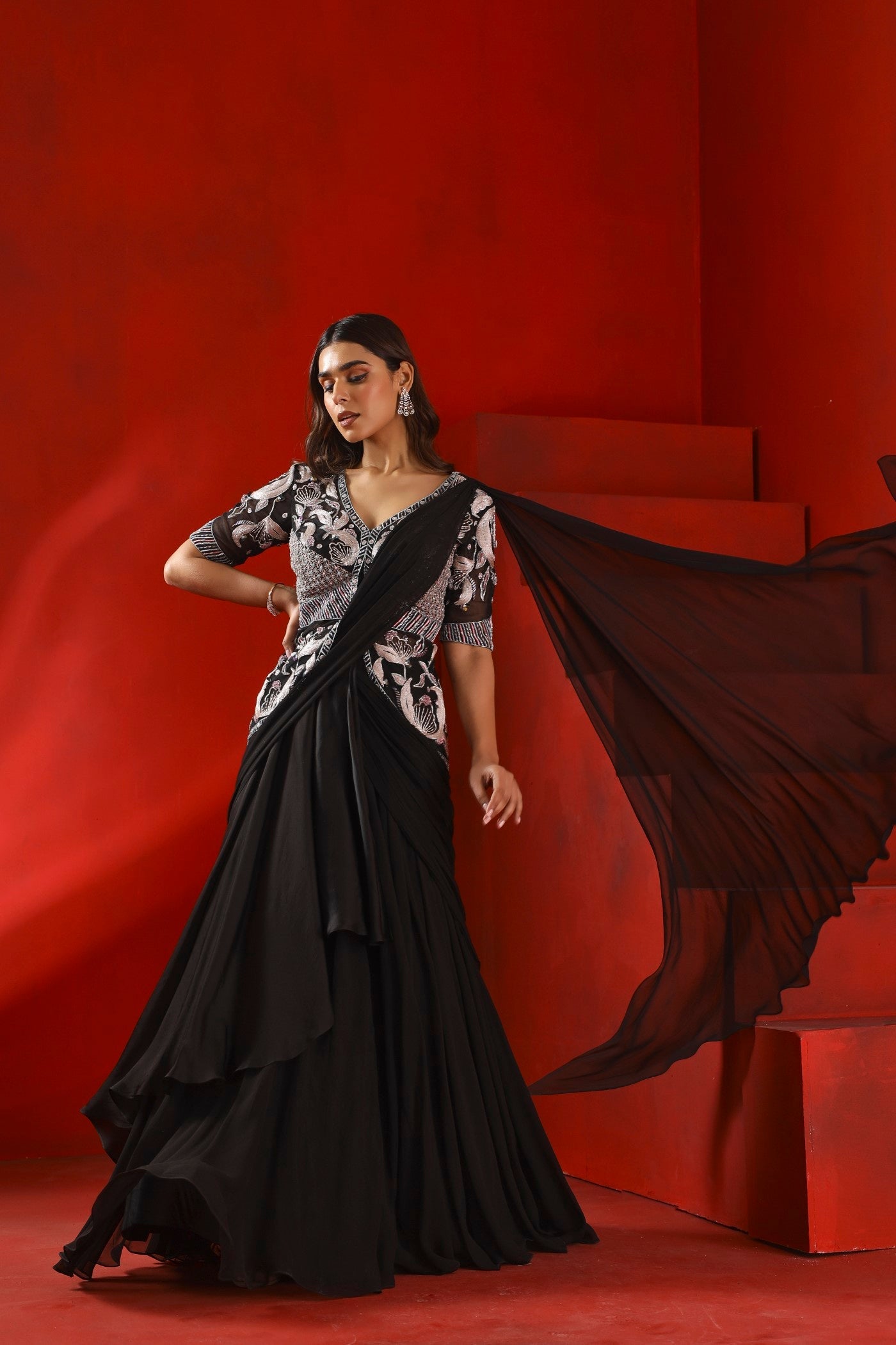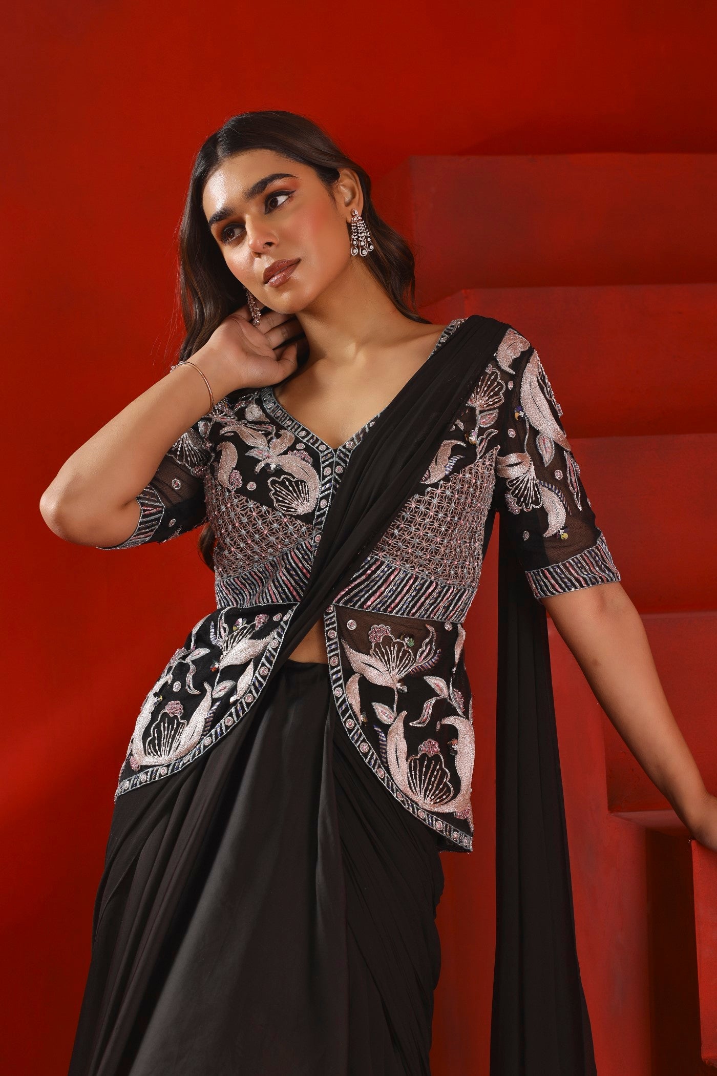 Featured here is a black magnolia embroidered jacket made in net. It is intricately embellished with zardozi, pitta and pearl work. The set includes a multi-layered drape saree made in georgette and satin organza.
