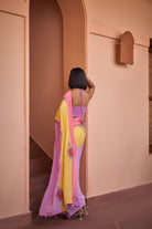 Featuring a Color block saree made in crepe. It features 3D embroidered floral bootas paired with an embroidered halter blouse to complete the look.