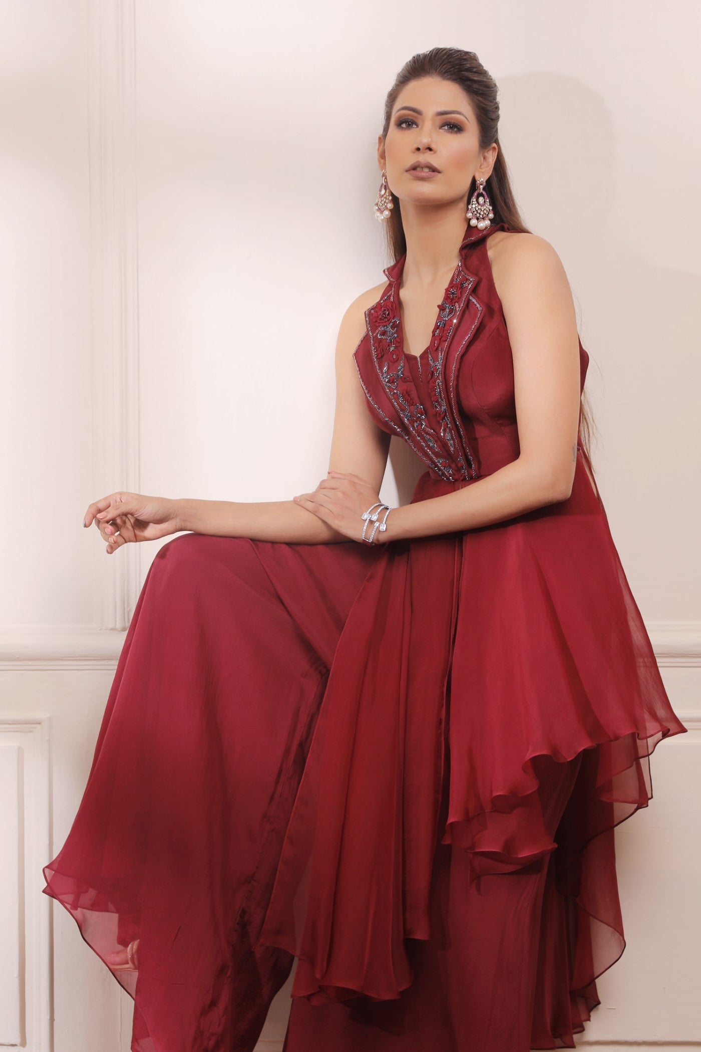 Ruby red asymmetric kurta with flared organza pants