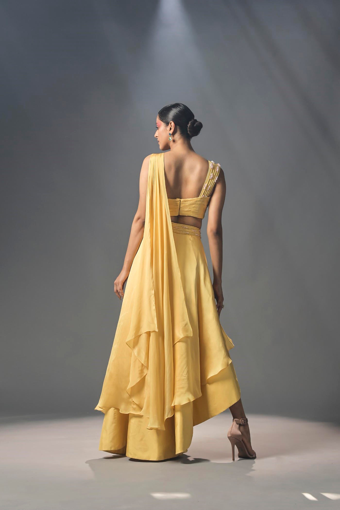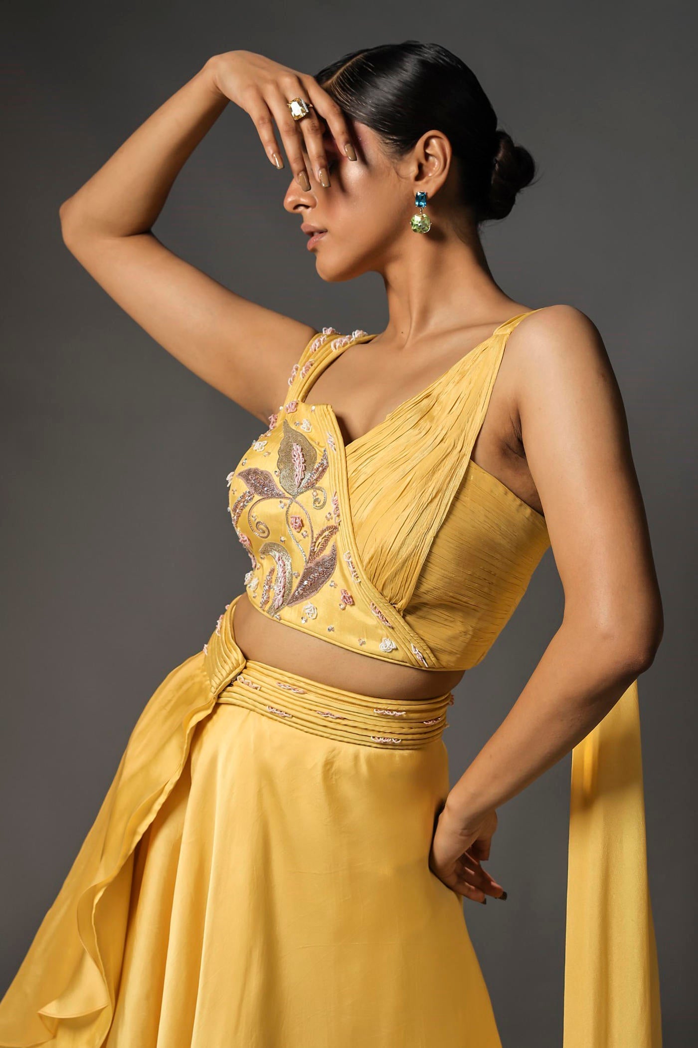 Featured here is daffodil wrap around skirt made in organza with cord embellished belt. It is paired with embroidered top and an attached drape dupatta.