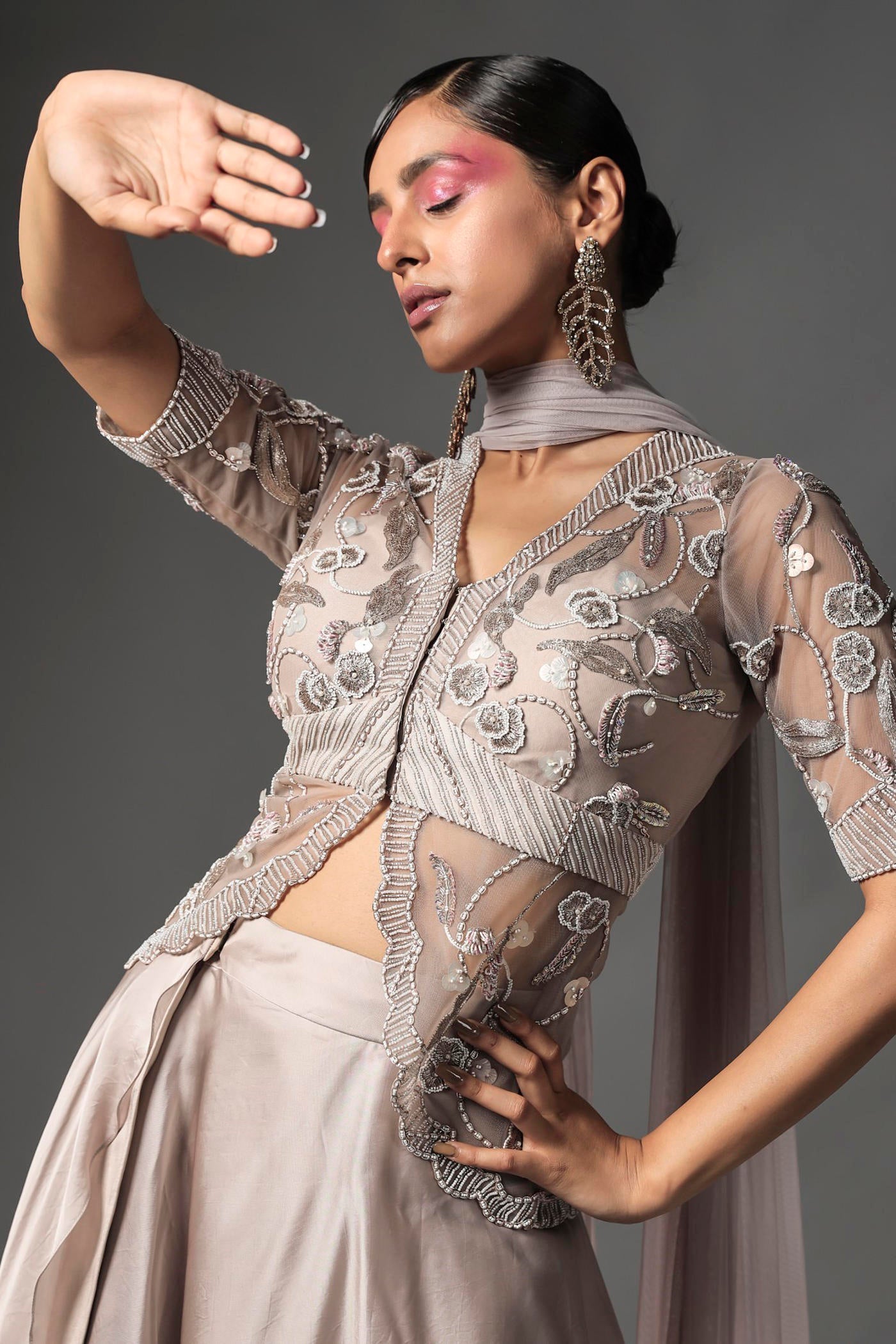 Featured here is ecru double layered organza wrap around skirt with high low hem. It is paired with an embroidered jacket and soft tulle dupatta