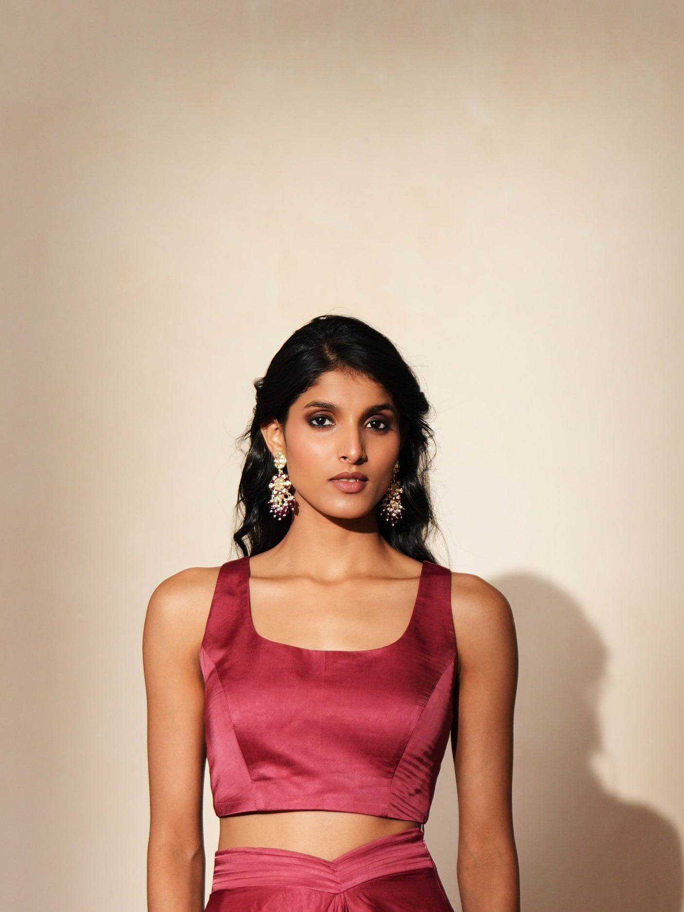"Glowing in the jeweled radiance of Itr, this 3-piece set celebrates the artistry of Indian handwork in a modern silhouette. The organza shirt, embroidered in a jewelled motif theme with patchwork, dori-marodi, zardozi, and stone embellishments, is finished with 3D cutwork and handmade tassels that add a touch of regal drama. Paired with a structured bustier, the look balances heritage opulence with effortless femininity.