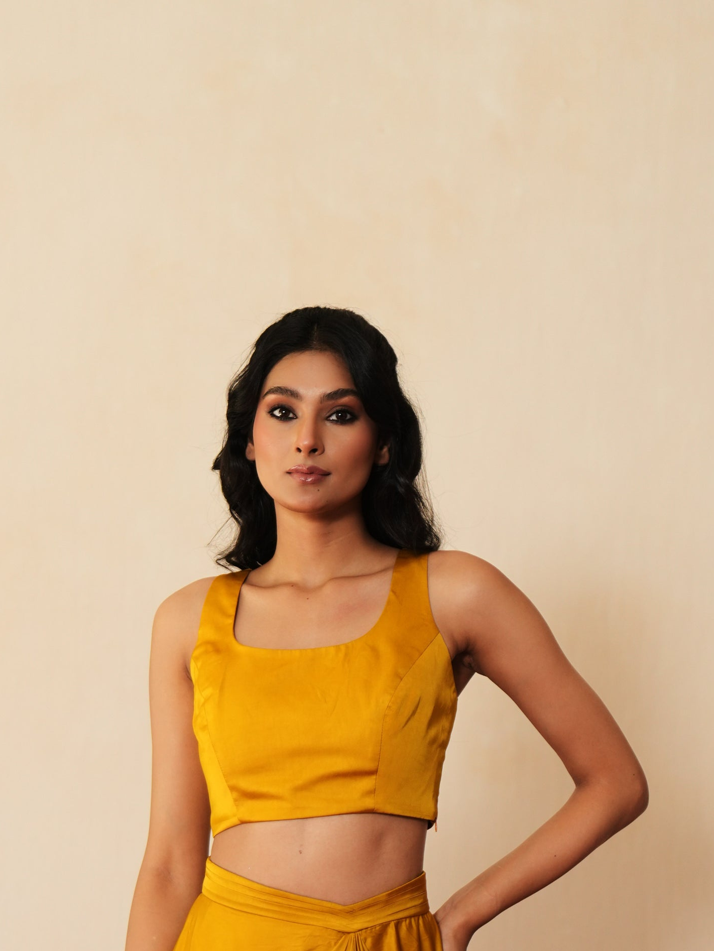 Bathed in the golden glow of Kanakapriya, this 3-piece ensemble celebrates the poetry of Indian craftsmanship. The satin organza top is adorned with intricate dori marodi, resham and zardozi embroidery with 3D cutwork, paired with a fluid satin structured bustier. A free-size handcrafted belt tie with tassel adds contemporary drama to this modern heirloom.