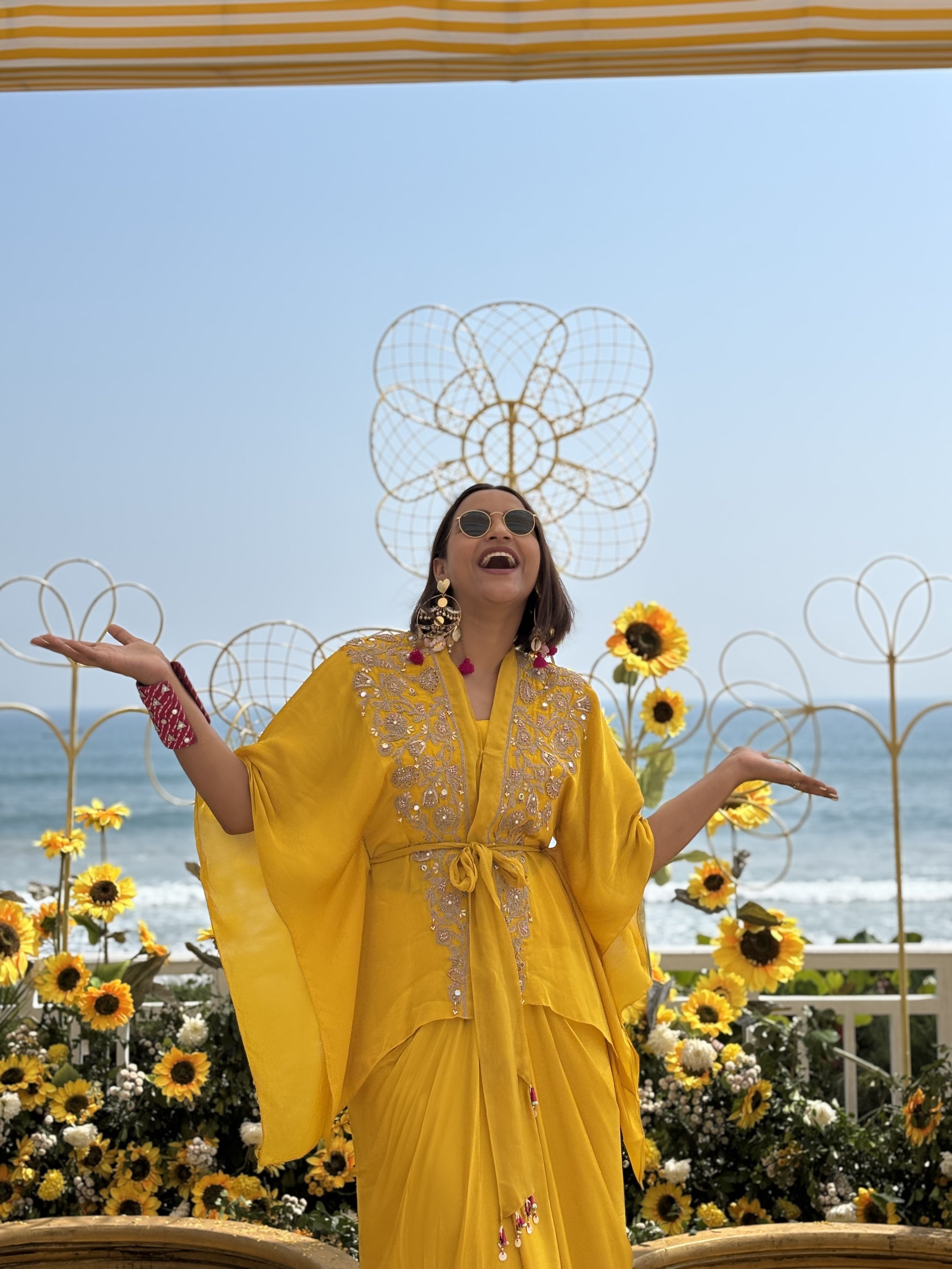 Mit einem fließenden Kaftan-Oberteil in Einheitsgröße aus Satin-Organza, bestickt mit Tilla-Arbeit, Perlen, Gota-Arbeit und Messingperlen.