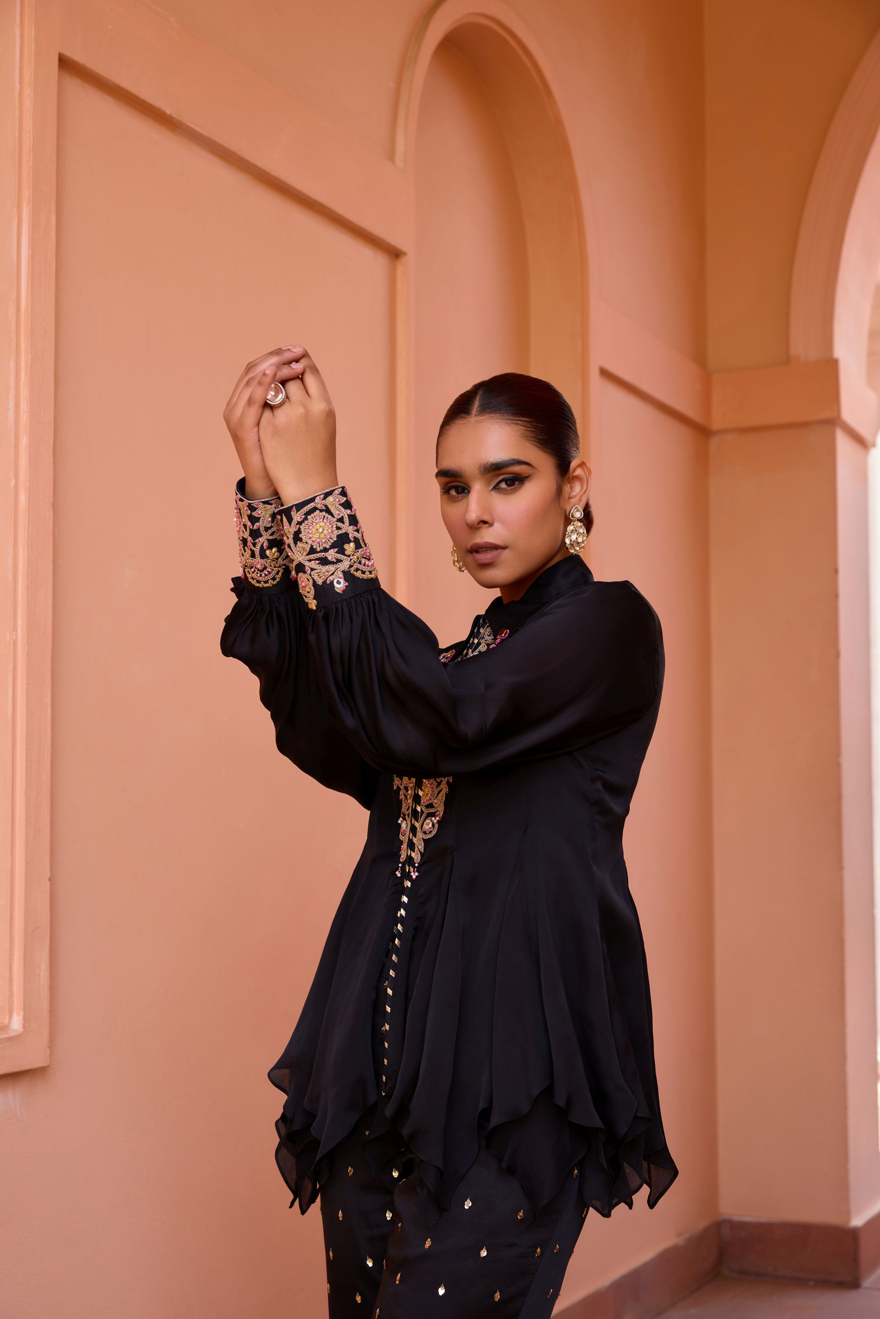 Mit einem Oberteil aus Satinorganza, bestickt mit aufwendigen Dori-Marodi-, Gota- und Messingperlen. Werten Sie Ihre Garderobe mit diesem vielseitigen Einzelstück auf.