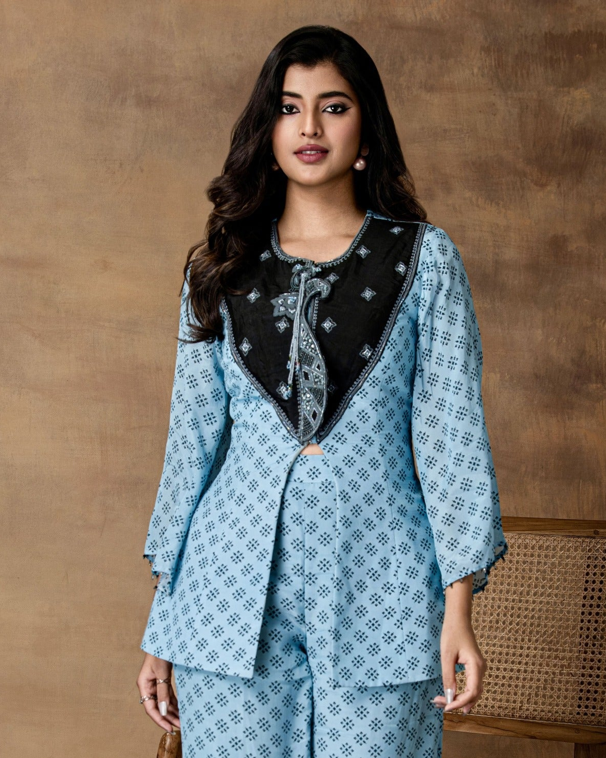 JASHN POWDER BLUE CREPE PEPLUM CO-ORD SET