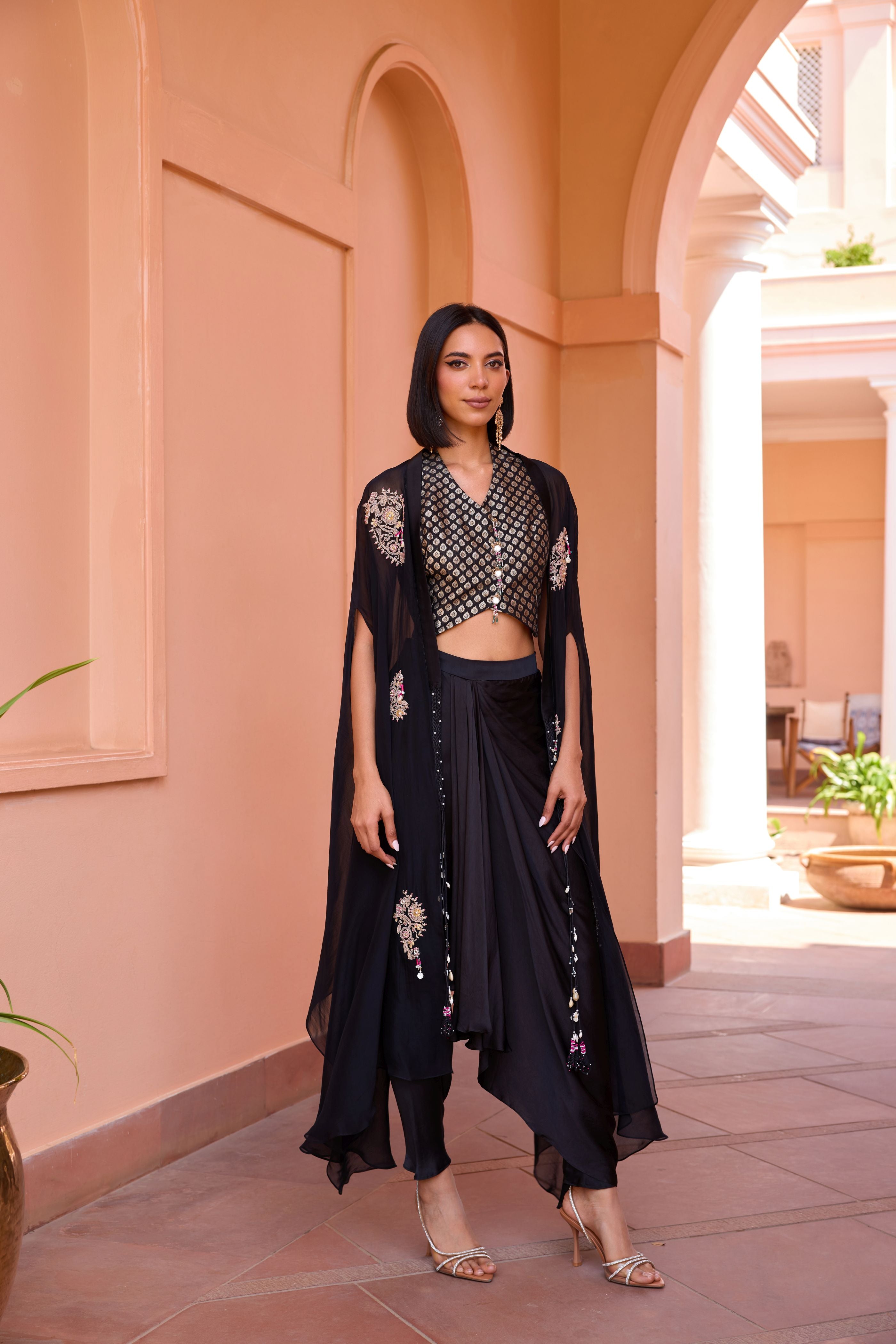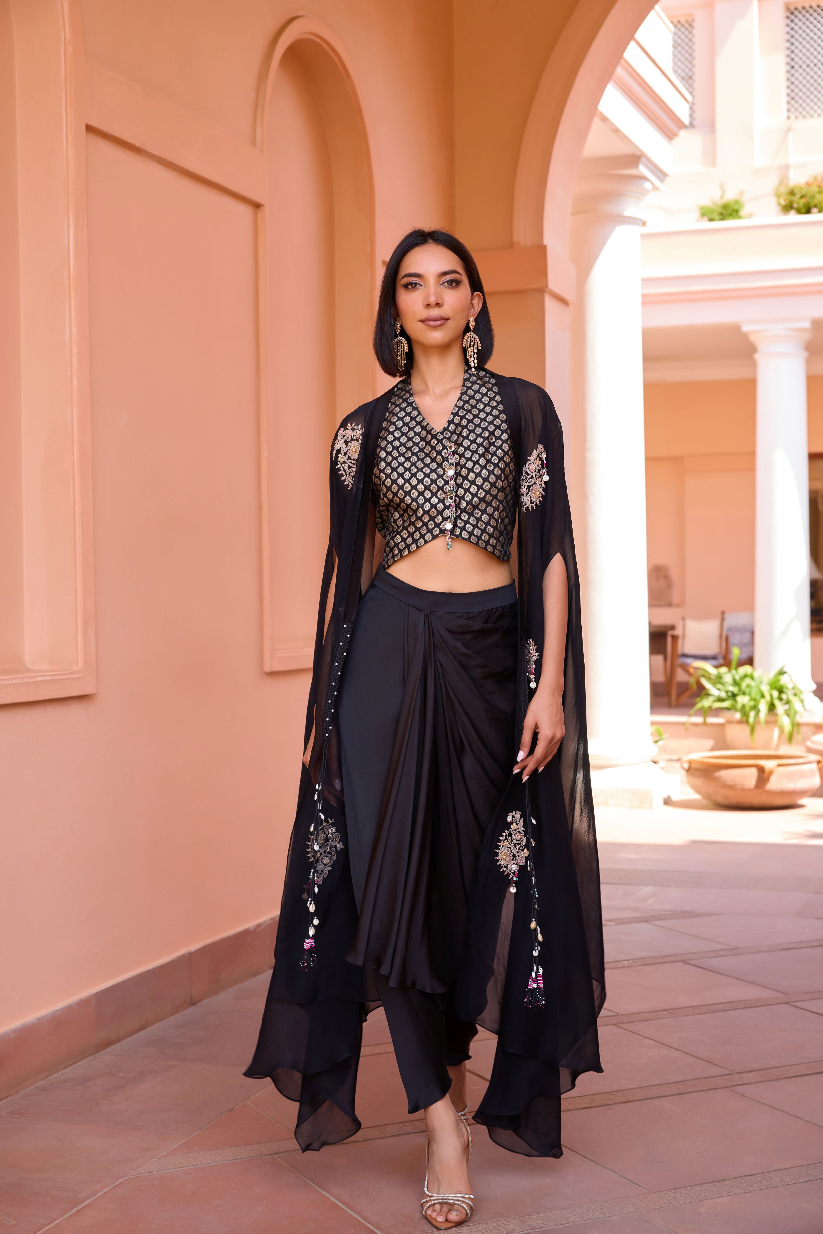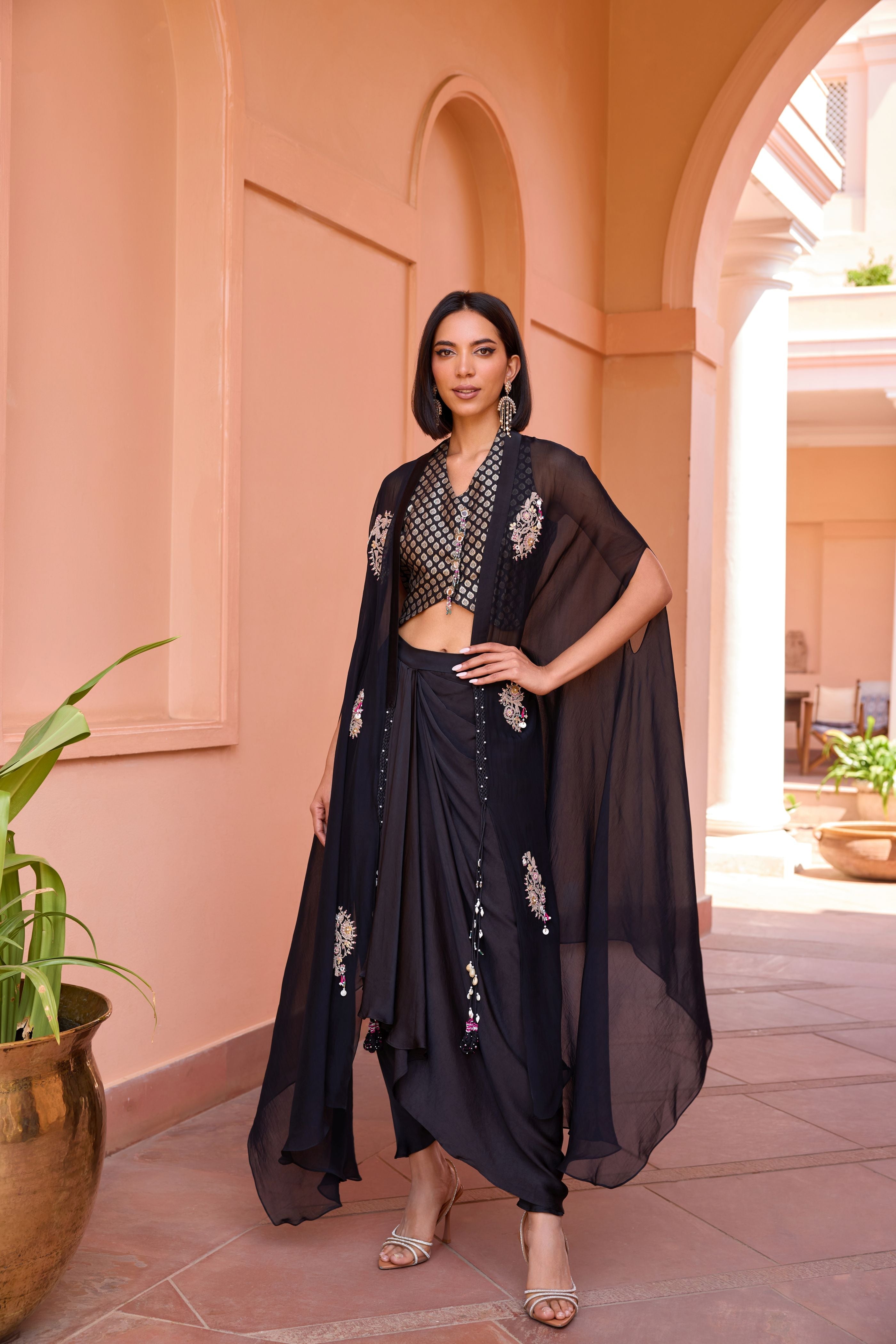 Mit einer bezaubernden Drape-Hose und einem bestickten Cape-Set von Dori Marodi mit einer maßgeschneiderten Chanderi-Jacquard-Weste. Definieren Sie Eleganz neu mit diesem vielseitigen dreiteiligen Drape-Set.