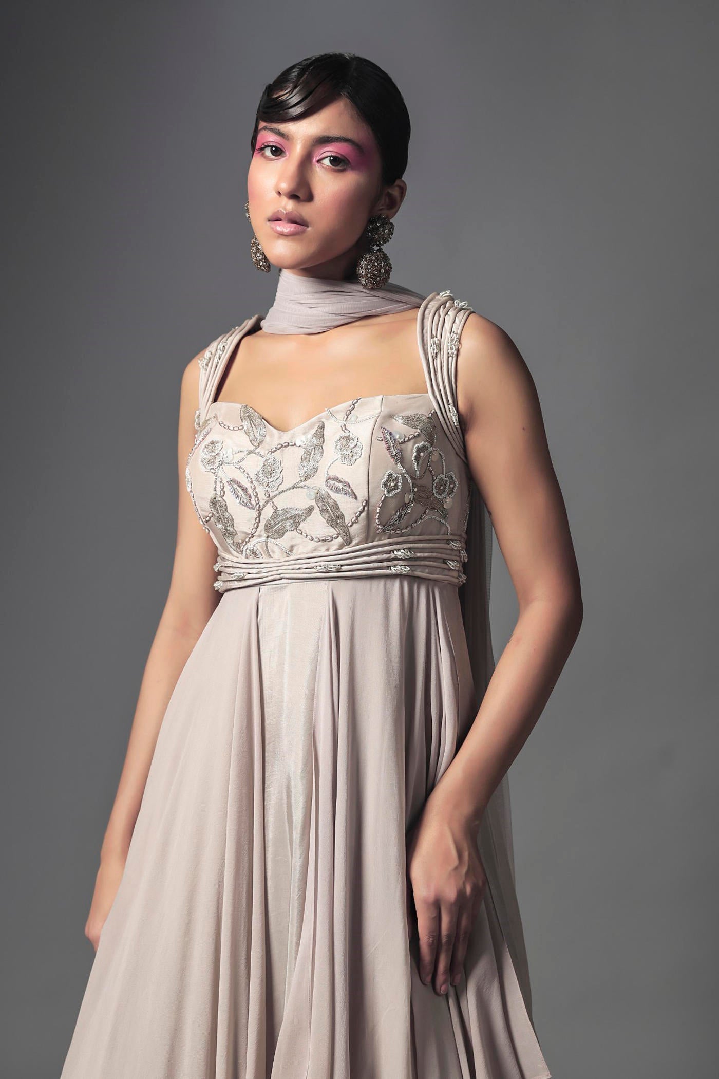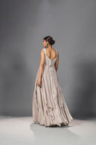 Hier ist ein aufwendig besticktes ecrufarbenes Anarkali-Kleid mit asymmetrischen Einsätzen zu sehen, die für zusätzlichen Flair sorgen. Dazu passt ein bestickter Dupatta aus weichem Tüll. Besonders hervorzuheben sind die handgenähten Kordeldetails mit Perlen und Muscheln, die die Eleganz unterstreichen.
