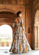 Ein Statement-Stück aus grau bedrucktem Organza, anmutig geschmückt mit traditioneller Dori-Stickerei und 3D-Verzierungen. Ideal für indische Hochzeiten und festliche Anlässe. Zusammen mit einem passenden, mit Organza bestickten Dupatta ist es die perfekte Wahl für Verlobungen, Sangeets und Haldi-Feiern.