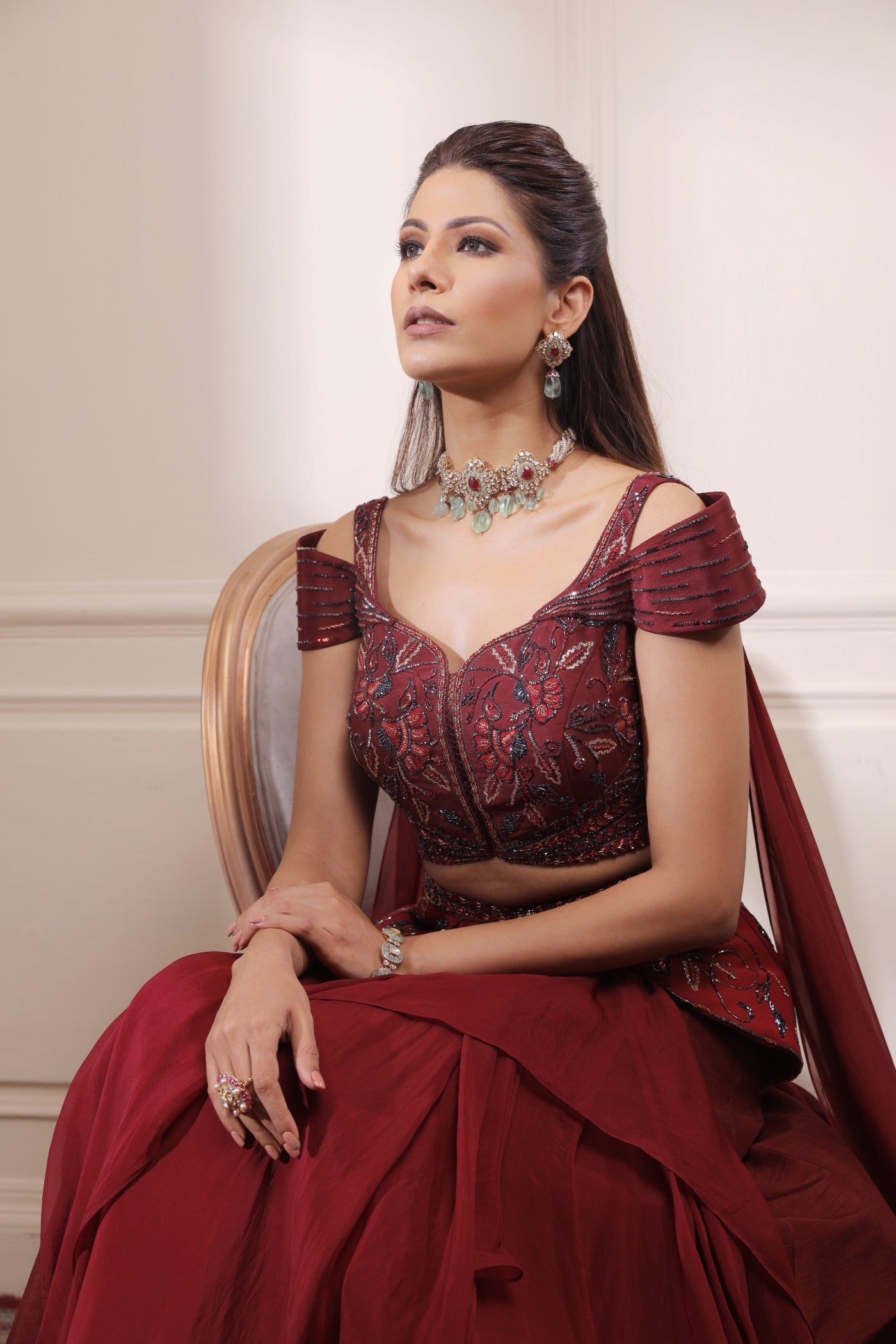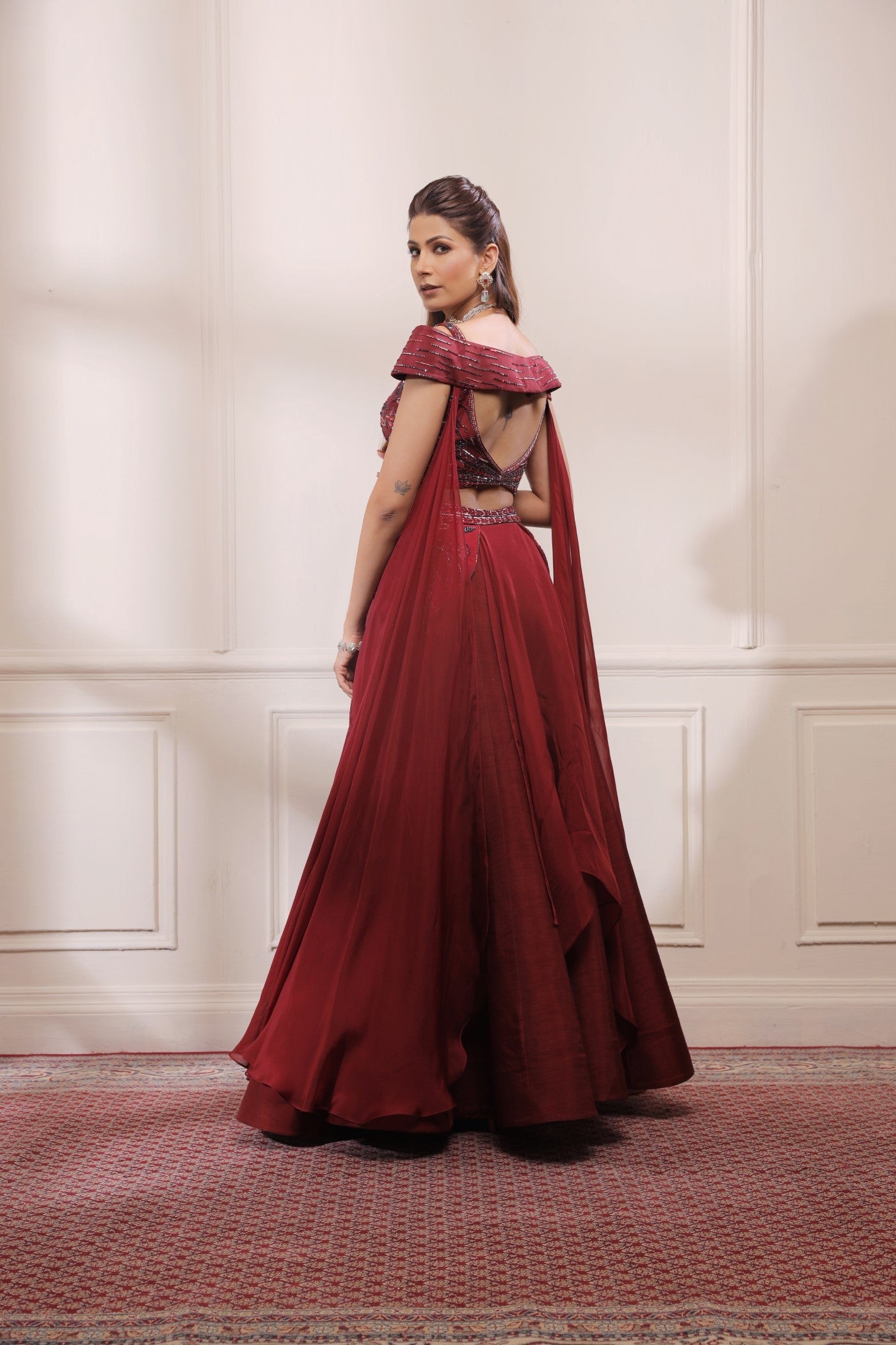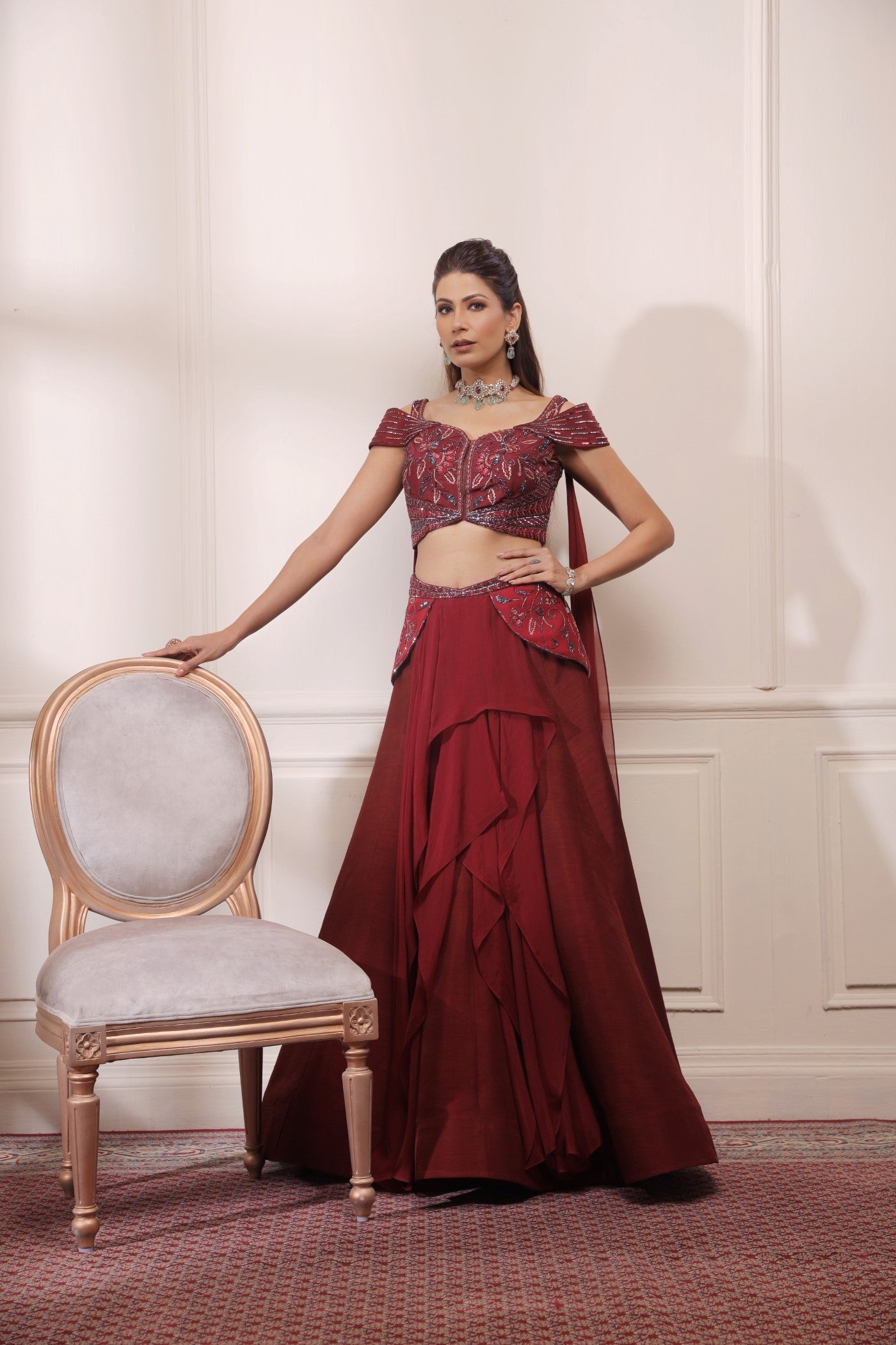 Die aufwendig handbestickte Bluse aus Rohseide wird mit einem an der Taille verzierten Rohseiden-Lehenga kombiniert. Der Lehenga hat asymmetrische Organza-Schichten und einen geflügelten Dupatta, der an der Bluse befestigt ist.