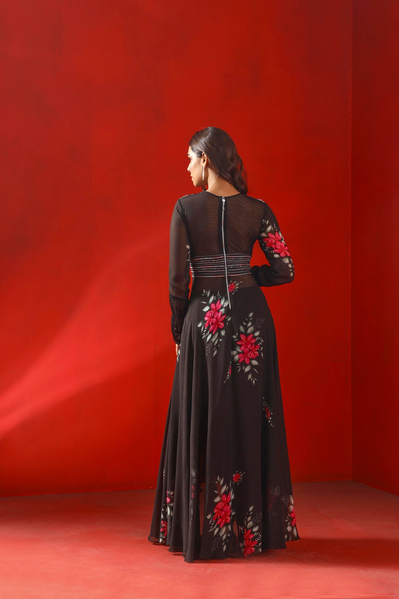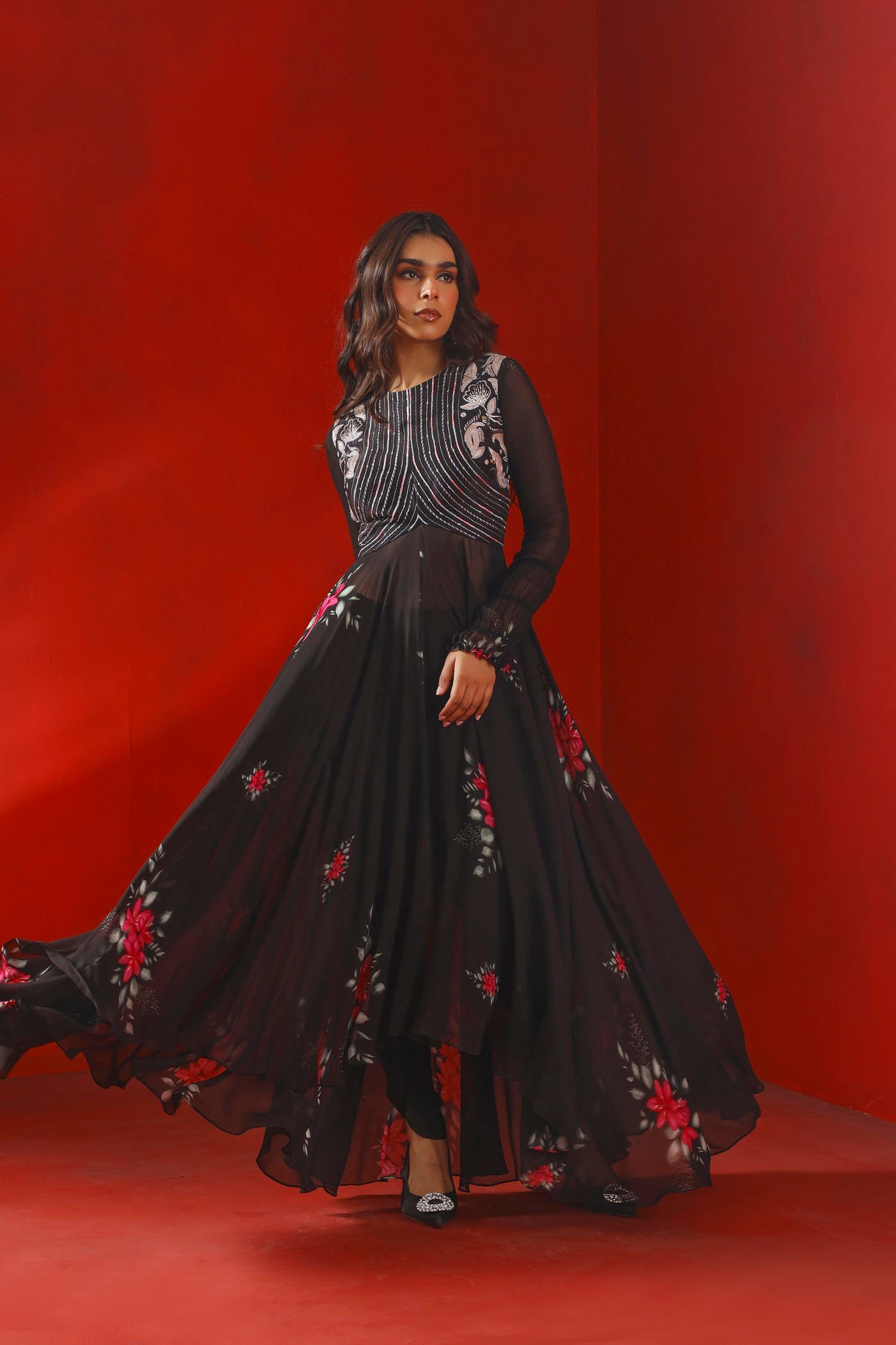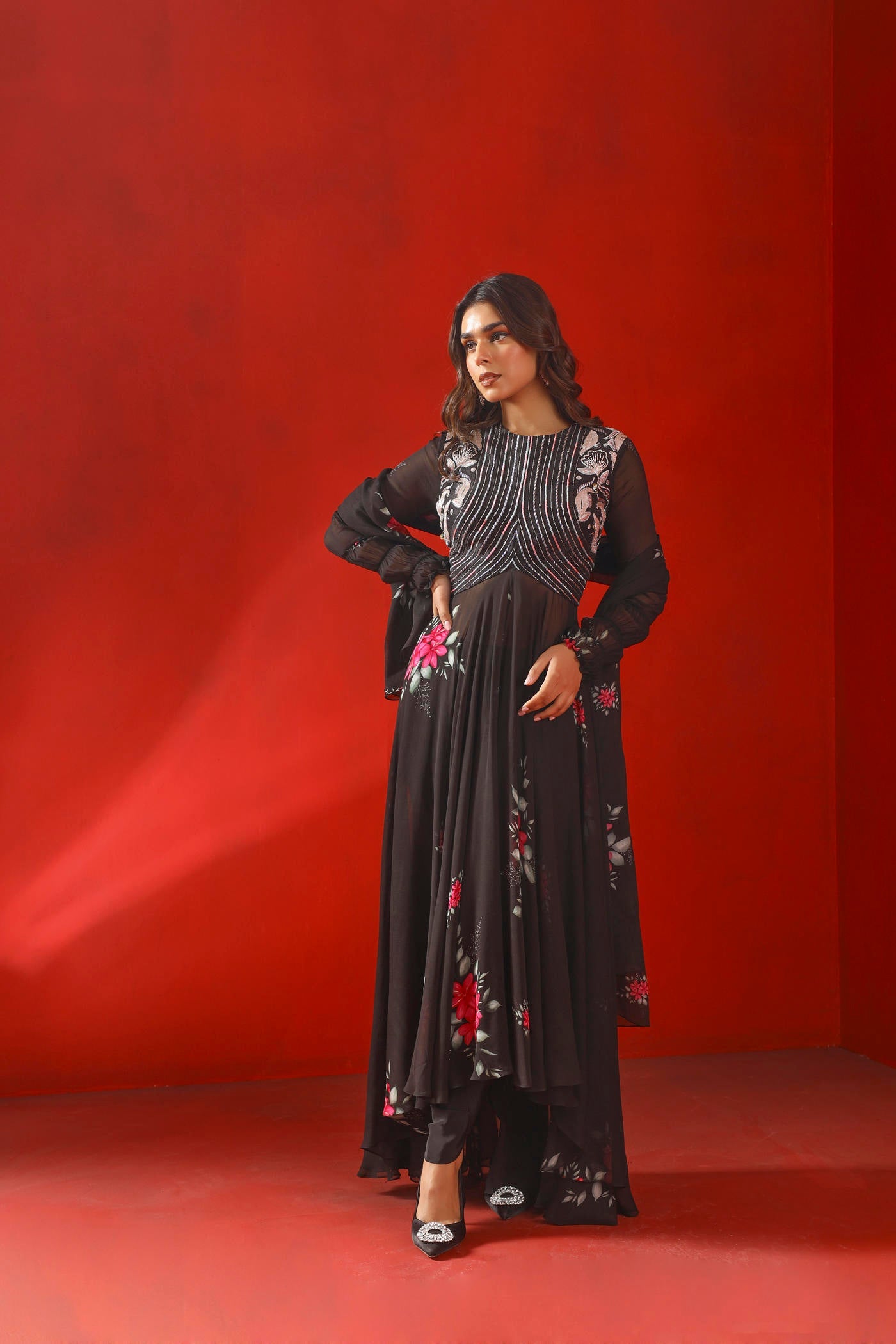 Hier ist ein Kurta-Set mit asymmetrischem Saum und schwarzem Magnolien-Print aus Georgette mit bestickter Passe zu sehen, gepaart mit einem Georgette-Dupatta und Tulpenhosen aus Krepp.